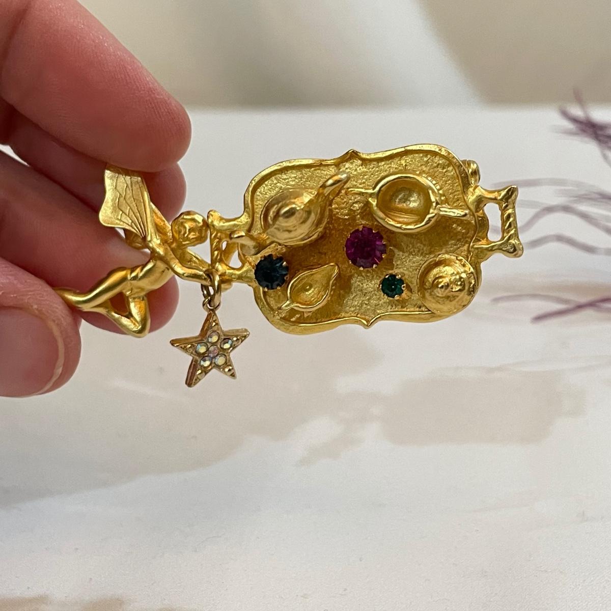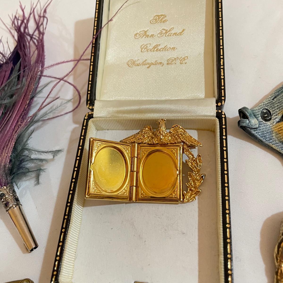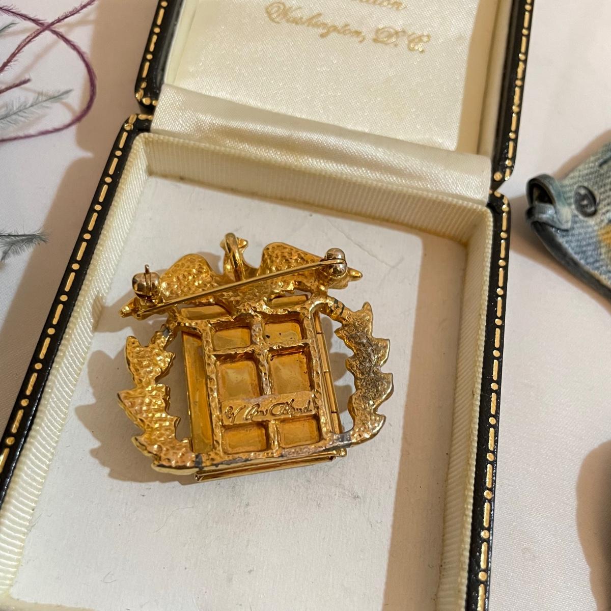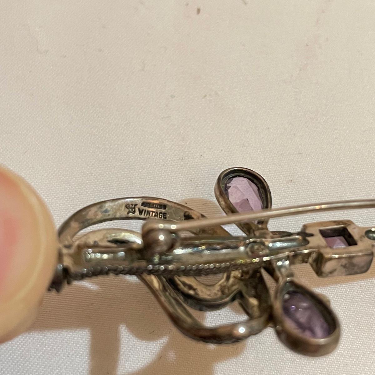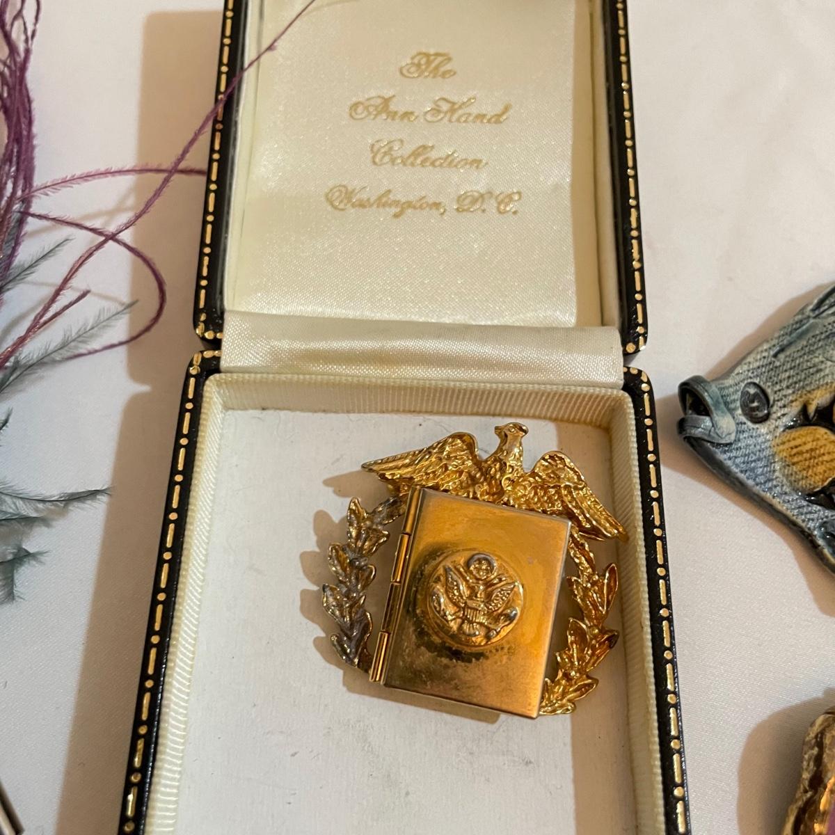 14 pins and brooches for a variety of occasions. A plum and teal peacock like brooch, a fairy serving tea, three pairs of stylish safety pins, sword with amethyst colored gems, a tropical clay fish, Ann Hand collection locket and more. See images. Shipping available. All sales are final. No returns or refunds. Please bid accordingly.