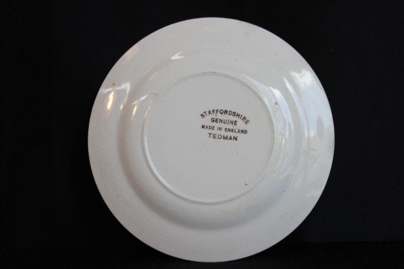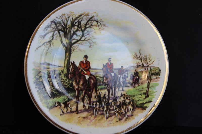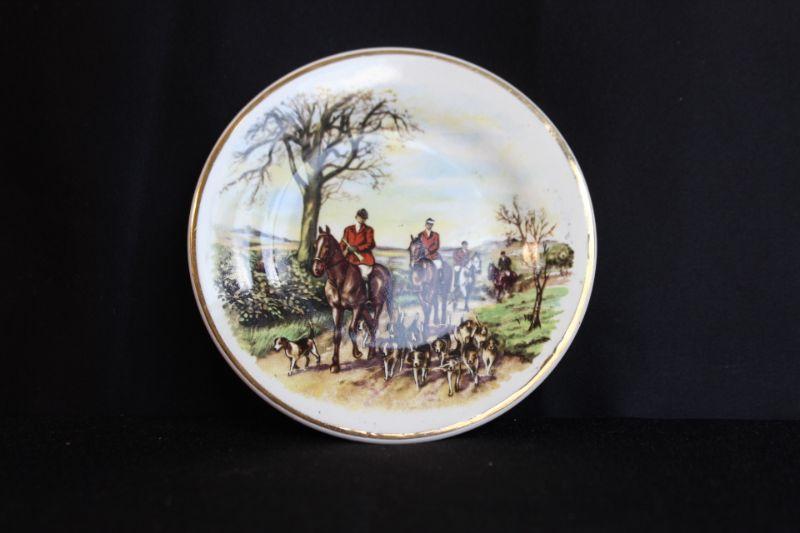 Saucer size decorative plate. Features a fox hunt scene. Made in England.