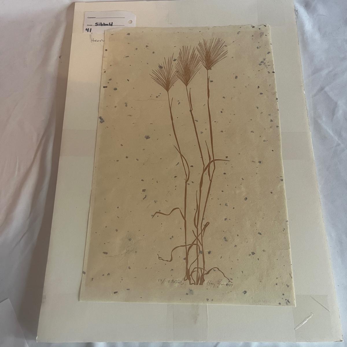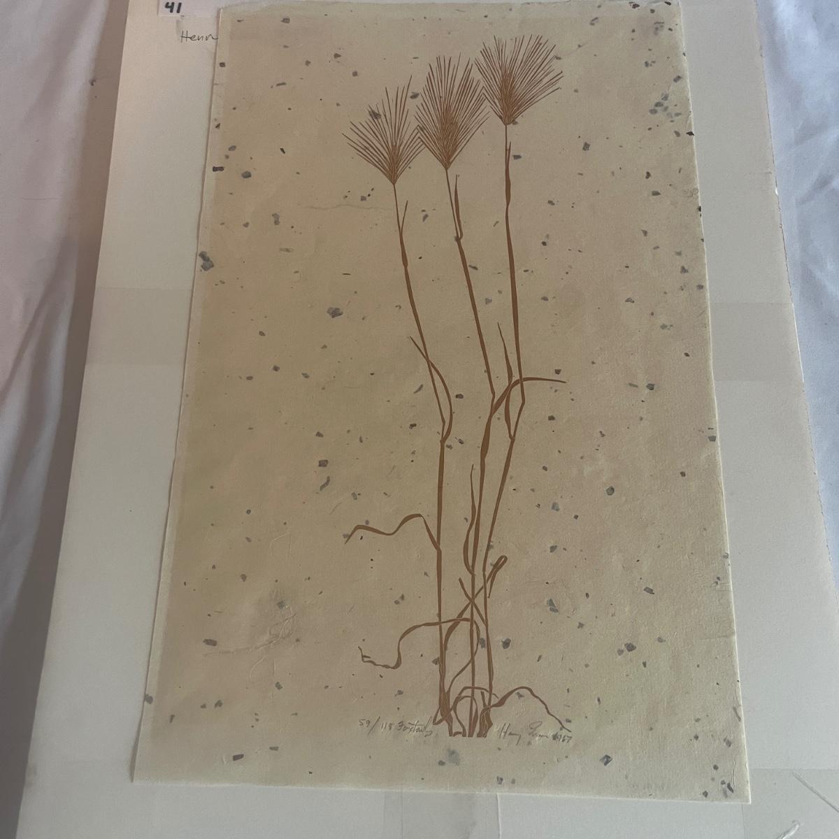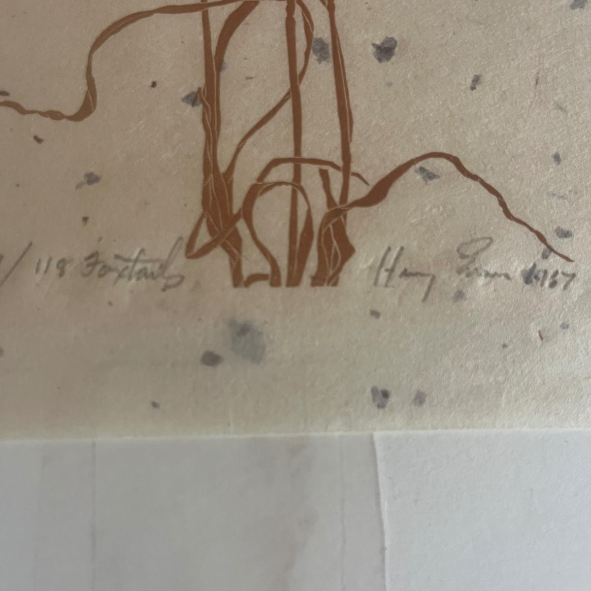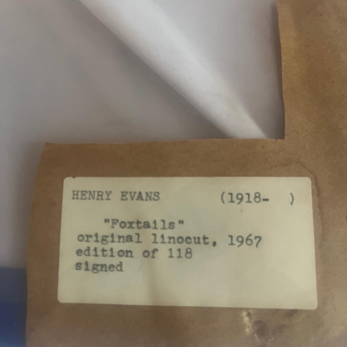 This art titled ”Foxtails" appears to be a pencil signed and numbered linocut by artist Henry Evans. Piece measures 12” x 19”H.