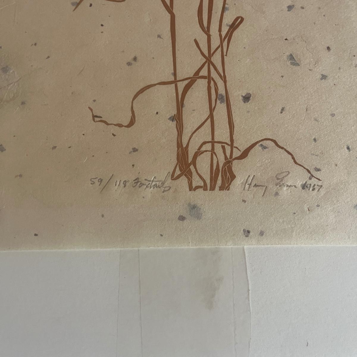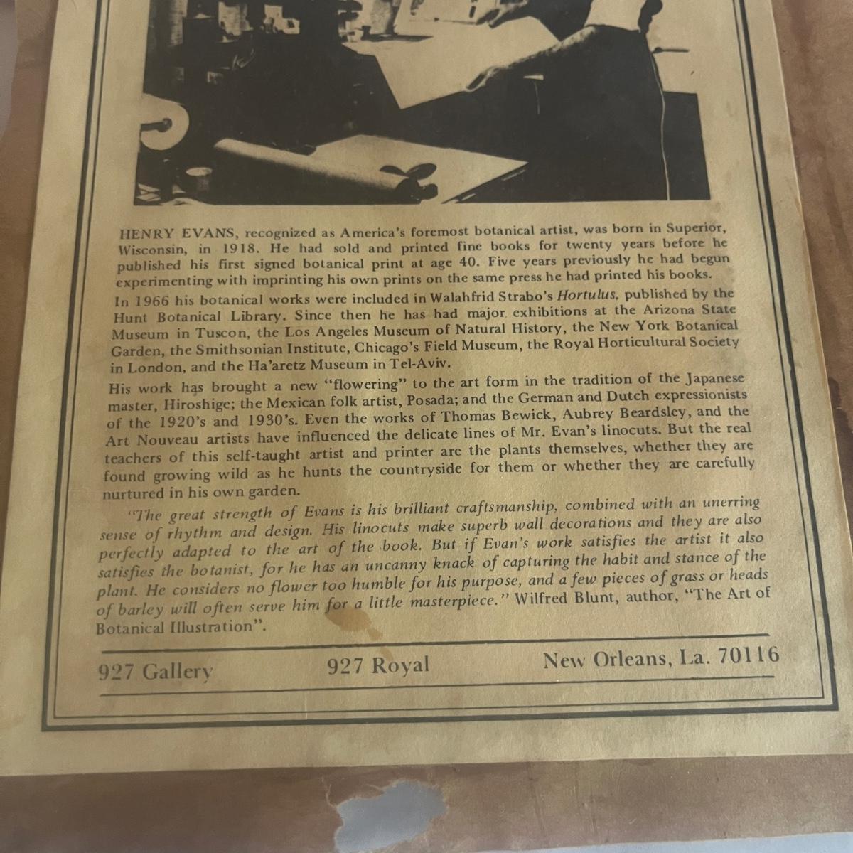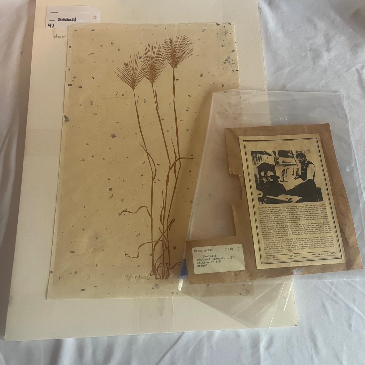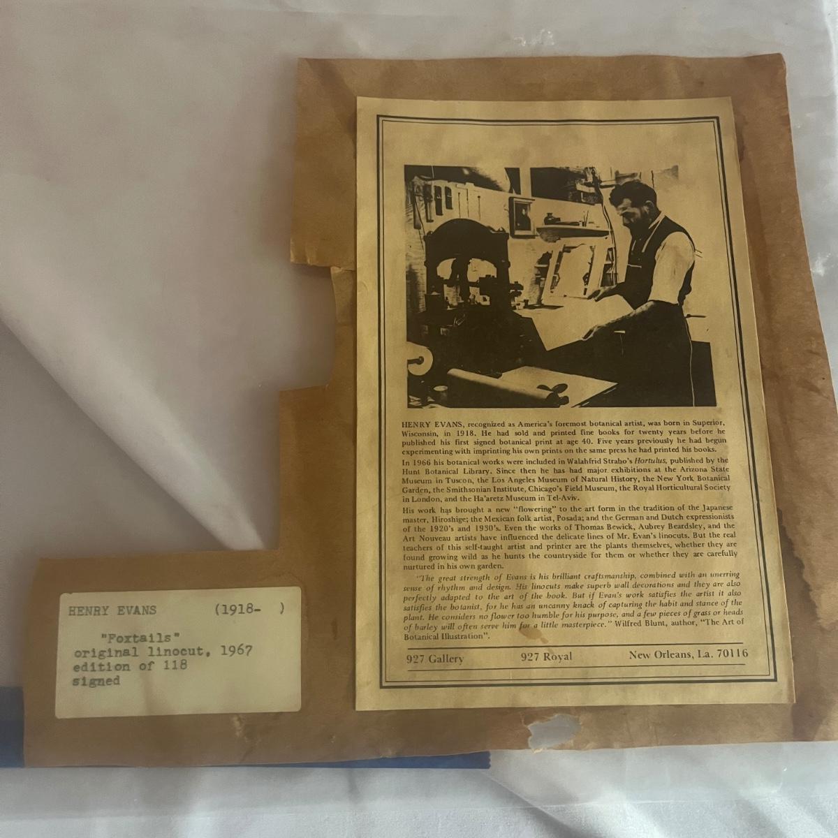 This art titled ”Foxtails" appears to be a pencil signed and numbered linocut by artist Henry Evans. Piece measures 12” x 19”H.