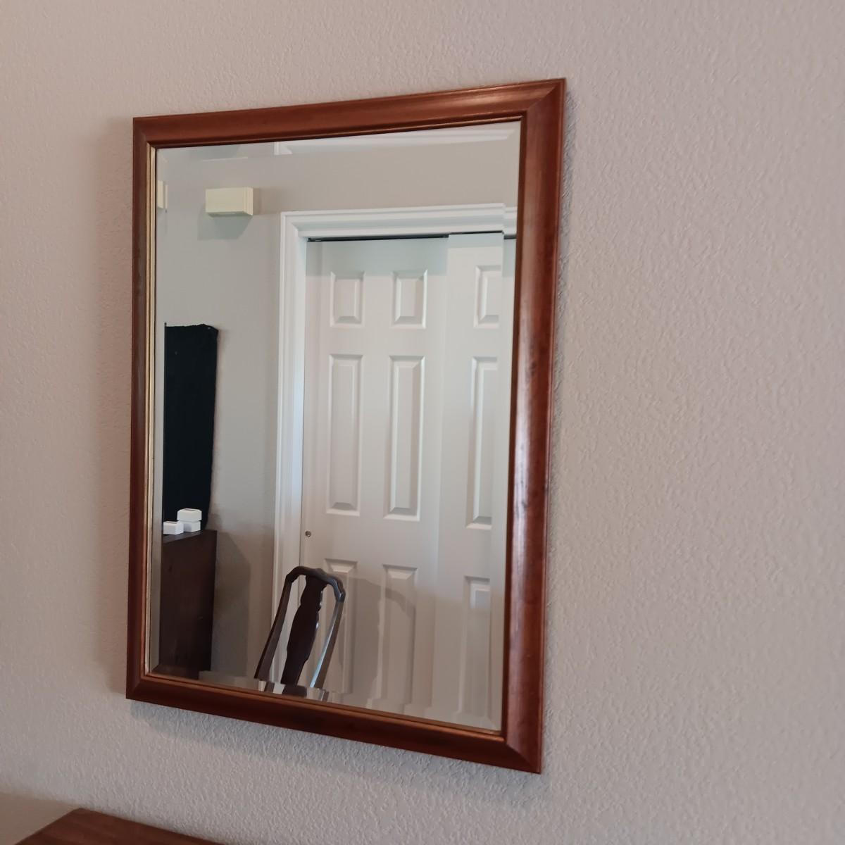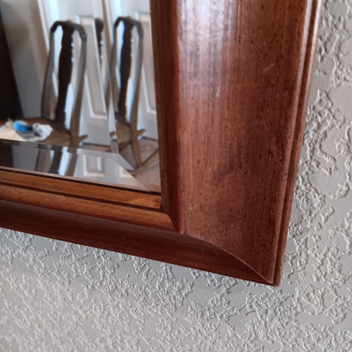 LIGHTED FOYER DISPLAY CABINET WITH WOOD FRAMED BEVELED WALL MIRROR