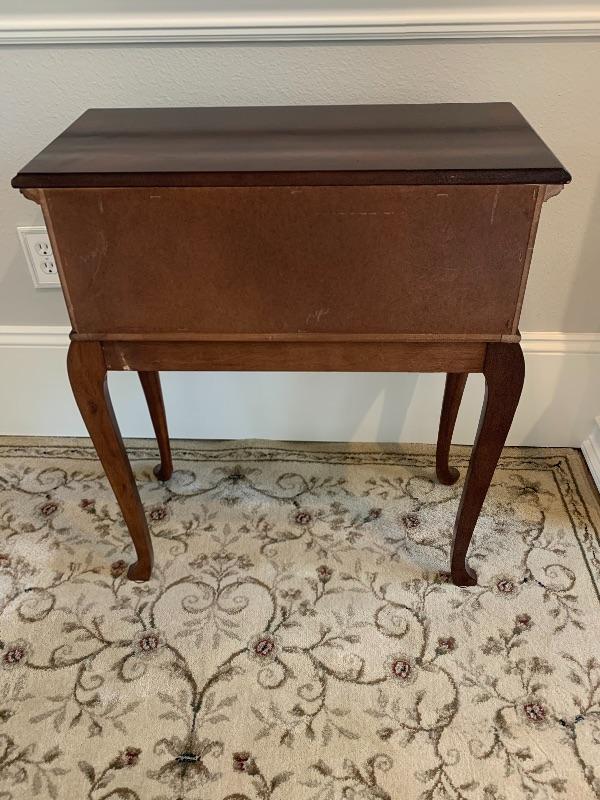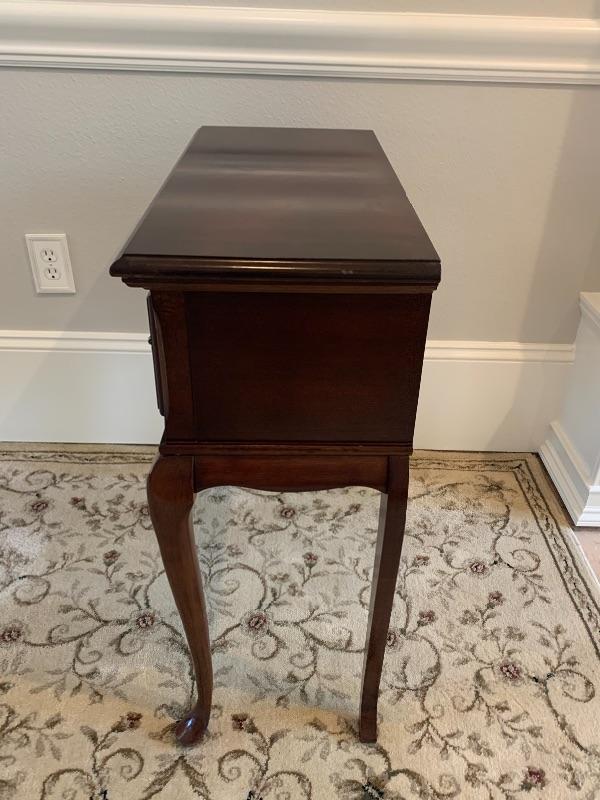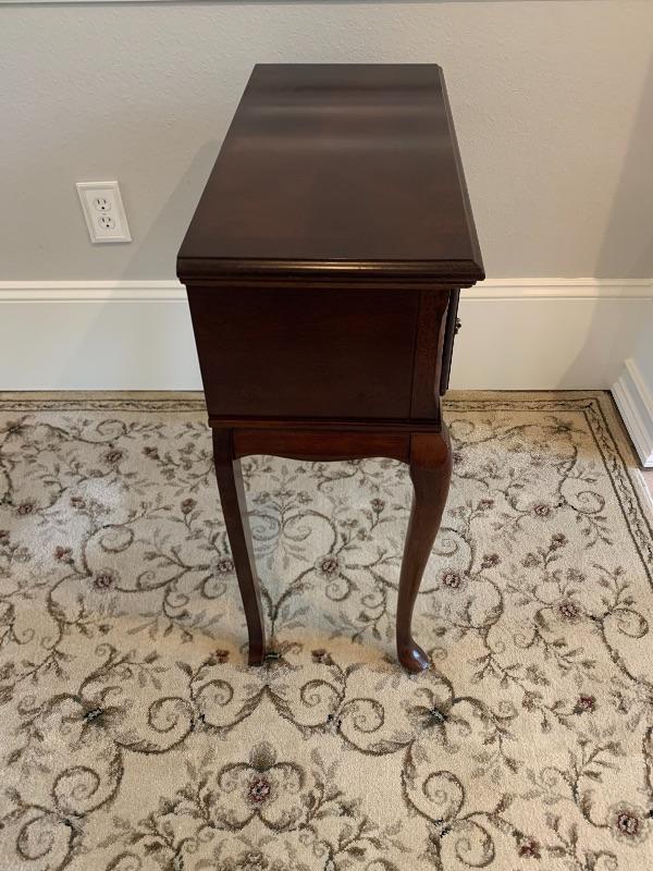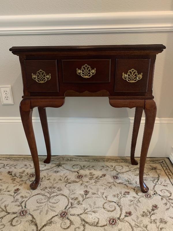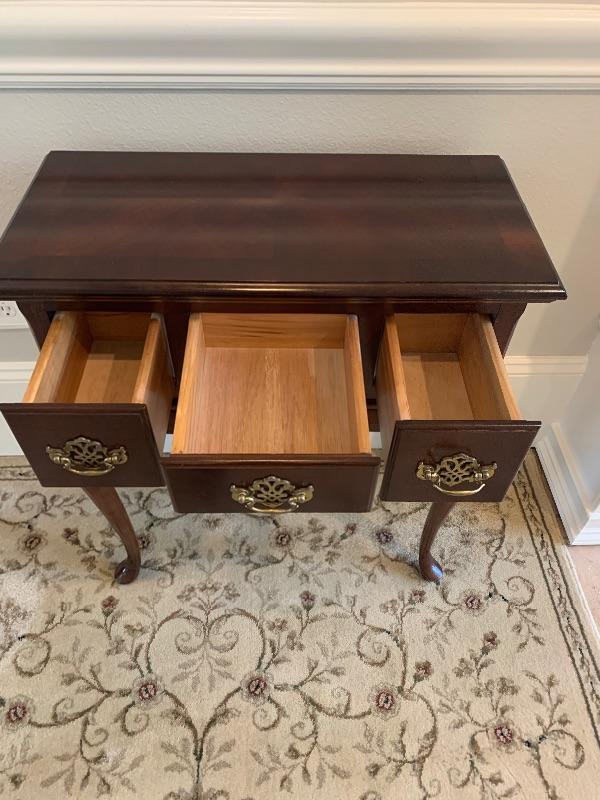 Good Pre owned condition, 3 Drawers, Dark wood.... Measurements 30” Height, 26” Width and 12”Depth.