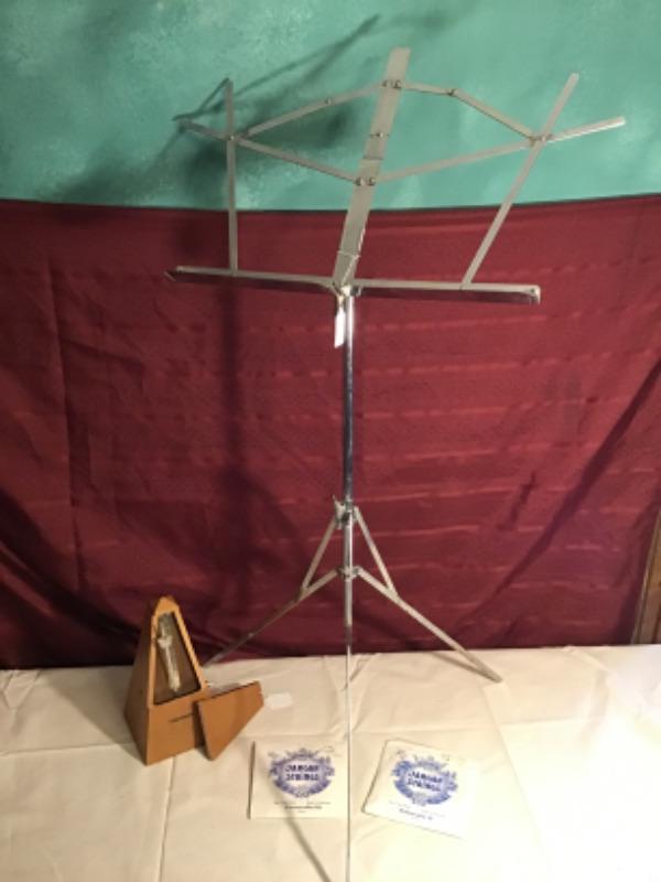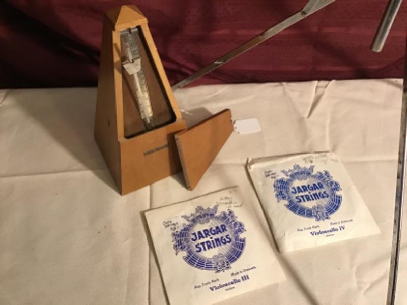 Music stand, cello strings, Seth Thomas metronome See pictures