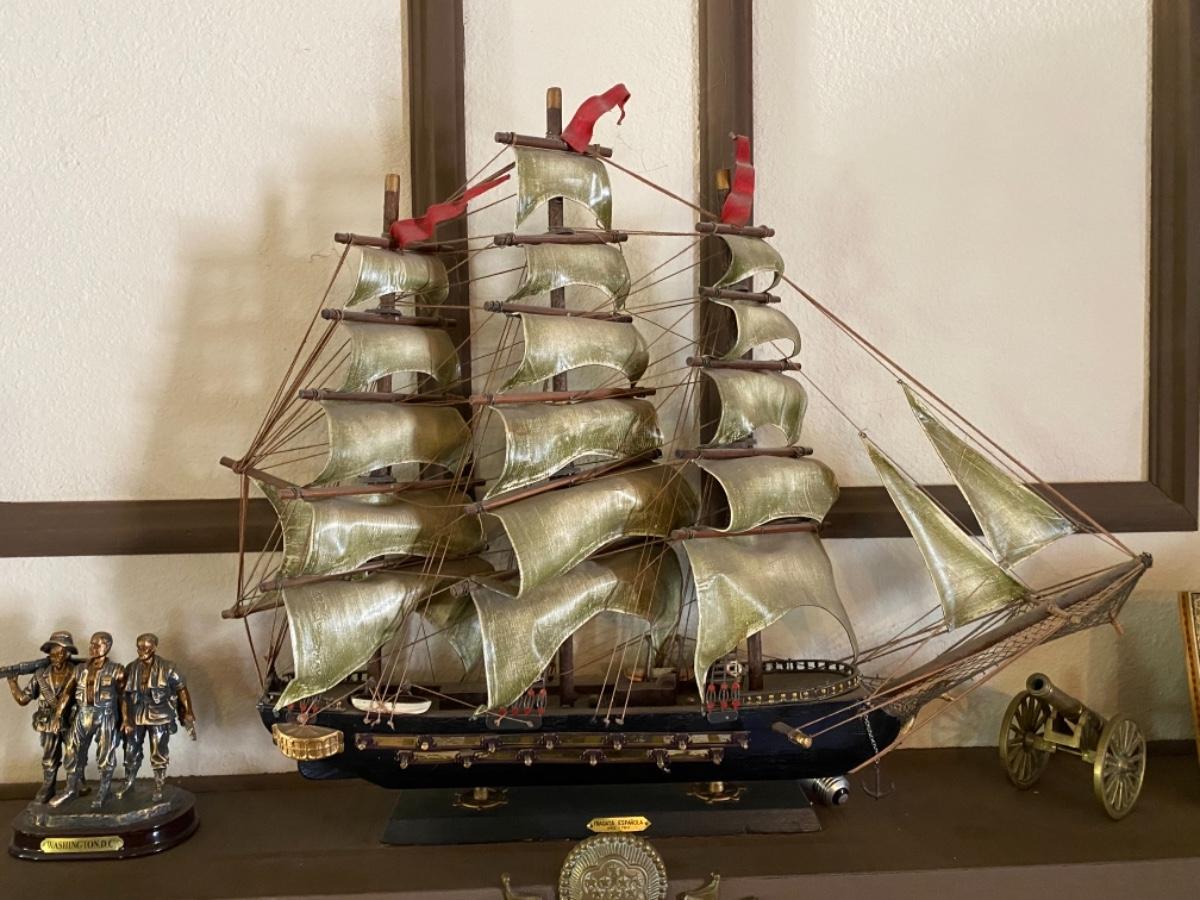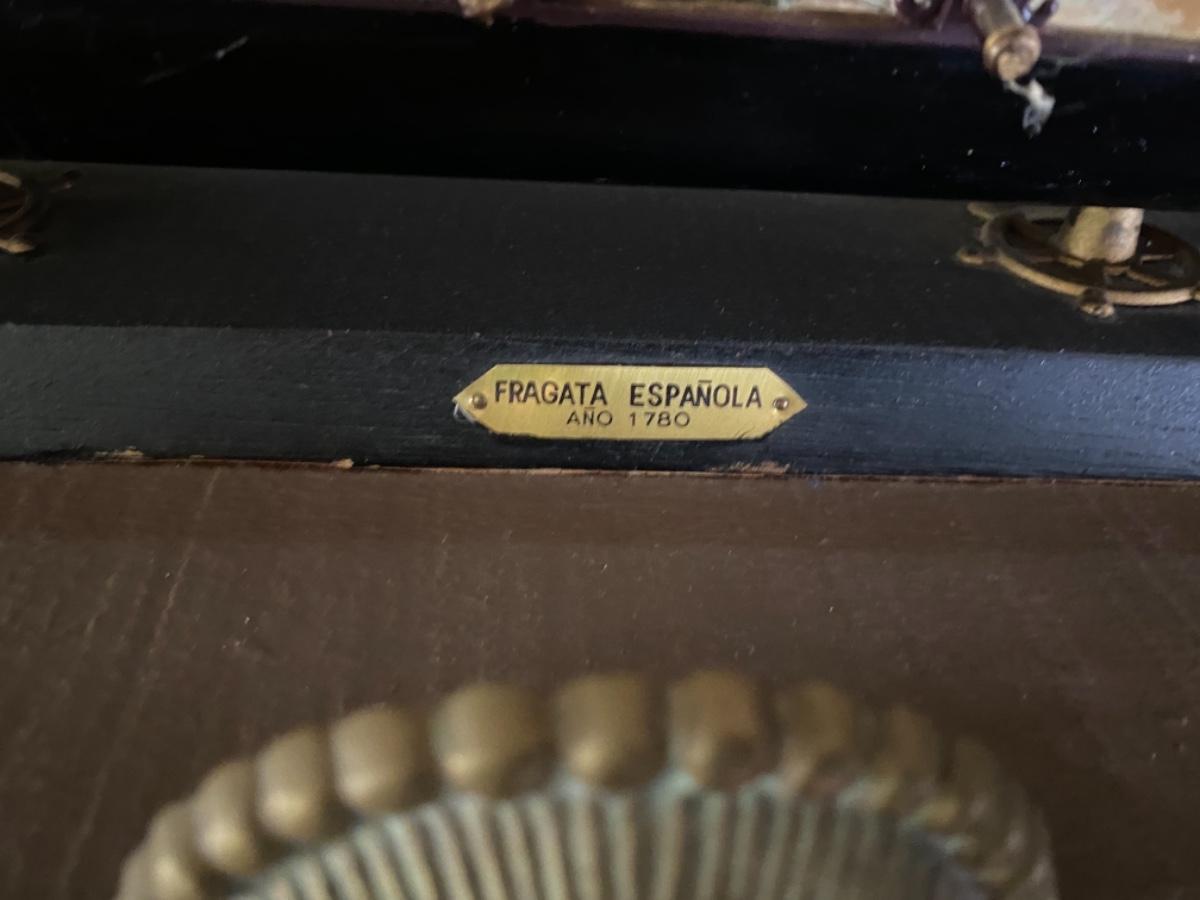 Model of an 18th-century Spanish frigate measuring approximately 15 inches long, 4 inches wide, and 16 inches high. The plaque on the base of the stand for the ship reads: Fragata Espanola Ano 1780. She was one of the Spanish ships that fought in the battle of Cape St. Vincent, which took place off the southern coast of Portugal on 16 January 1780 during the American Revolutionary War.