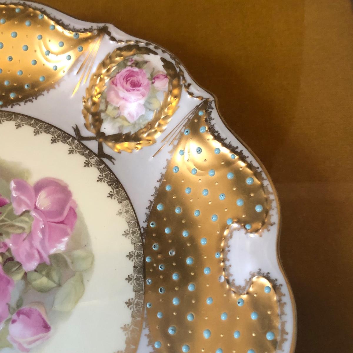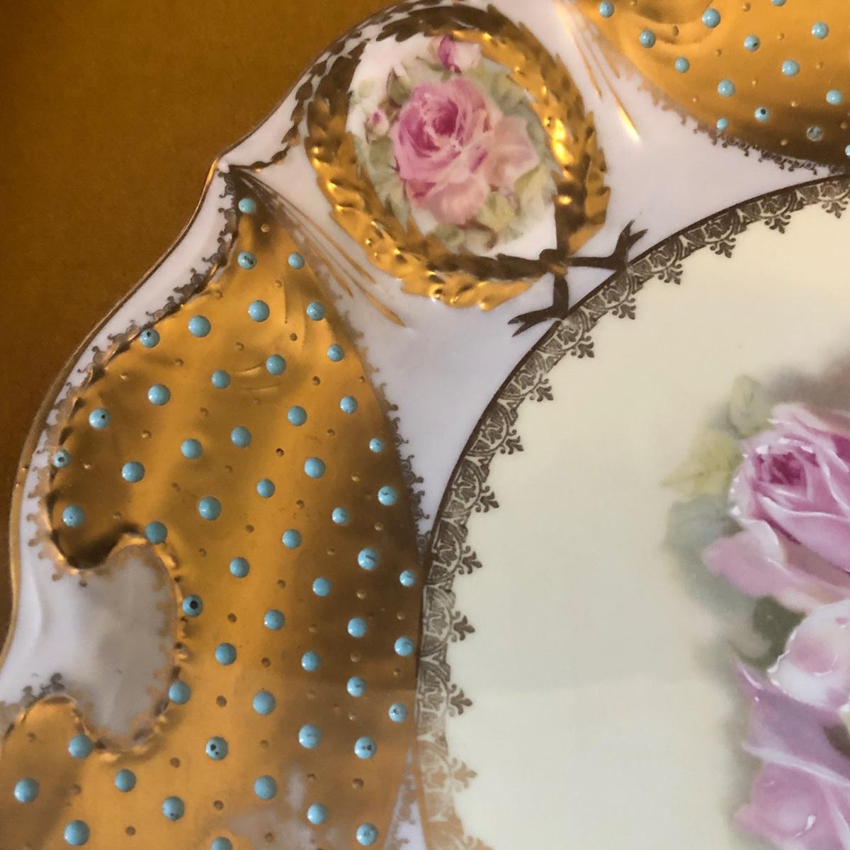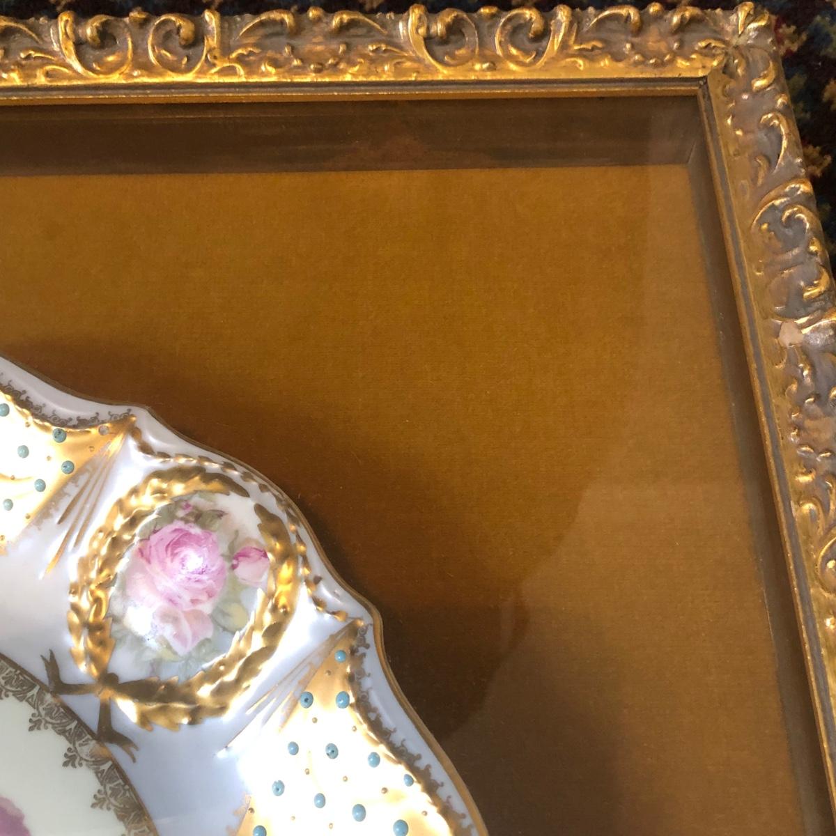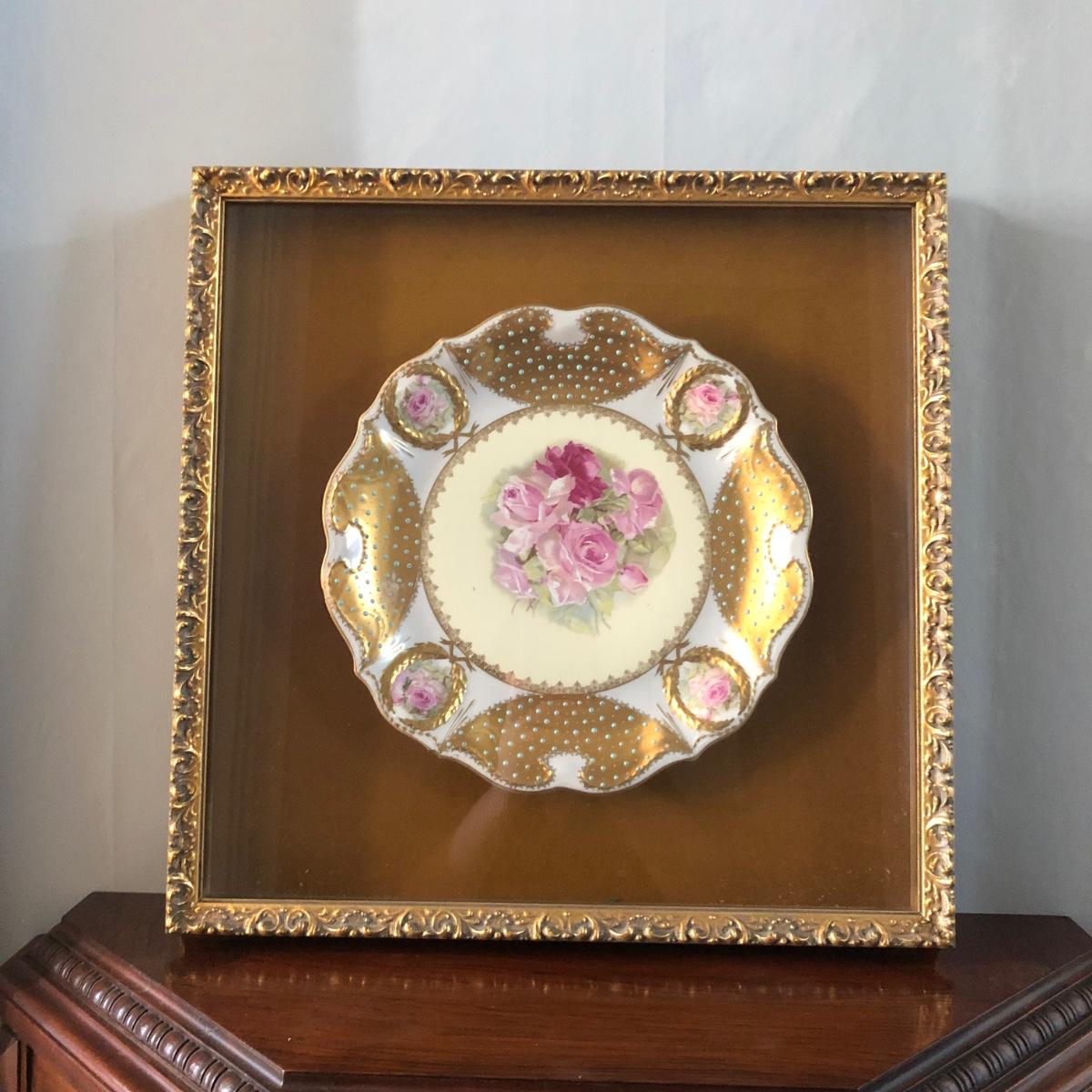 This plate with pink roses and gold and blue hand painted details has an ornate gold frame. Note the raised green dots! The mat that the plate is attached to is auburn brown. The frame measures 19.5” x 19.5 “ square and the plate is 12” in diameter. Shipping available. Shipping art can be costly. Please contact the local UPS store to get a shipping quote.