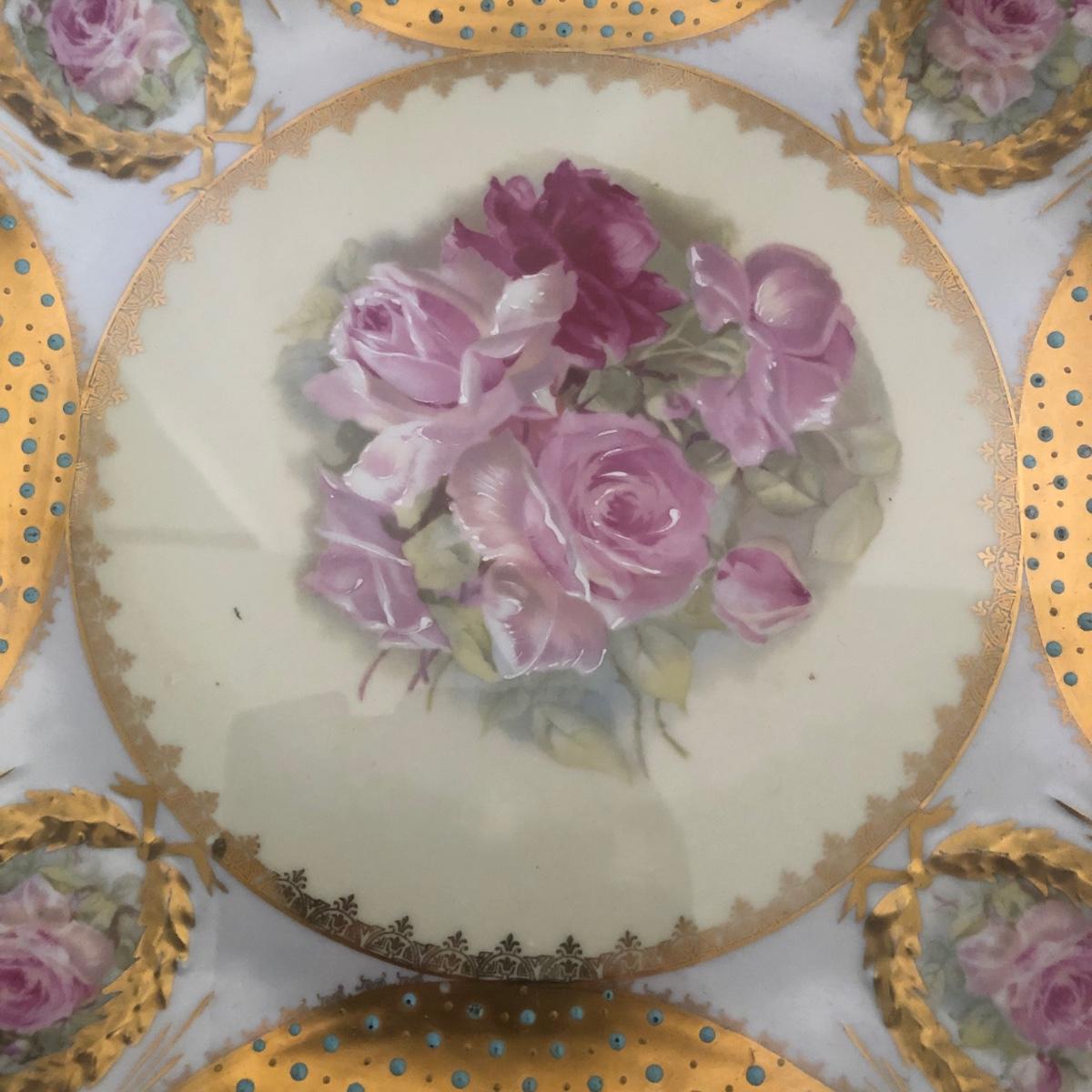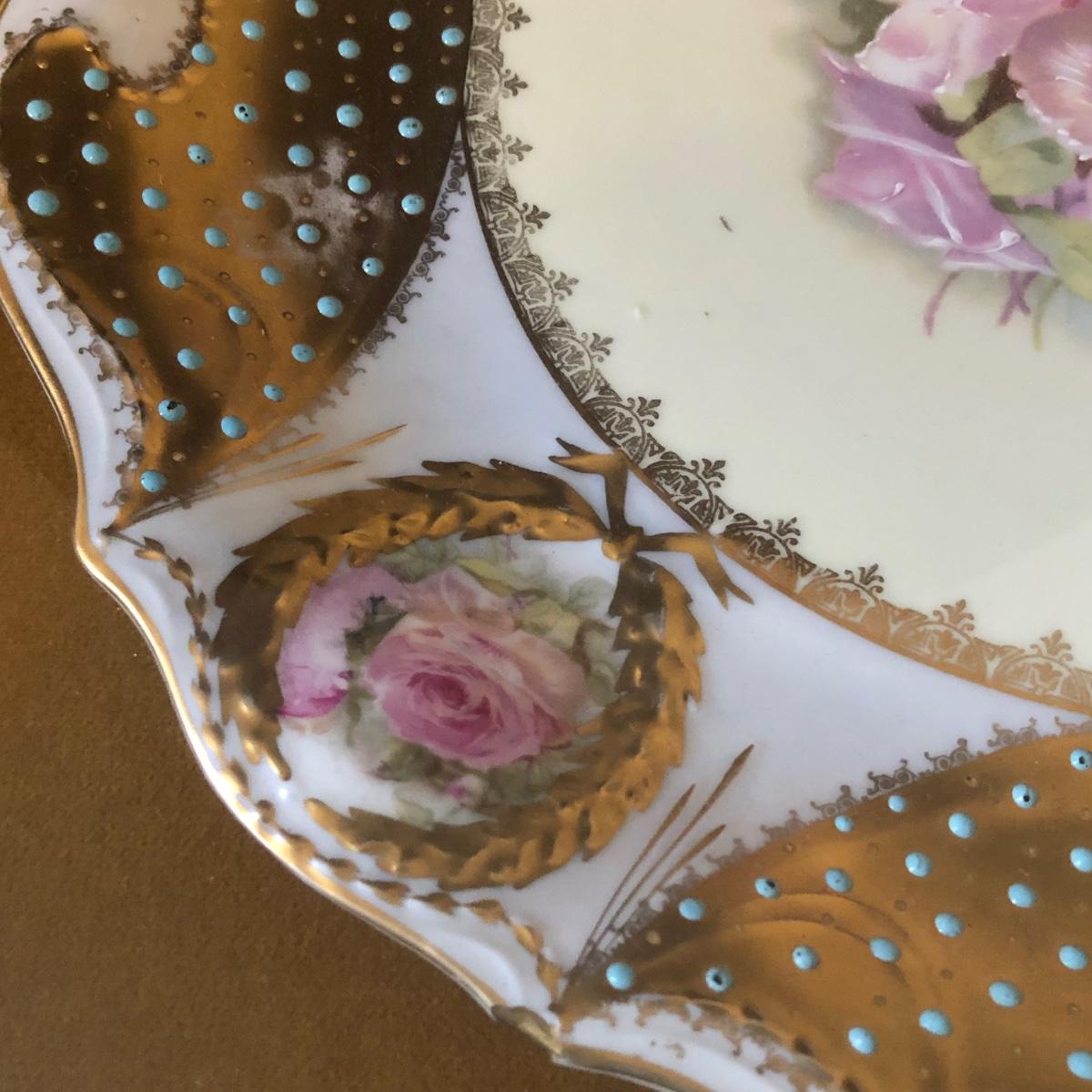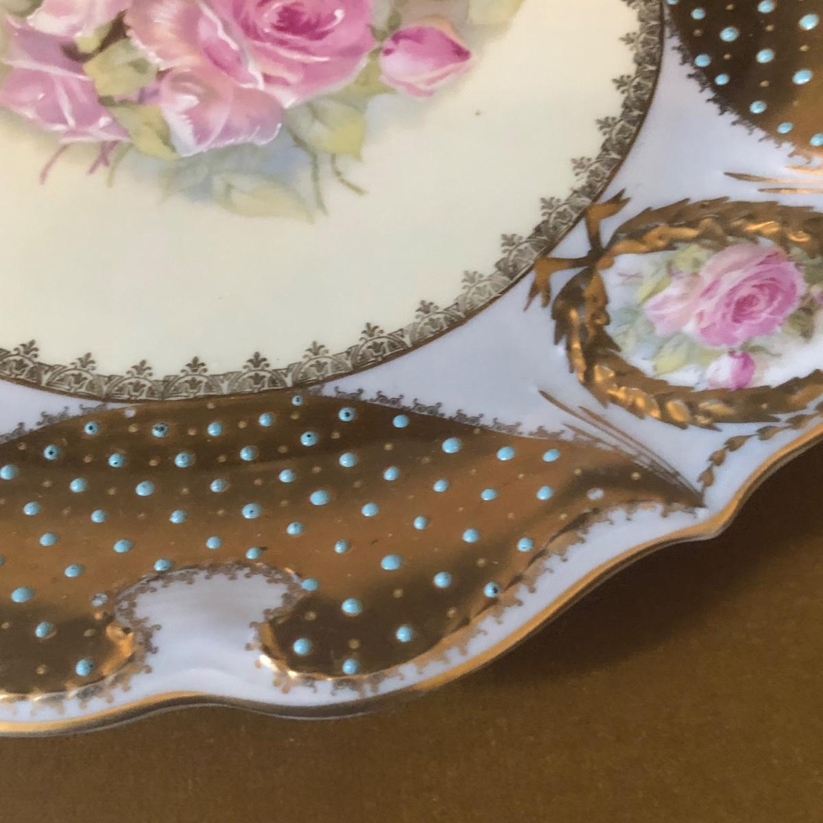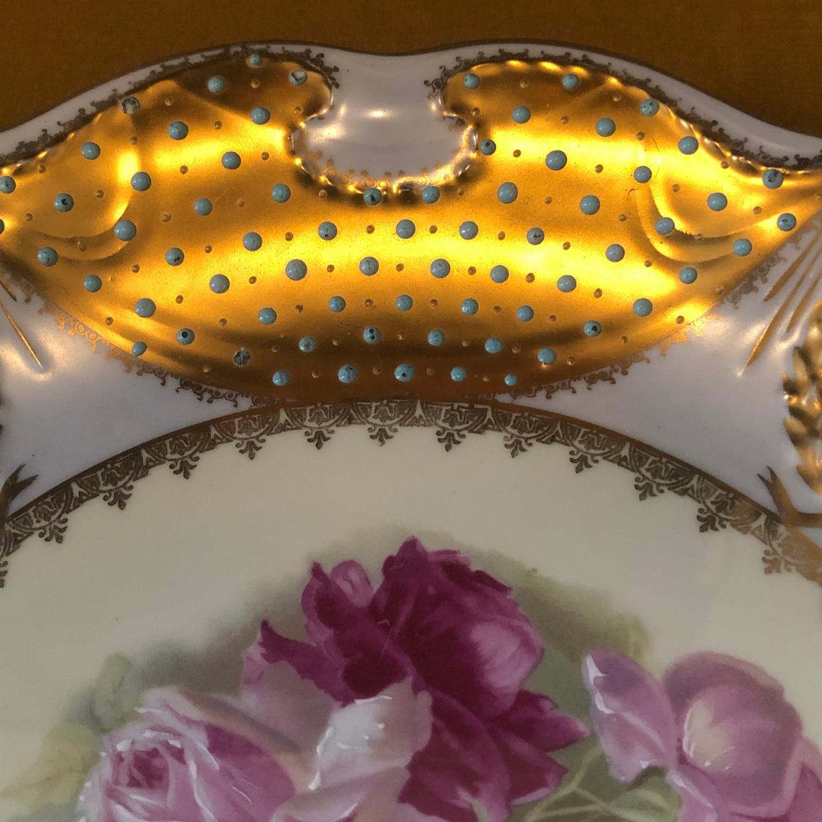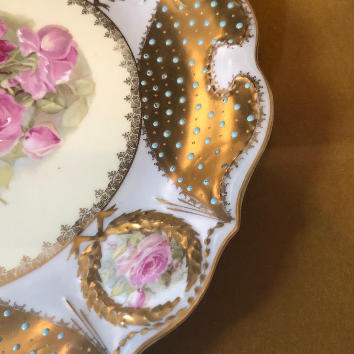 This plate with pink roses and gold and blue hand painted details has an ornate gold frame. Note the raised green dots! The mat that the plate is attached to is auburn brown. The frame measures 19.5” x 19.5 “ square and the plate is 12” in diameter. Shipping available. Shipping art can be costly. Please contact the local UPS store to get a shipping quote.