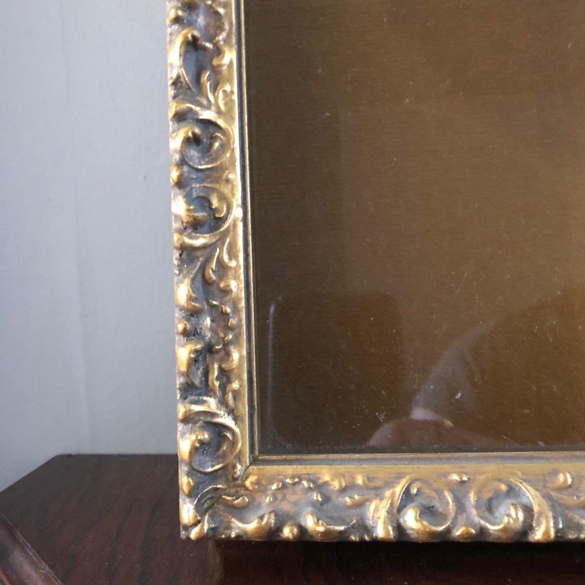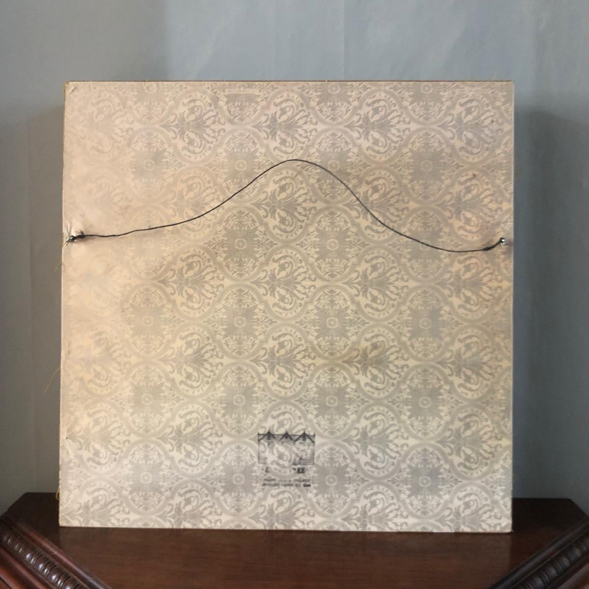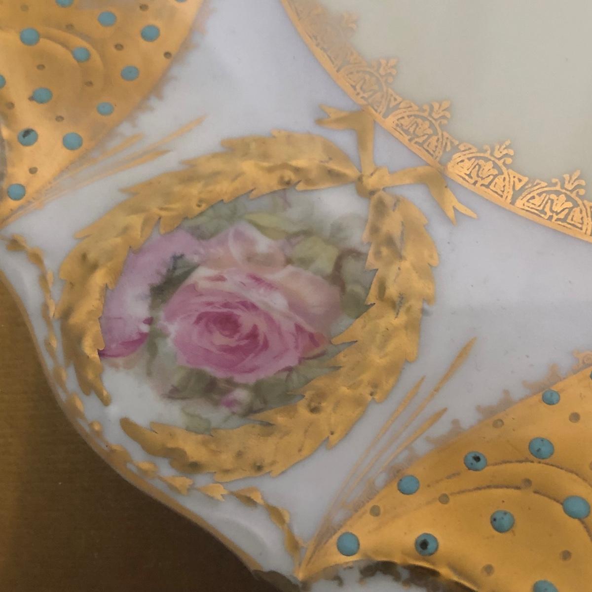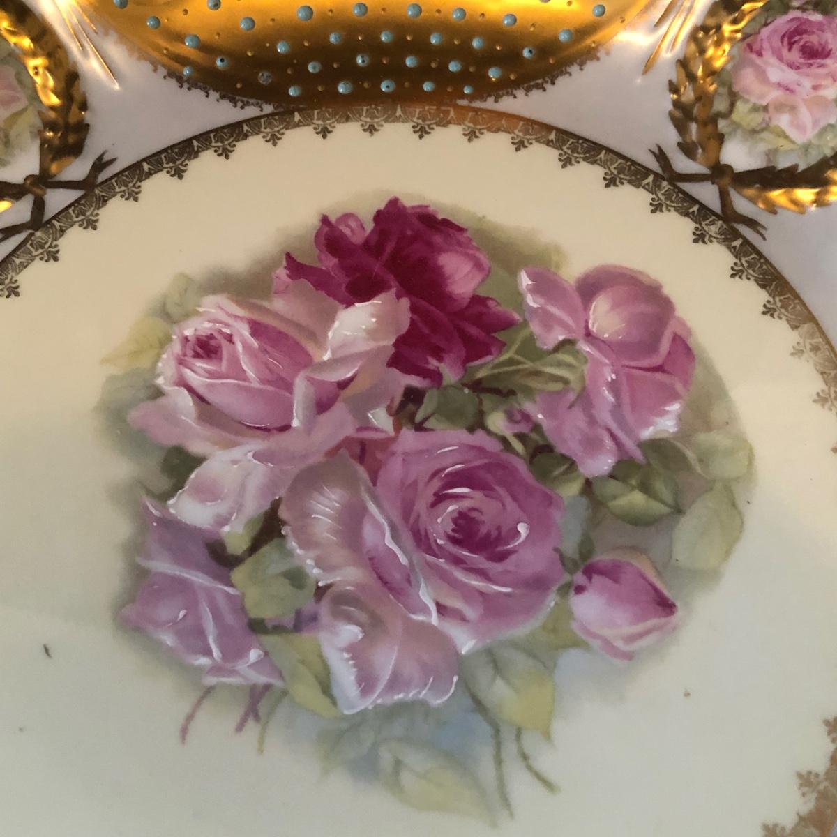 This plate with pink roses and gold and blue hand painted details has an ornate gold frame. Note the raised green dots! The mat that the plate is attached to is auburn brown. The frame measures 19.5” x 19.5 “ square and the plate is 12” in diameter. Shipping available. Shipping art can be costly. Please contact the local UPS store to get a shipping quote.