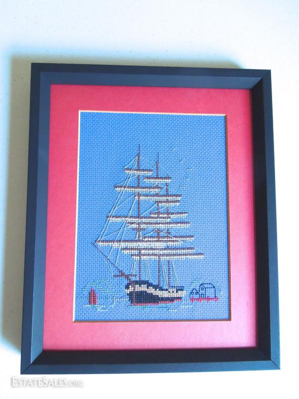 Navy wooden frame mounted in red. Cross stitch depiction of sailing ship.