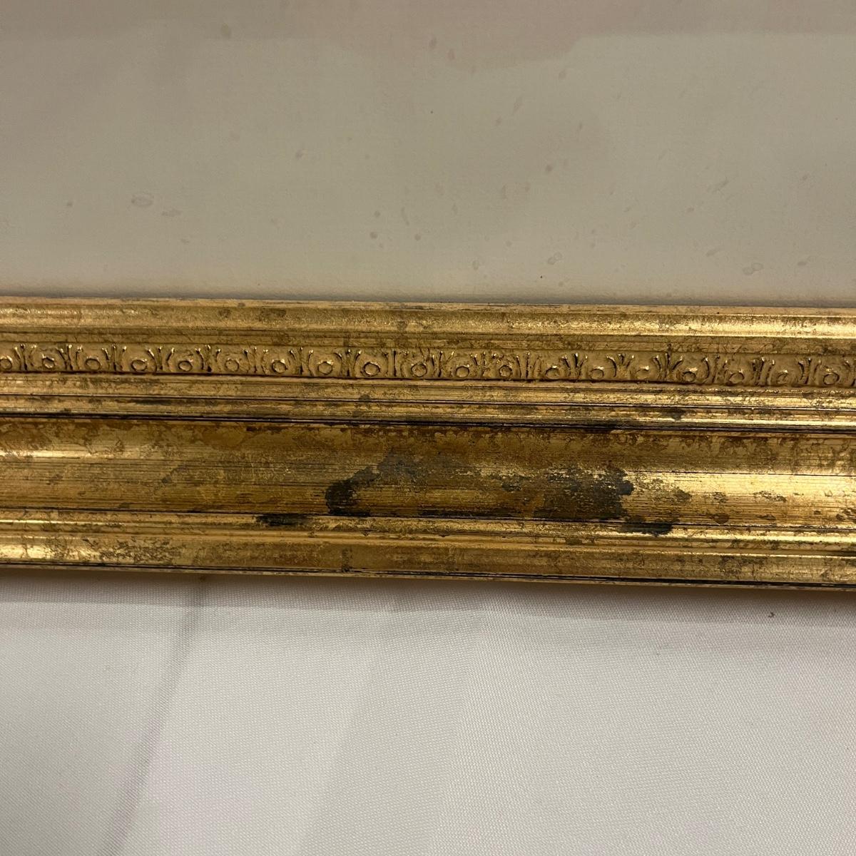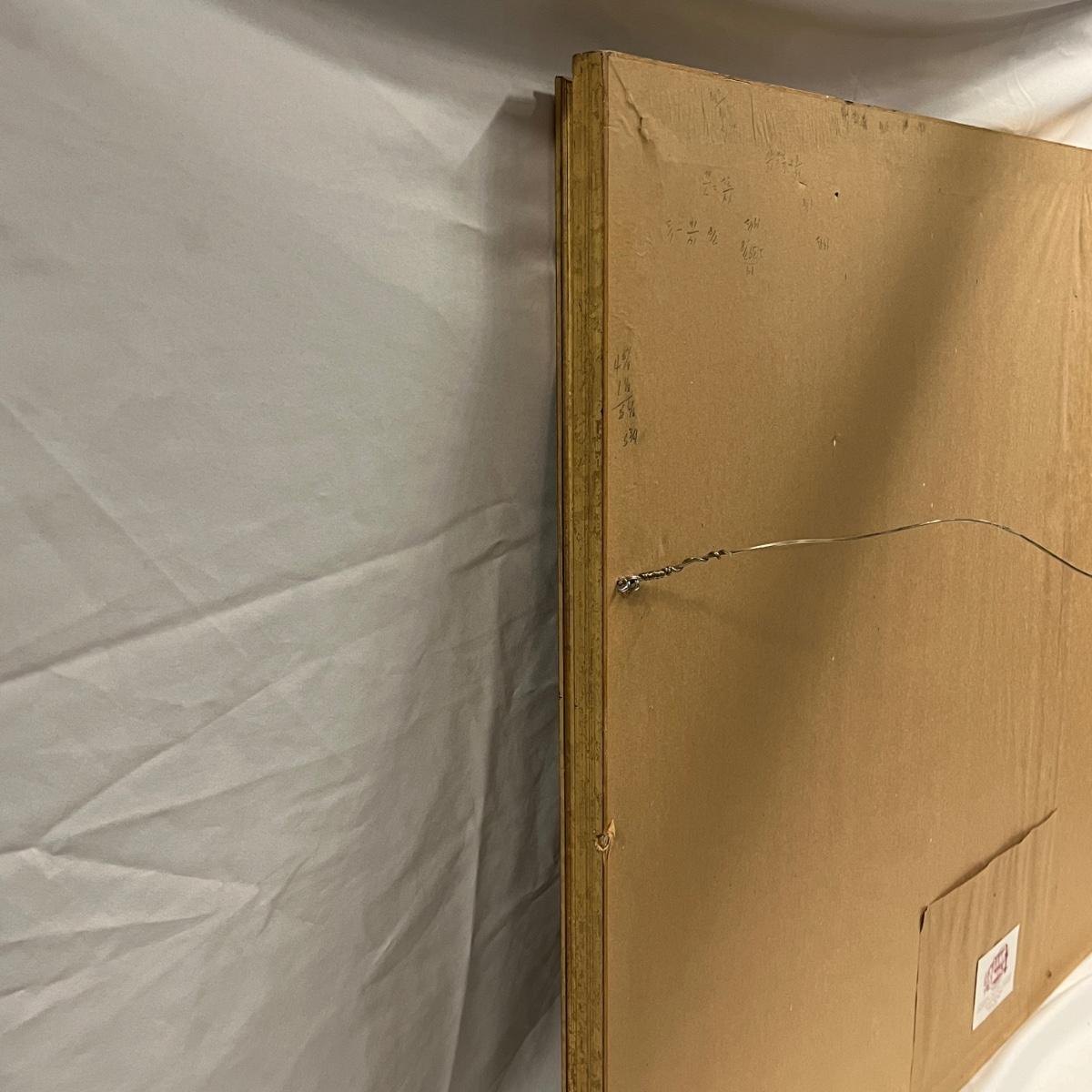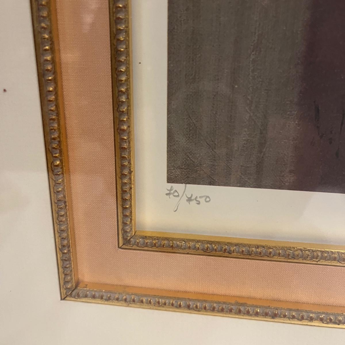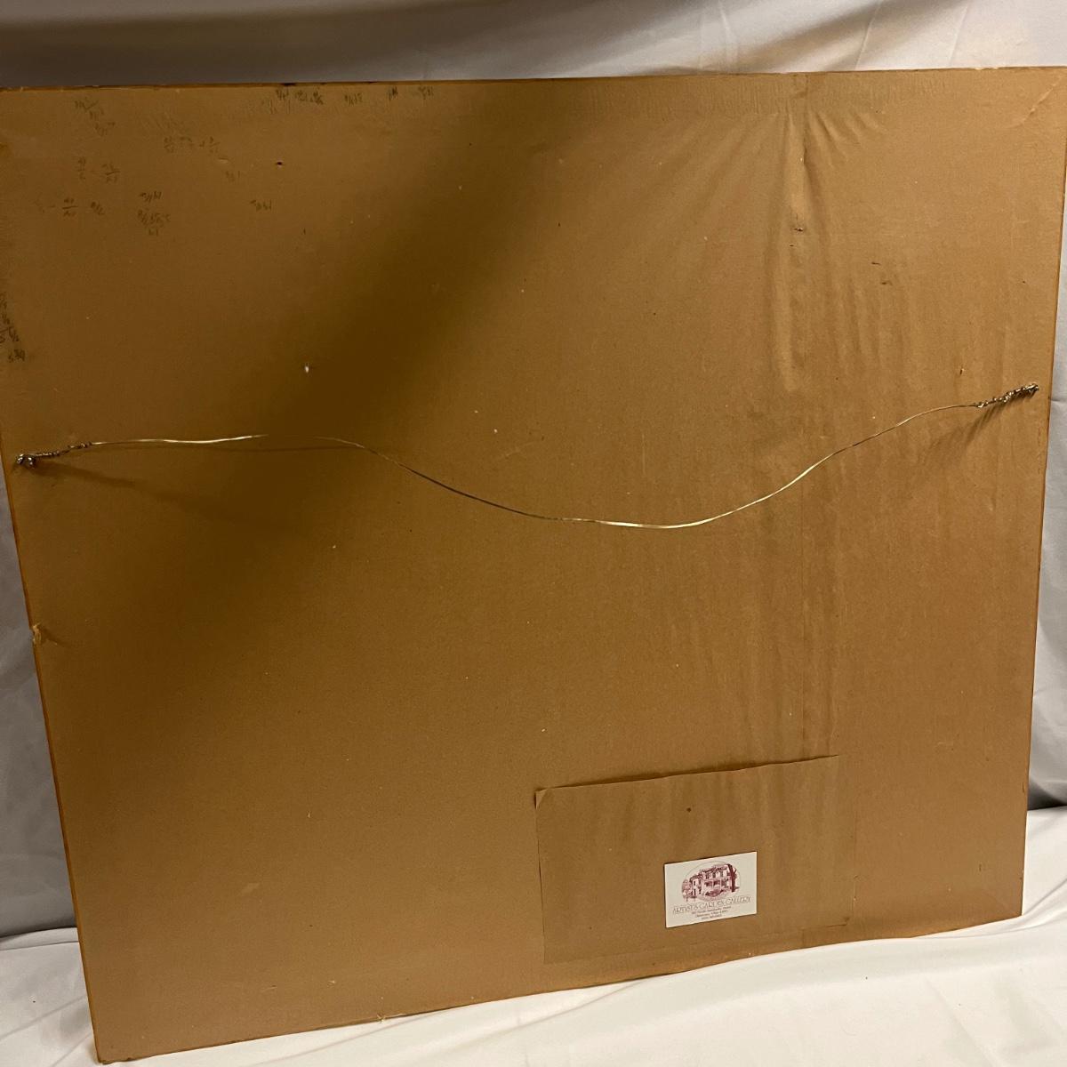This wooden framed piece is titled “A Festive Occasion”. It is pencil signed and numbered by artist Alan Maley. Piece is under glass and frame measures 40” x 2” x 36.5”H. A small dark mark on the frame is shown in a photo and a small nick on the back also.
