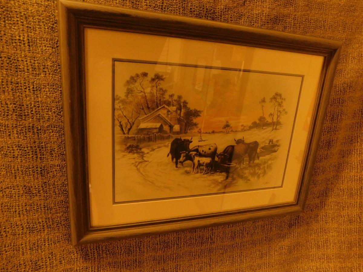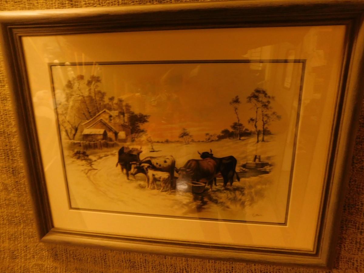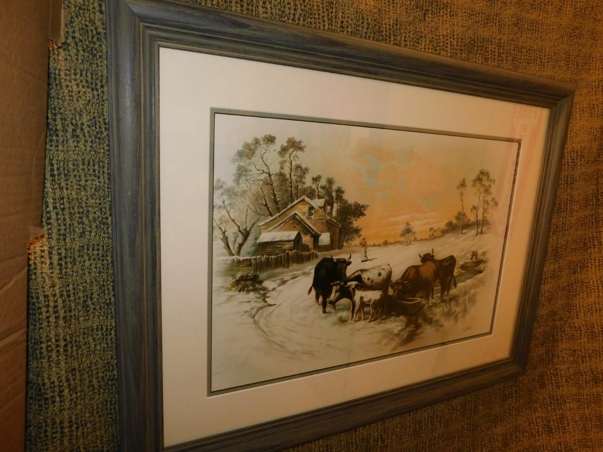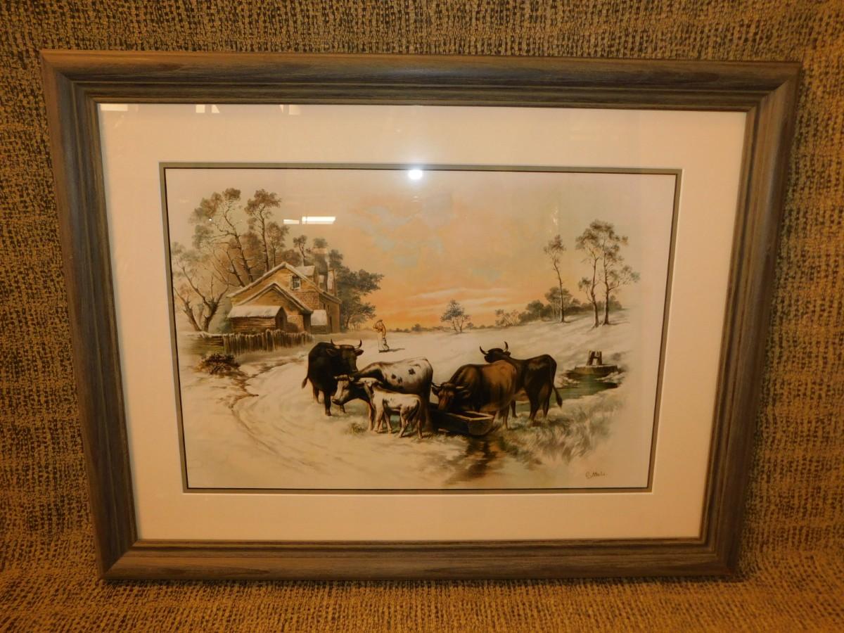 Framed & Matted Winterscape Cows in Barnyard Print 30”x23”