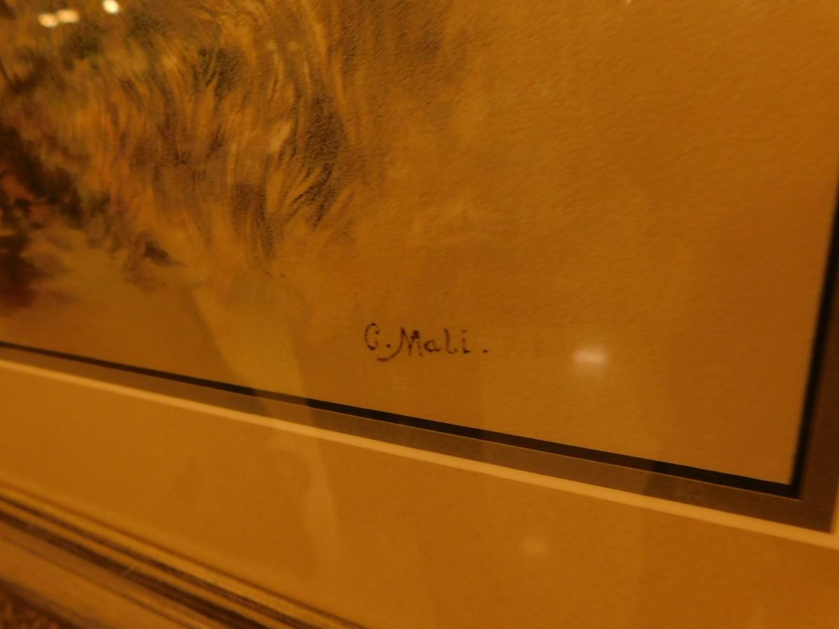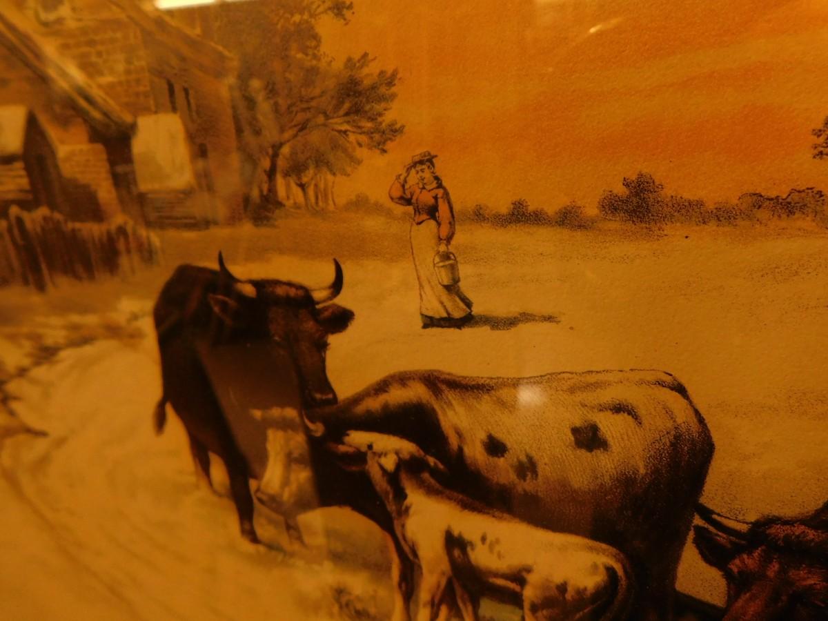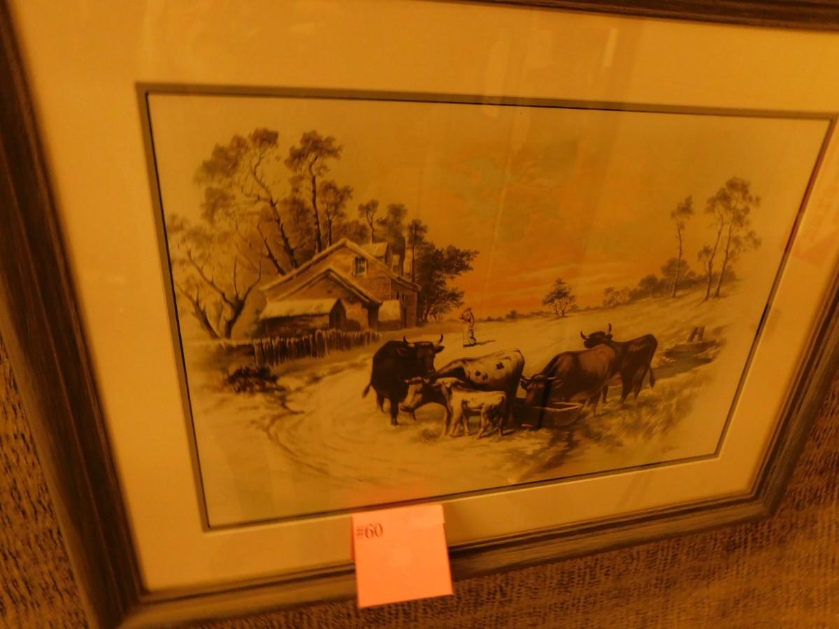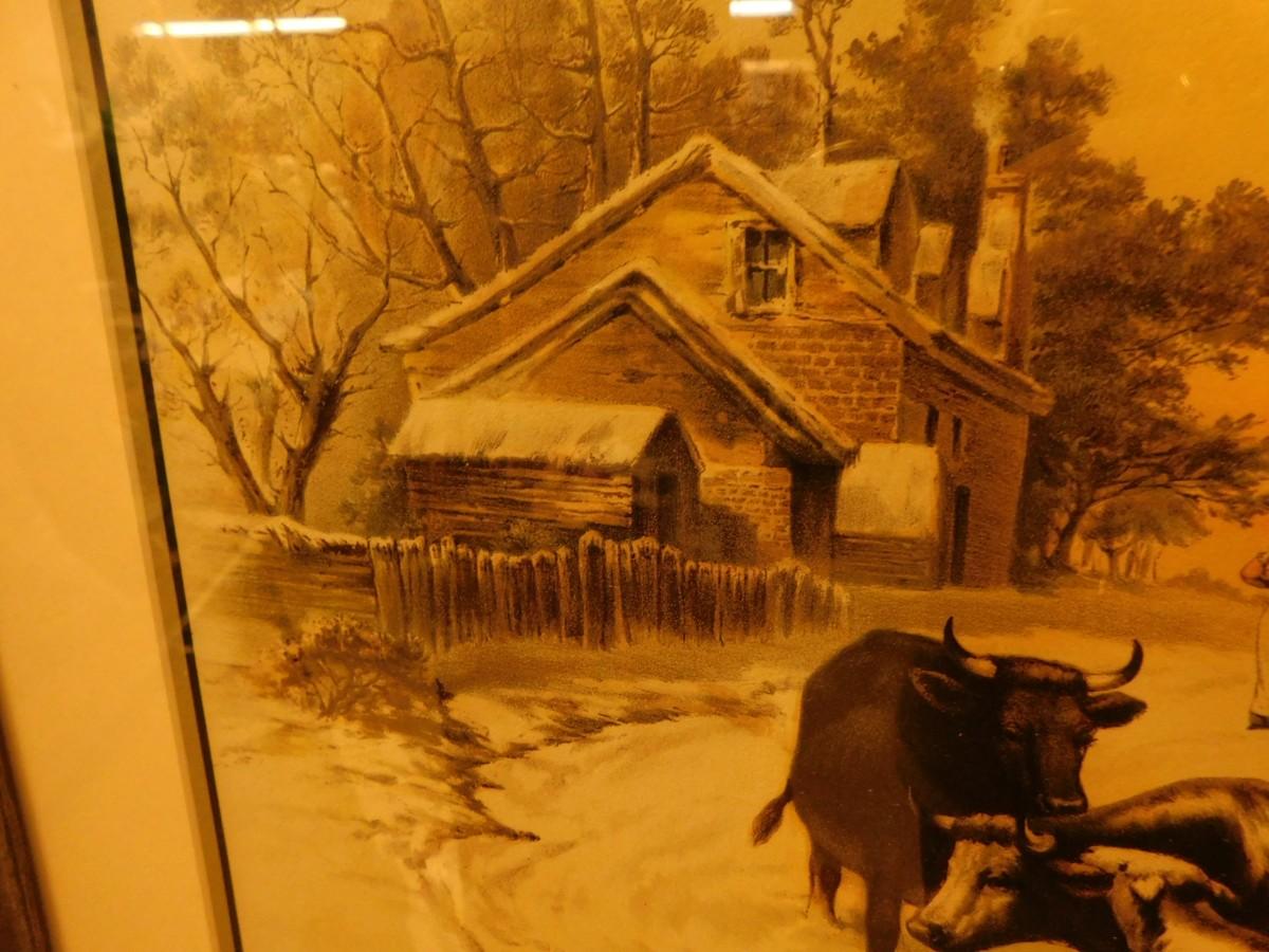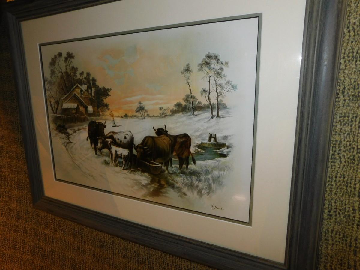 Framed & Matted Winterscape Cows in Barnyard Print 30”x23”