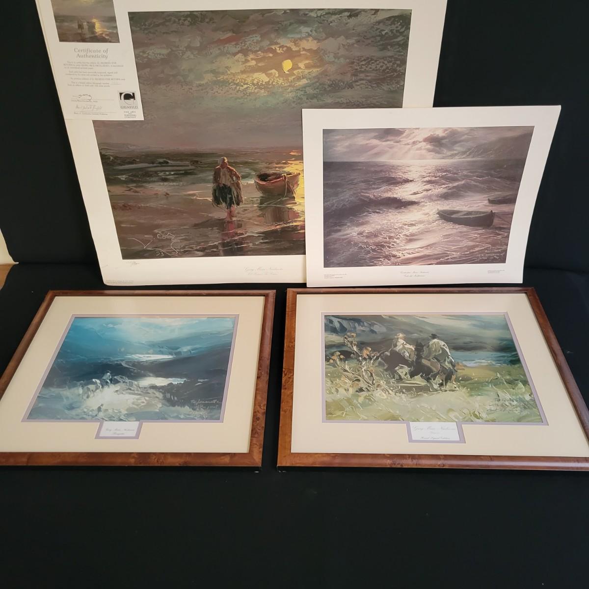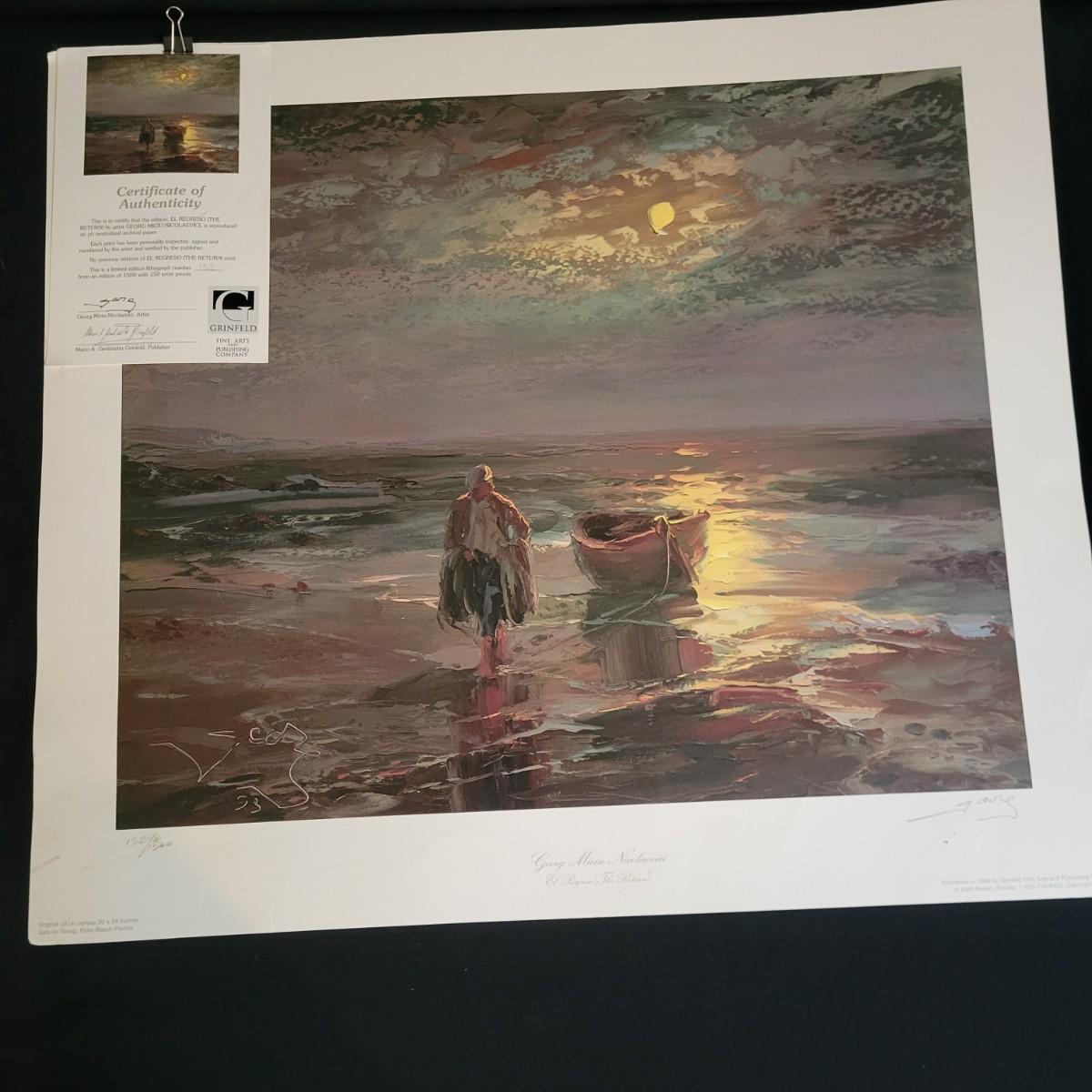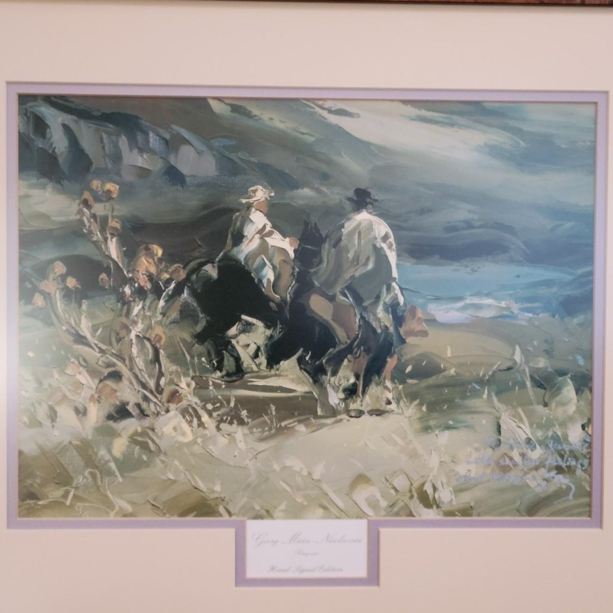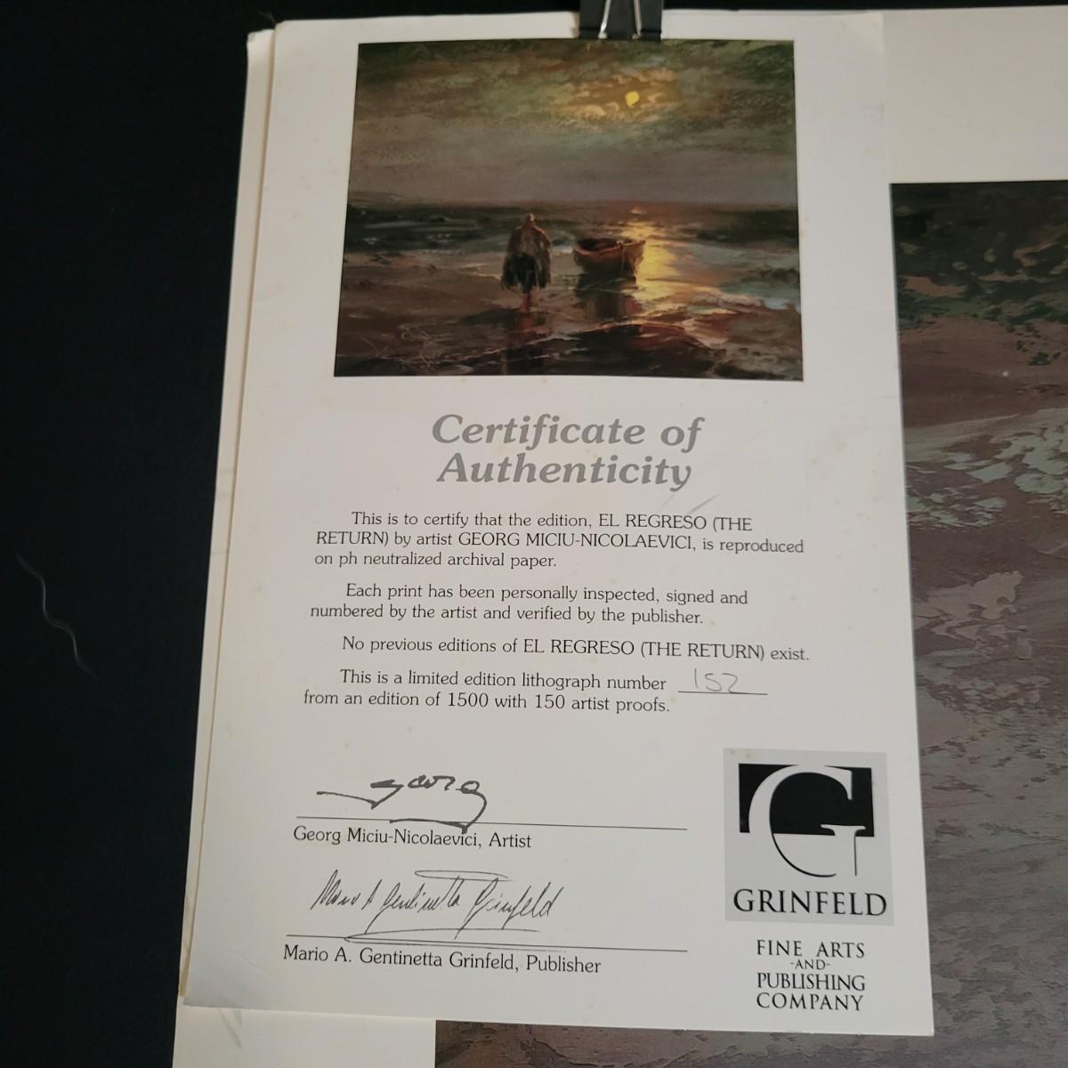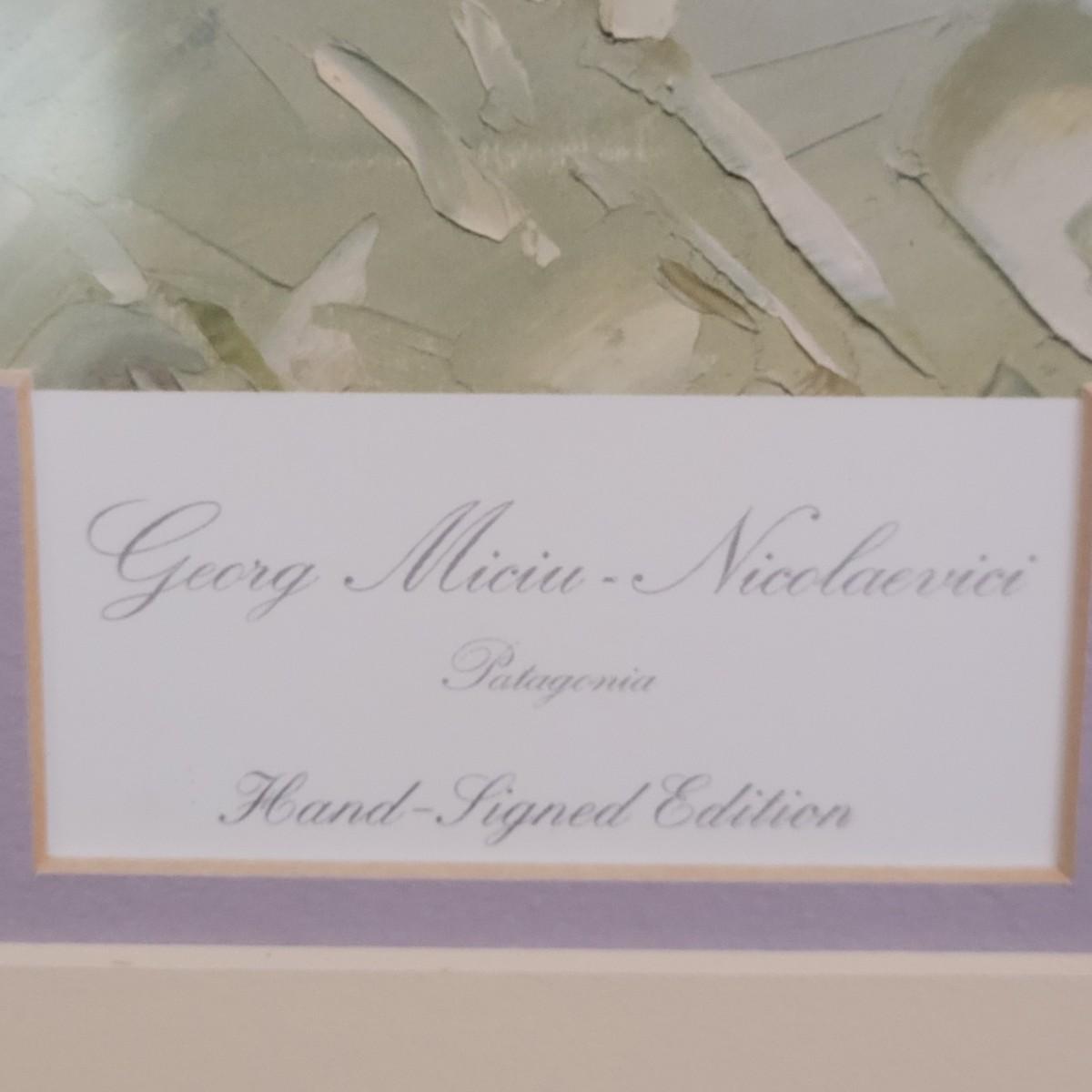 An assortment of prints by Georg Miciu Nicolaevici. Two are framed with solid wood frames with a single mat. They are signed by the artist in pen with a personalized message. There are two loose prints included as well. The largest is signed and numbered in pencil and includes a certificate of authenticity and measures approximately 25.5" x 22.5"H. There is a small tear and some marks on the larger print. The smaller print is signed in pen and includes a personalized message. Shipping available. Shipping art can be costly. We suggest contacting our preferred local shipping provider, Postage Express, with dimensions and getting an estimate before bidding: (828) 670-5501 or postageexpress@yahoo.com.