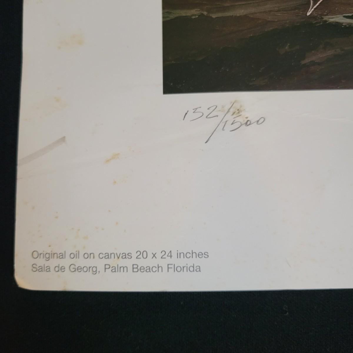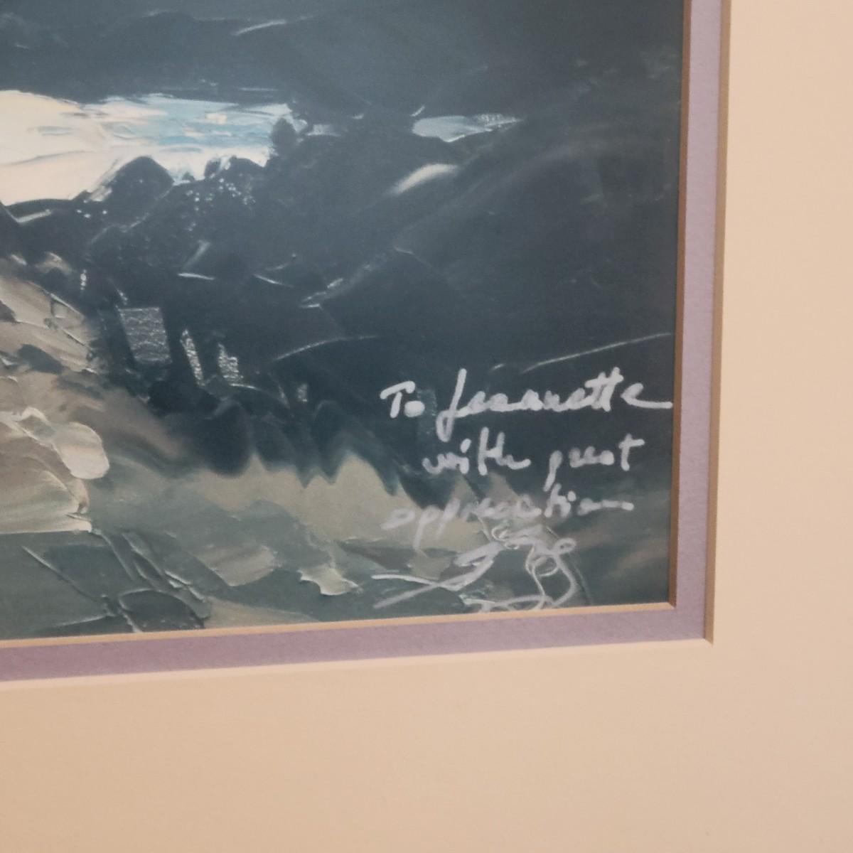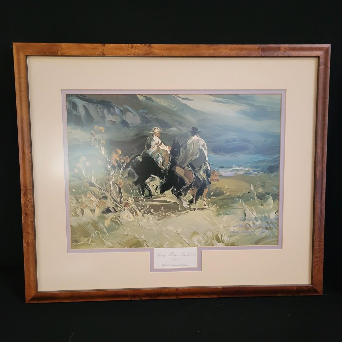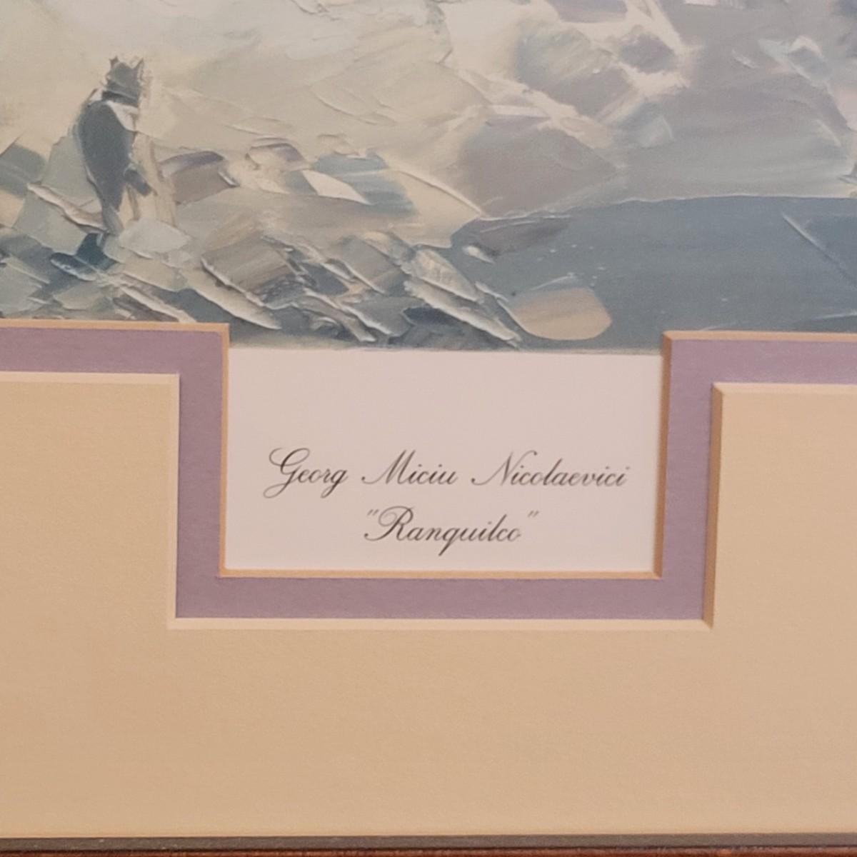An assortment of prints by Georg Miciu Nicolaevici. Two are framed with solid wood frames with a single mat. They are signed by the artist in pen with a personalized message. There are two loose prints included as well. The largest is signed and numbered in pencil and includes a certificate of authenticity and measures approximately 25.5" x 22.5"H. There is a small tear and some marks on the larger print. The smaller print is signed in pen and includes a personalized message. Shipping available. Shipping art can be costly. We suggest contacting our preferred local shipping provider, Postage Express, with dimensions and getting an estimate before bidding: (828) 670-5501 or postageexpress@yahoo.com.