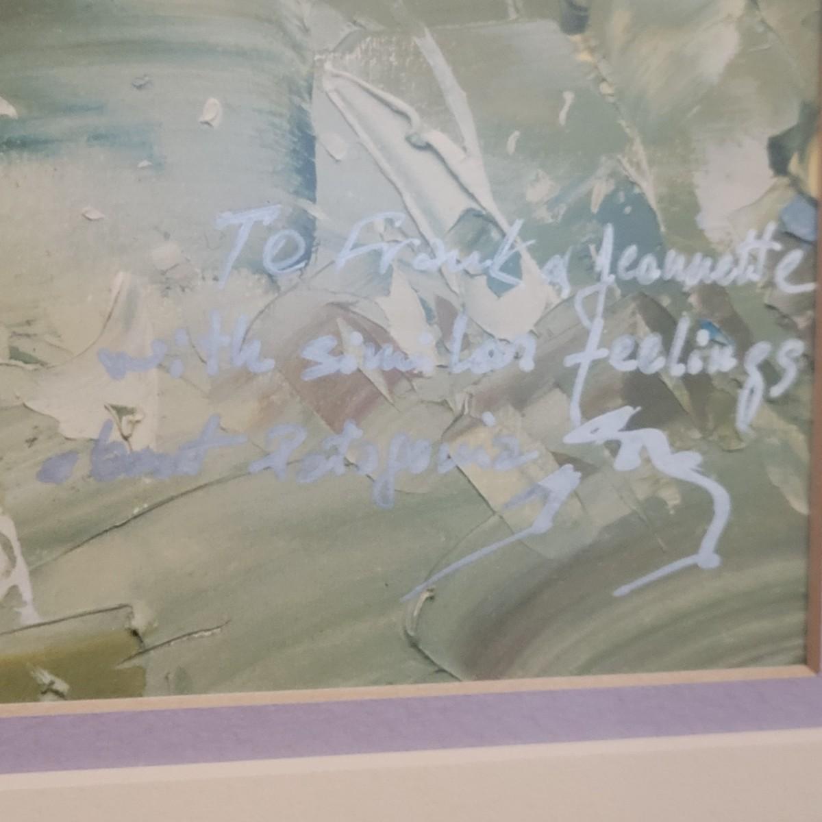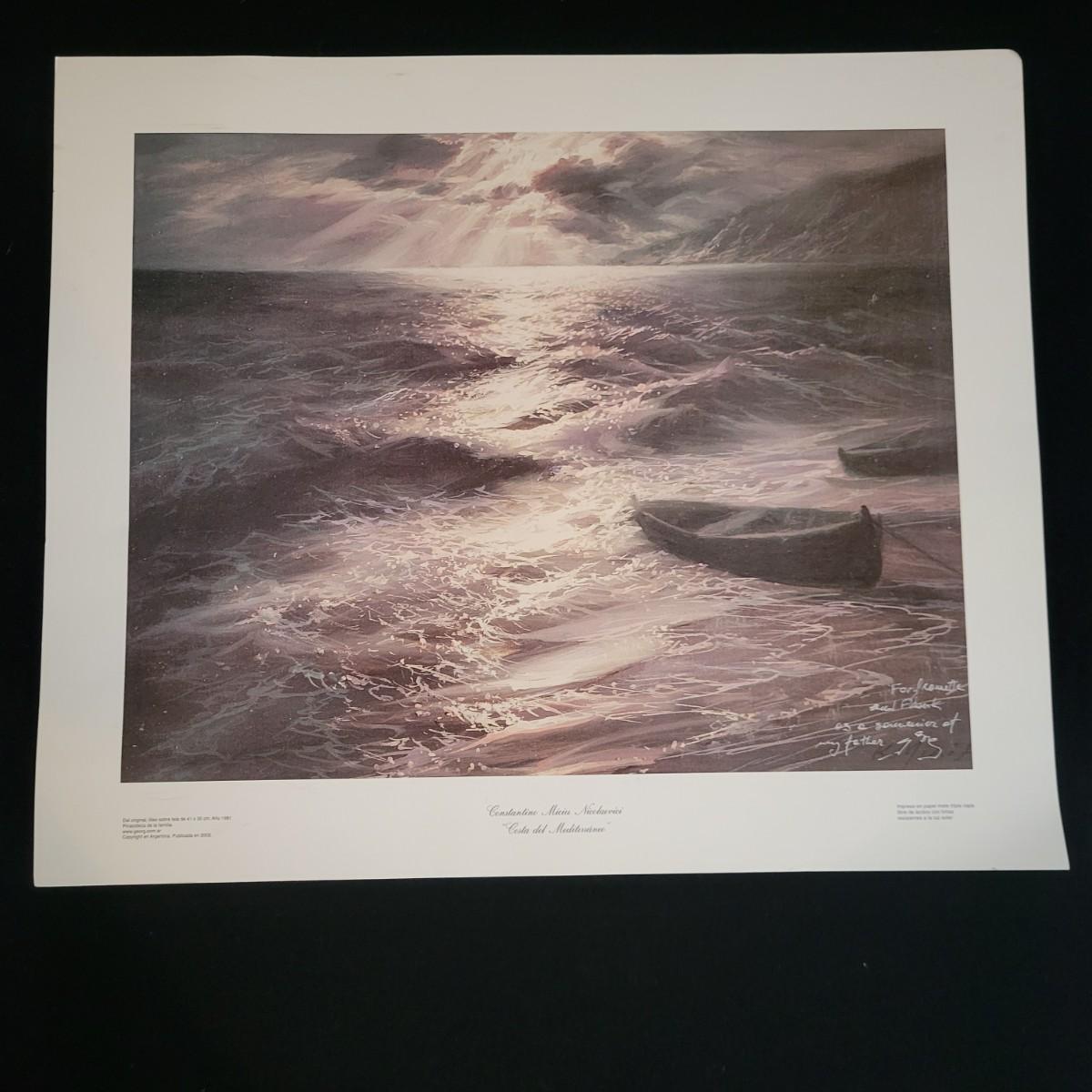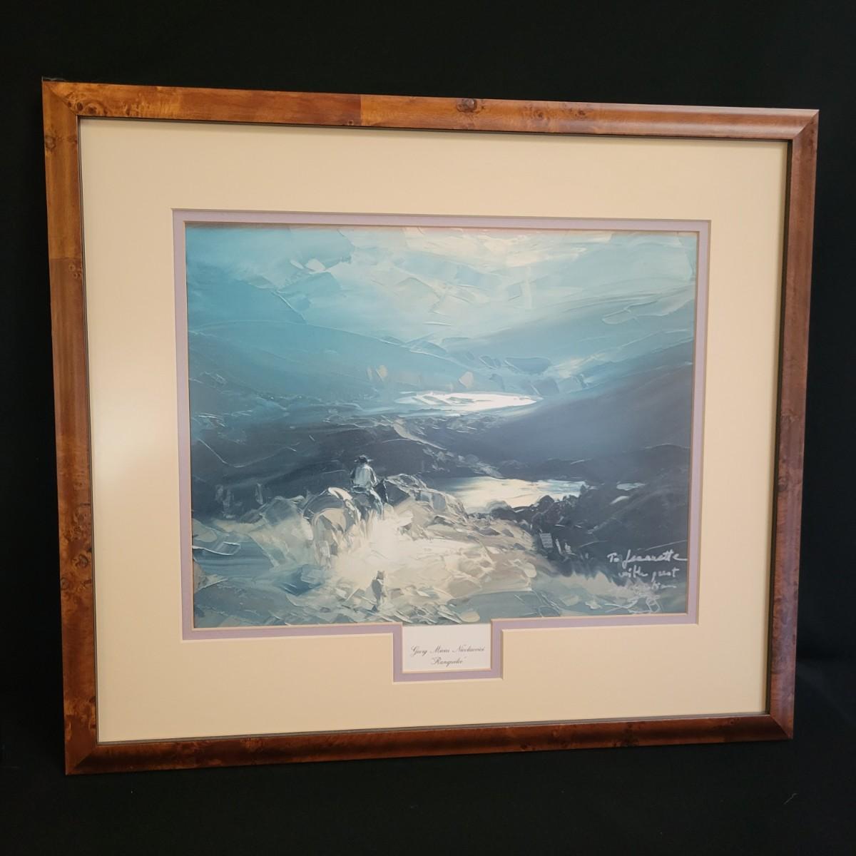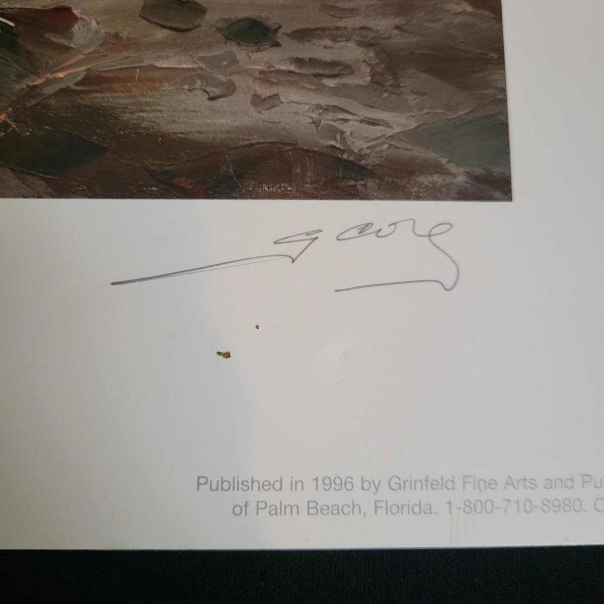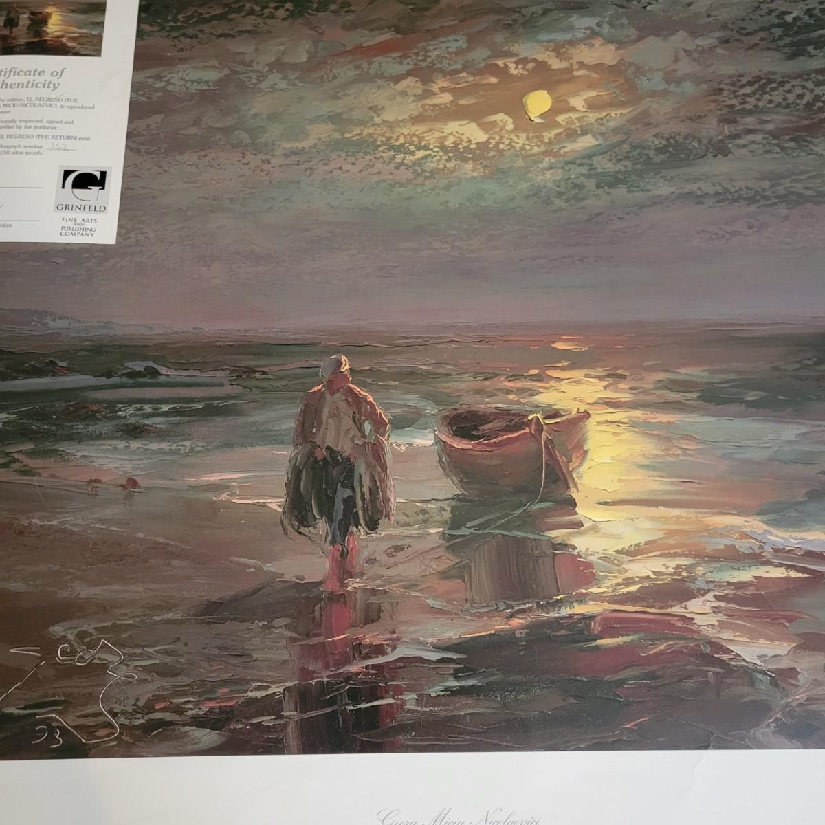 An assortment of prints by Georg Miciu Nicolaevici. Two are framed with solid wood frames with a single mat. They are signed by the artist in pen with a personalized message. There are two loose prints included as well. The largest is signed and numbered in pencil and includes a certificate of authenticity and measures approximately 25.5" x 22.5"H. There is a small tear and some marks on the larger print. The smaller print is signed in pen and includes a personalized message. Shipping available. Shipping art can be costly. We suggest contacting our preferred local shipping provider, Postage Express, with dimensions and getting an estimate before bidding: (828) 670-5501 or postageexpress@yahoo.com.