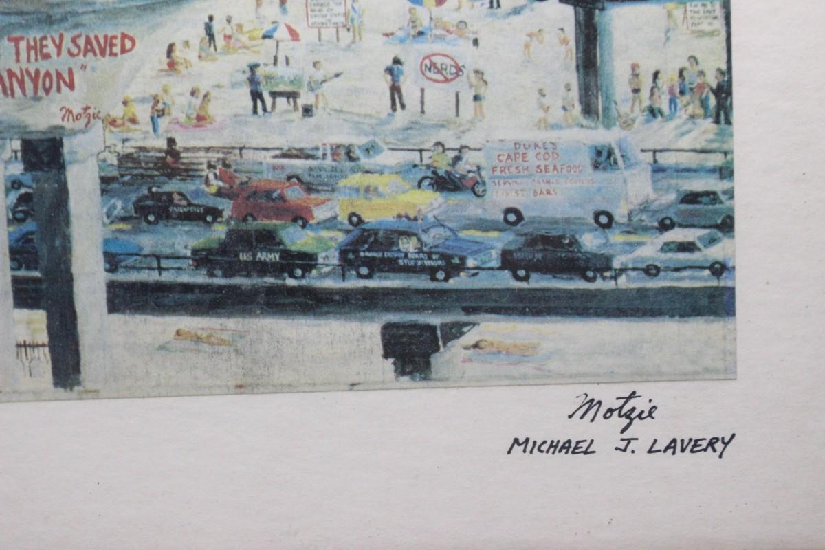 Framed and signed Michael J. Lavery Valley Magazine print artwork for the publication. Signed Motzie Michael J. Lavery in the lower right corner. There is no significant scratches or chips to the frame or protective glass.