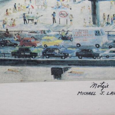 Framed and signed Michael J. Lavery Valley Magazine print artwork for the publication. Signed Motzie Michael J. Lavery in the lower right corner. There is no significant scratches or chips to the frame or protective glass.
