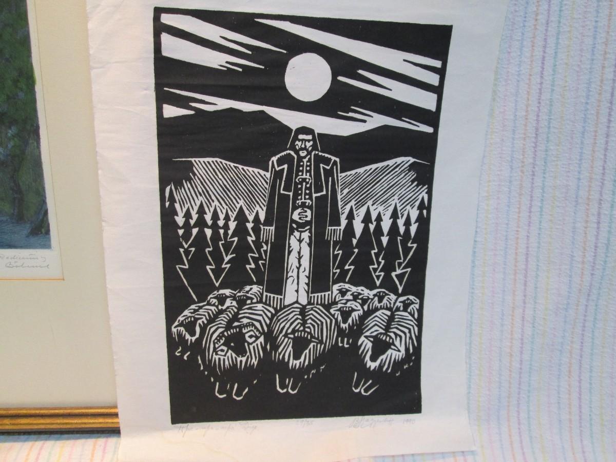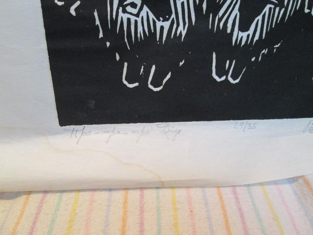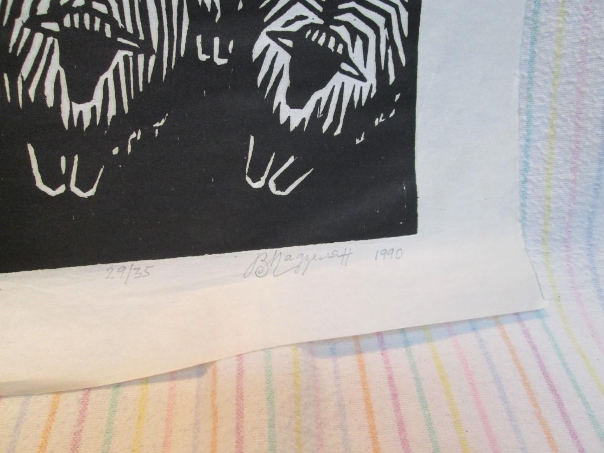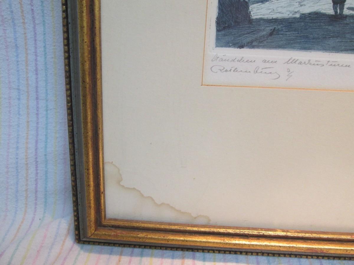 Framed piece is 18" wide x 22 3/4" tall. Has water marks on the edges of the mat.