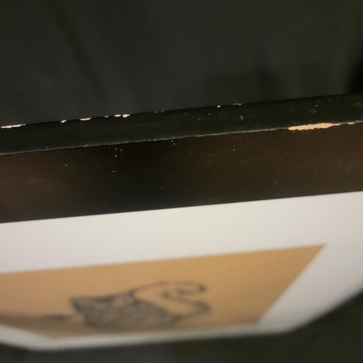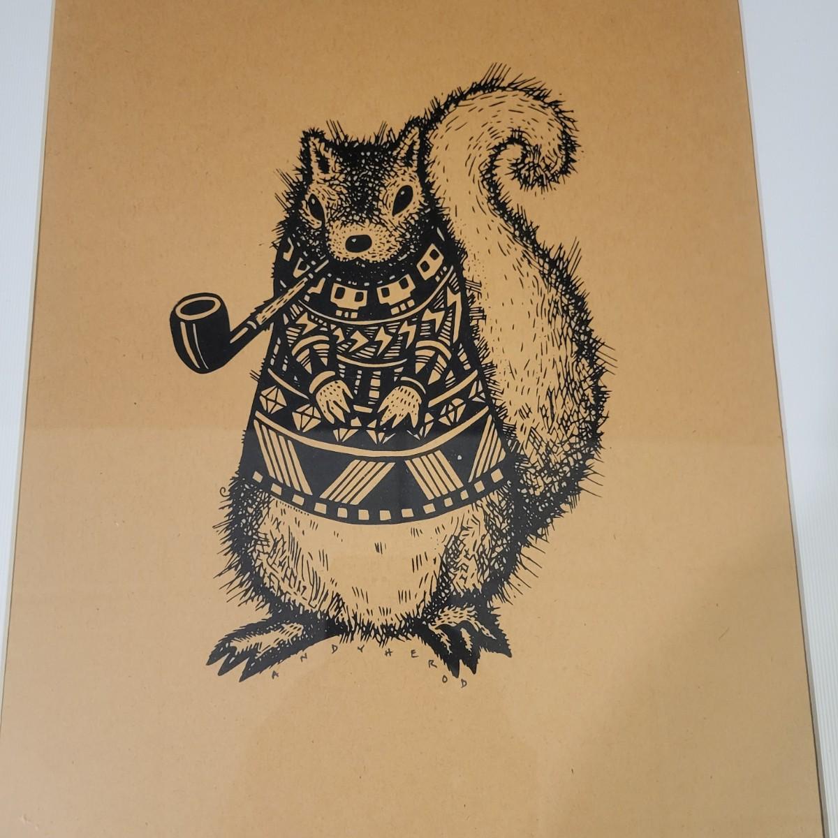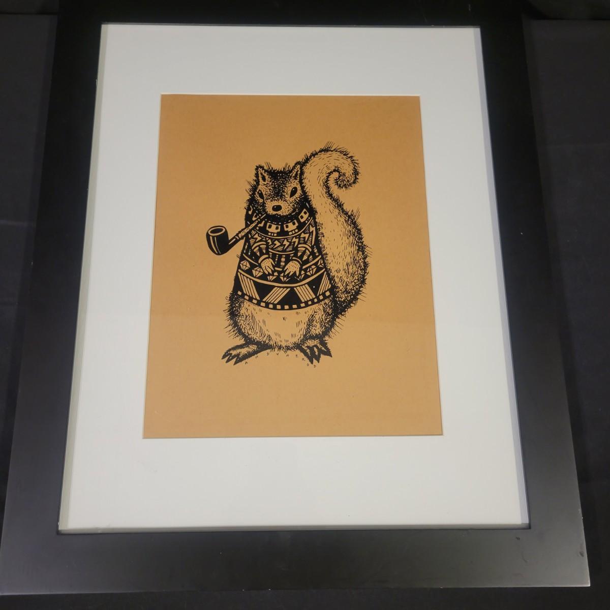 A framed squirrel print that appears to be by local Asheville artist Andy Herod. This is a print of a squirrel in a sweater smoking a pipe. Measures approximately 19" x .5" x 23"H. The frame has some scratches and blemishes; see pictures. Shipping available. Shipping art can be costly. We suggest contacting our preferred local shipping provider, Postage Express, with dimensions and getting an estimate before bidding: (828) 670-5501 or postageexpress@yahoo.com.