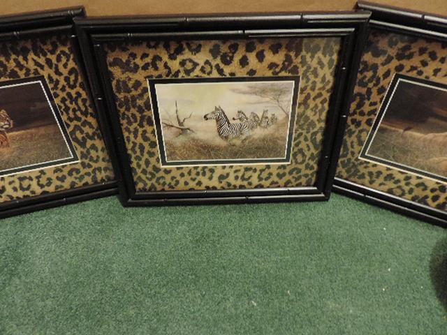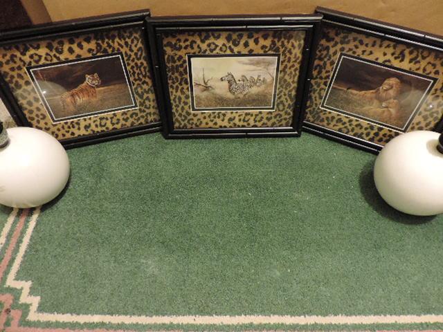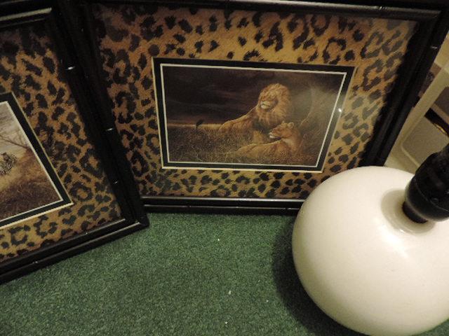 3 PICTURES 10"X11" ZEBRA-TIGER-LION AND 2 SMALL POT TABLE LAMPS