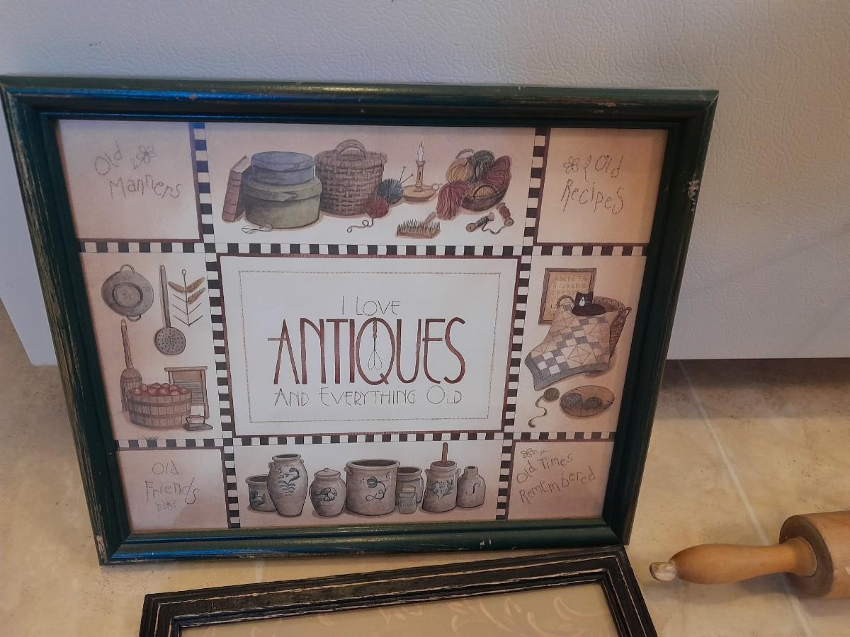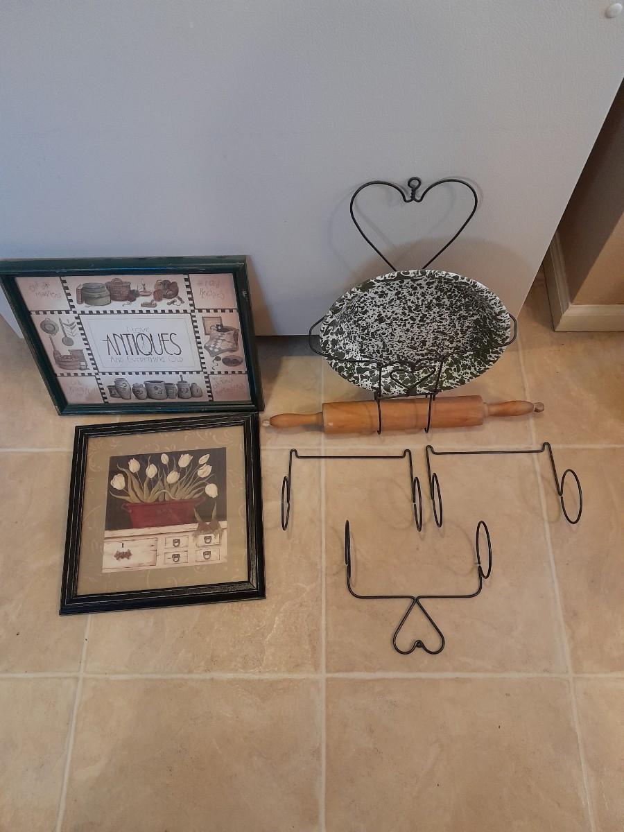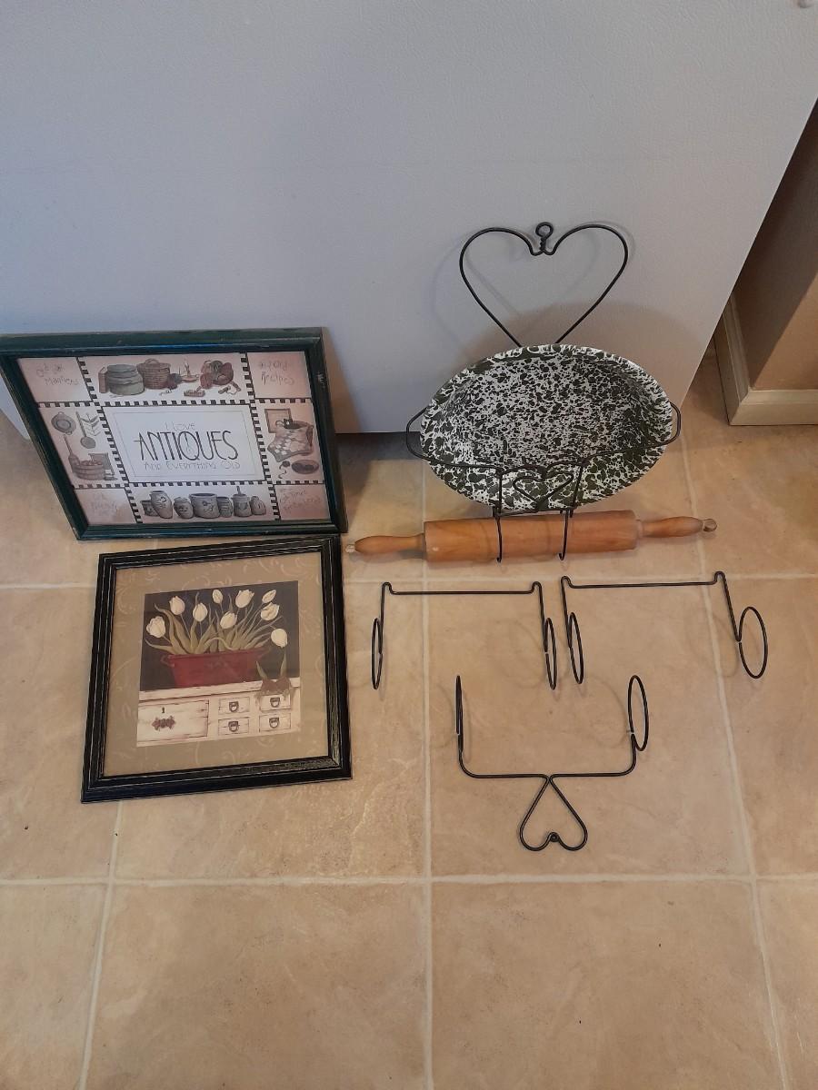 FRAMED ANTIQUE PICTURE, FRAMED FLORAL WALL ART, AND HANGING ORGANIZER CONTAINING AN ENAMEL PLATE AND WOODEN ROLLING PIN