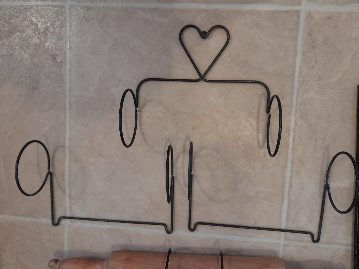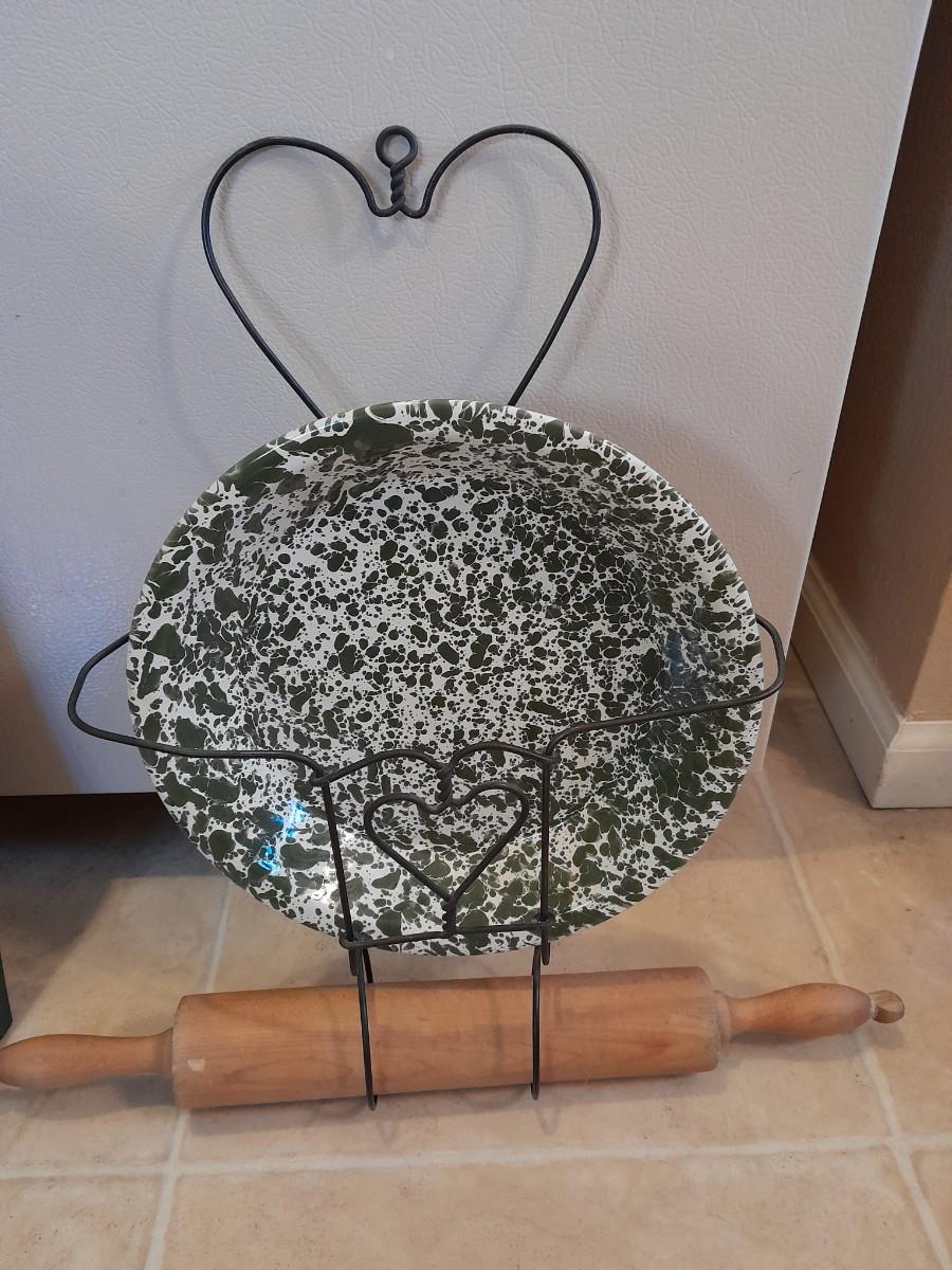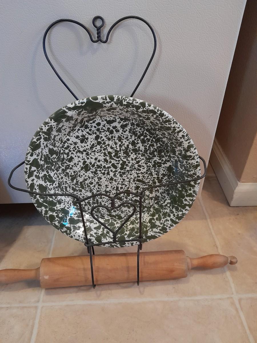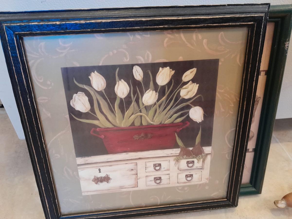 FRAMED ANTIQUE PICTURE, FRAMED FLORAL WALL ART, AND HANGING ORGANIZER CONTAINING AN ENAMEL PLATE AND WOODEN ROLLING PIN