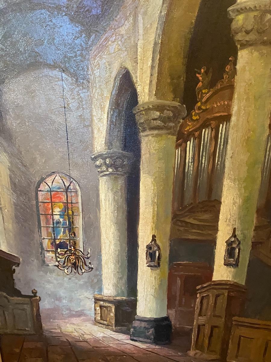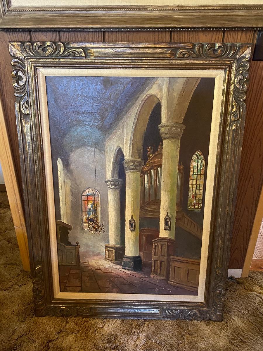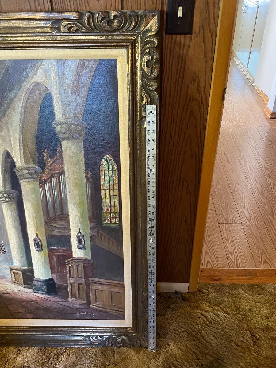 Framed art of a archway entry or room, maybe a castle or church. Signed in lower corner. Large about 45"x33".