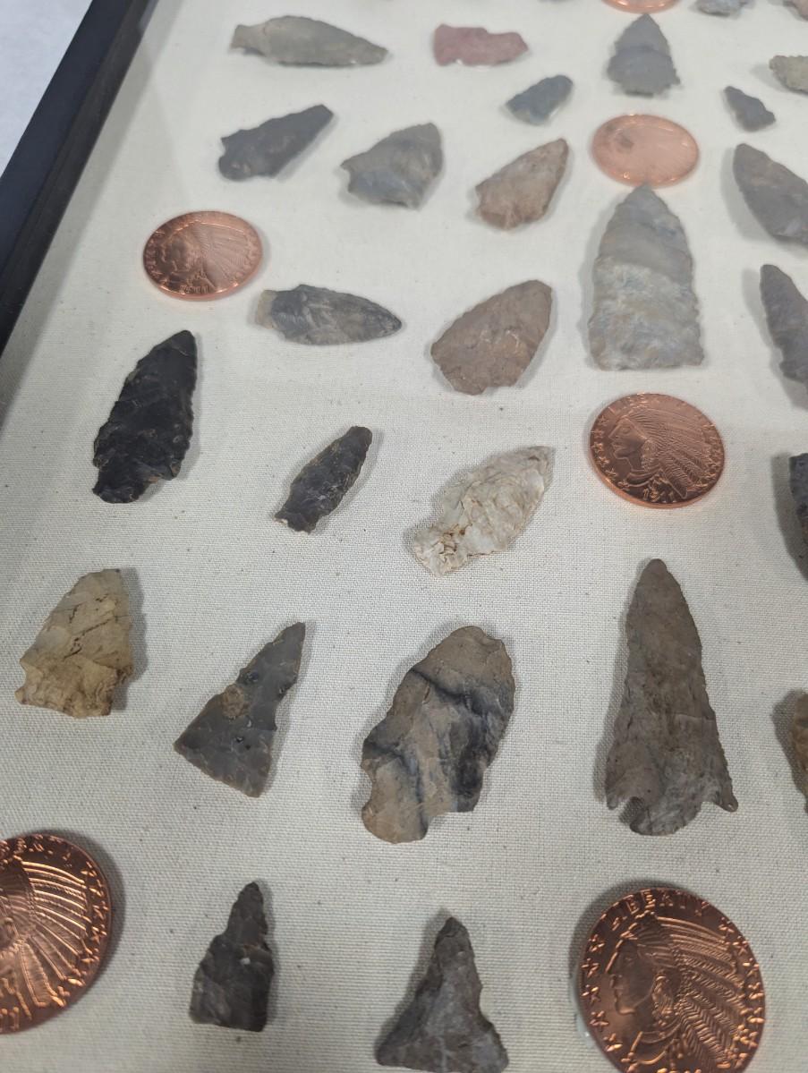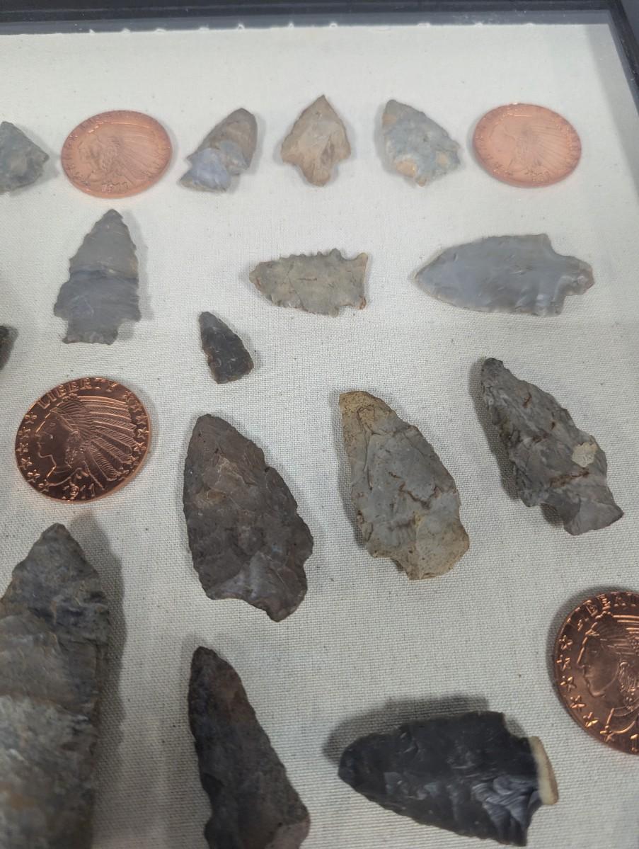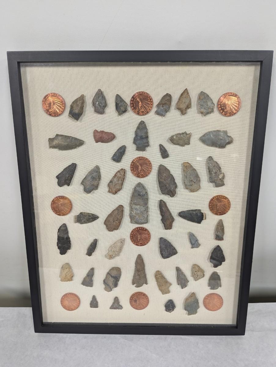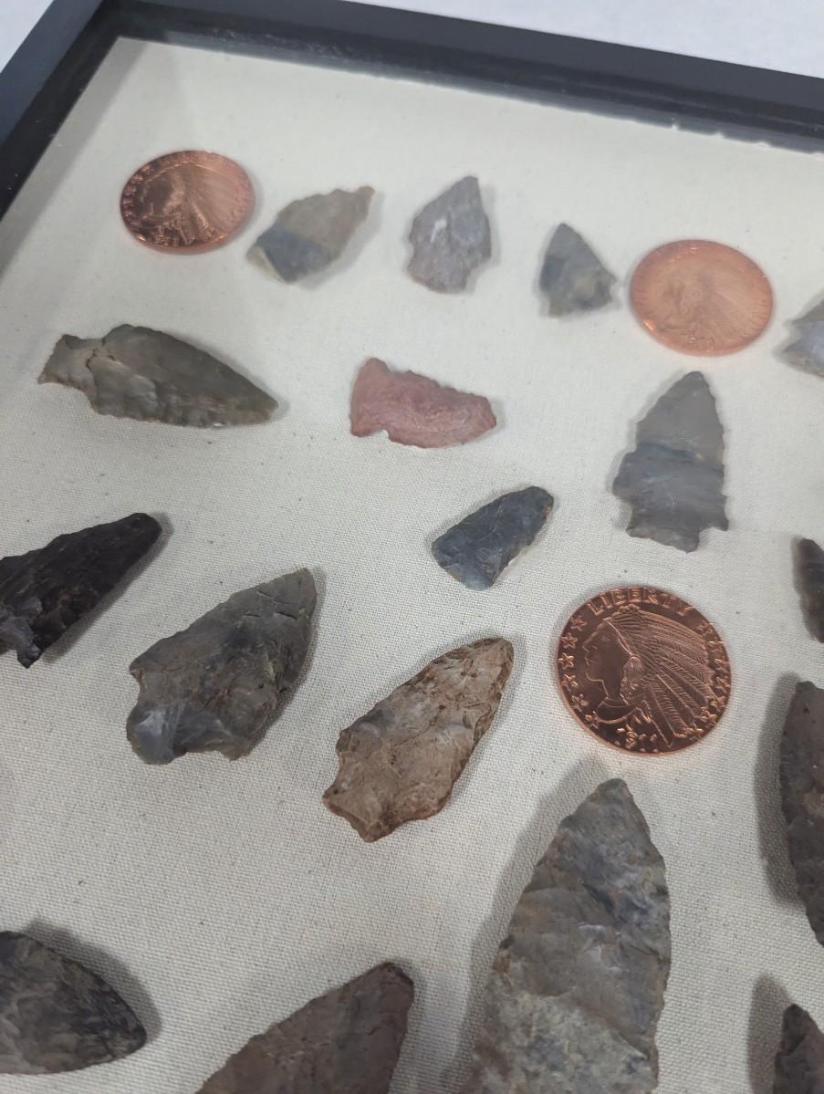 Framed Arrow Head & Native American Indian Head Copper Rounds