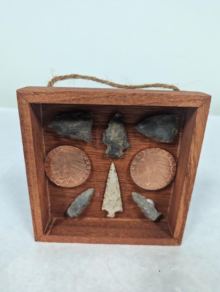 Framed Arrow Head & Native American Indian Head Copper Rounds