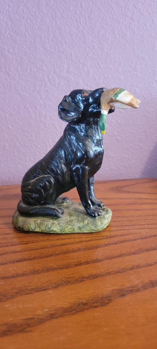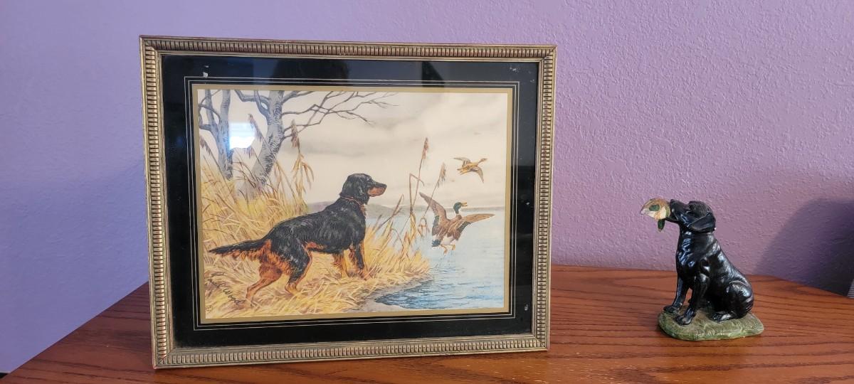 Two vintage pieces, retriever dog figurine and framed art