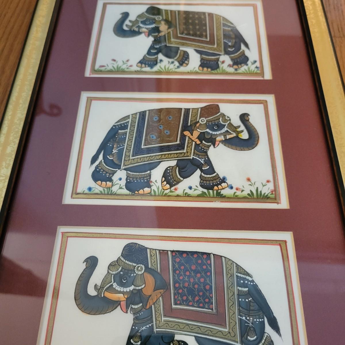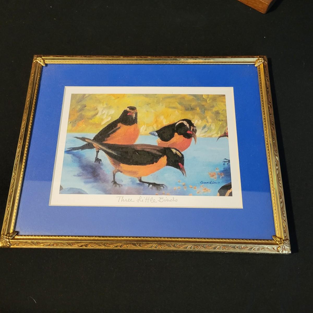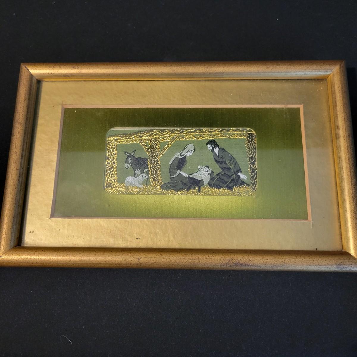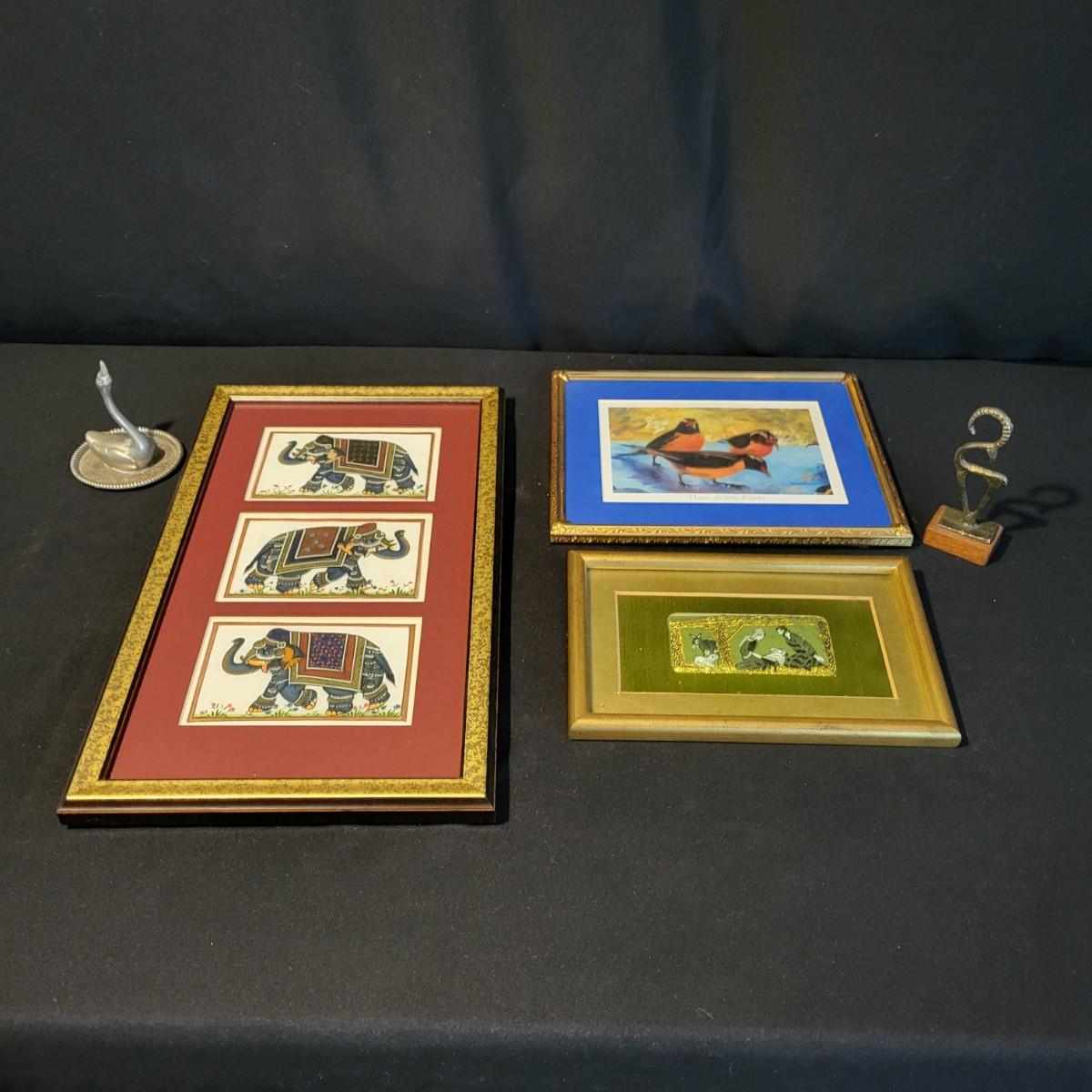 Three small pieces of framed art in good condition. One piece is a manger scene with metallic accents framed in a wooden frame. Another is a print of Three Little Birds framed in metal, tabletop frame. The last piece is three hand painted elephants, custom framed in a wooden frame. Also included in the lot are two small figurines. One is an Ibex made of metal with a wooden base. The final piece is a swan sitting on a silver-colored platter. The last framed piece measures approximately 16" x 9.5" x 1". Shipping available. Shipping Art can be costly please call UPS store at 828-252-6930 for quote.