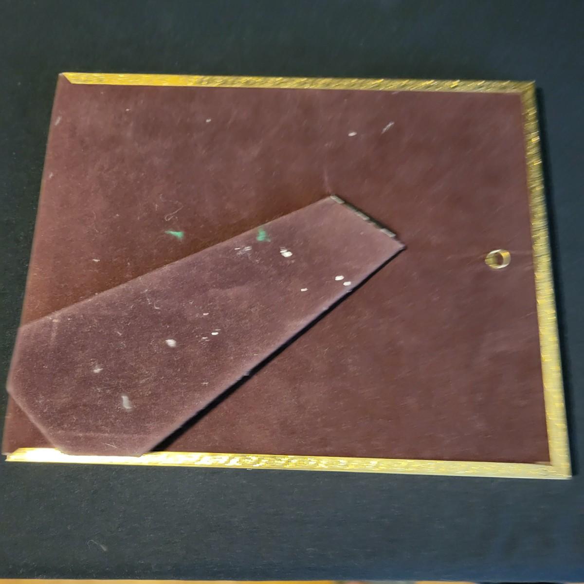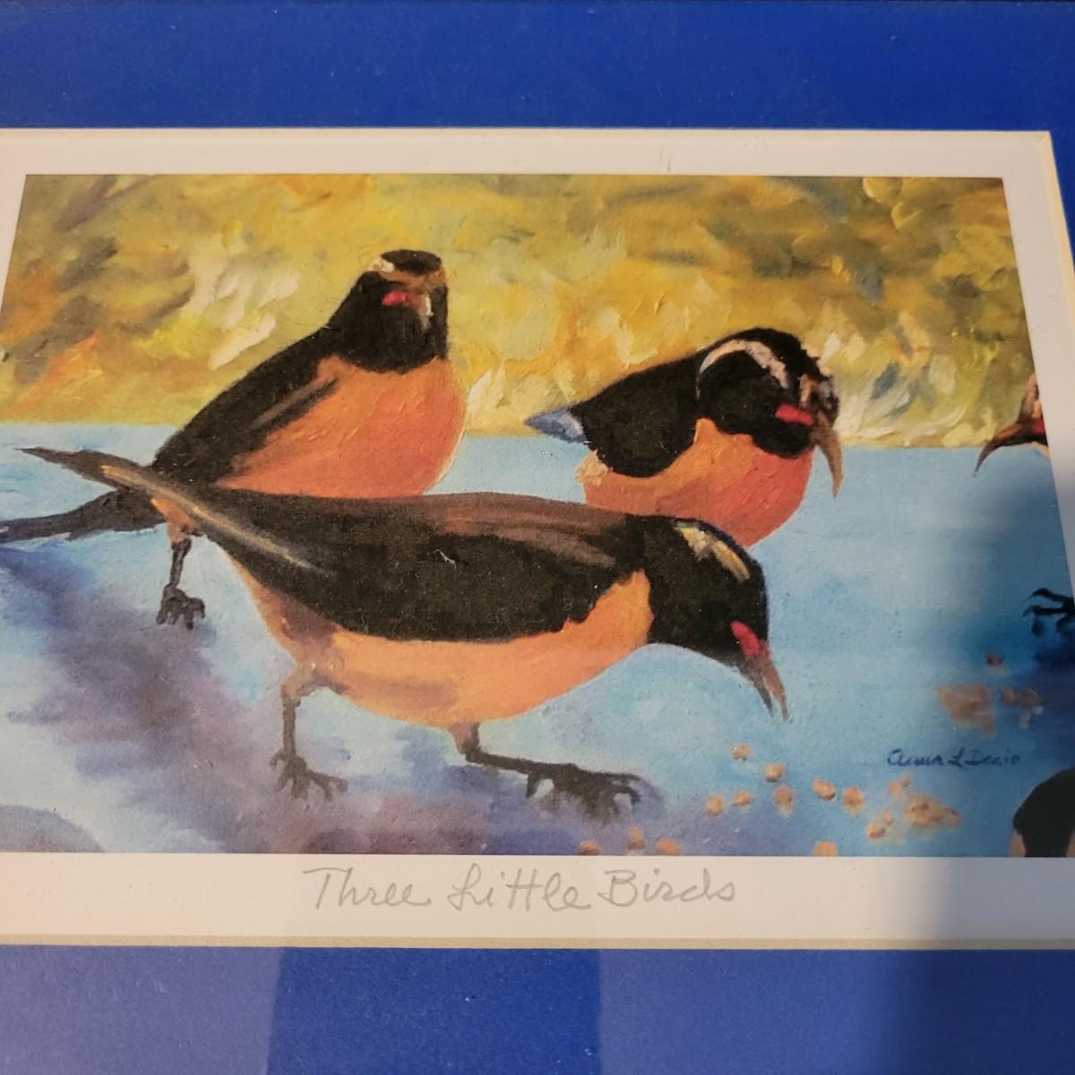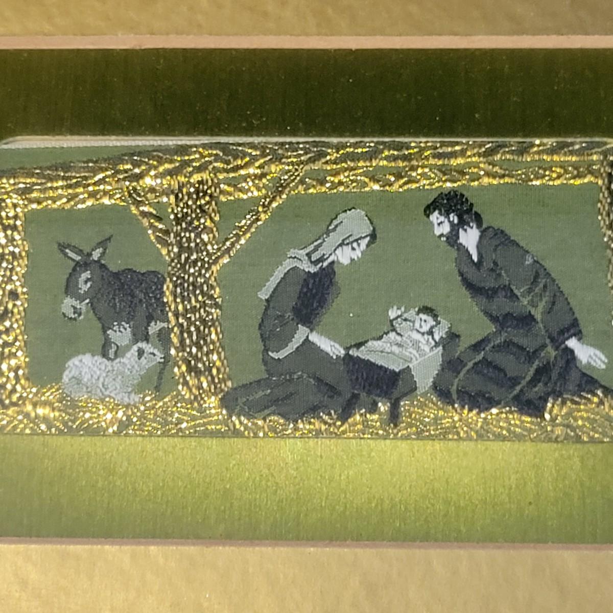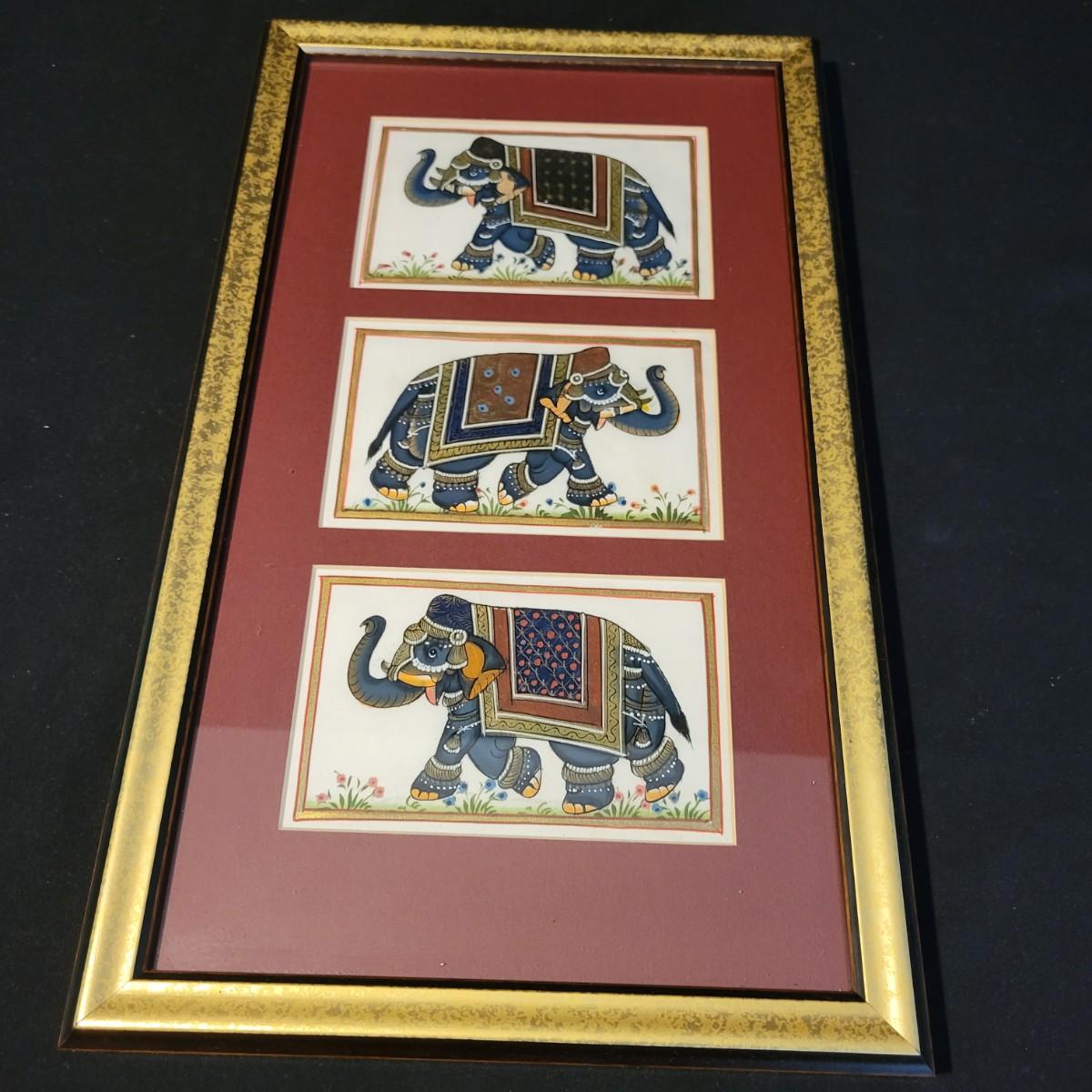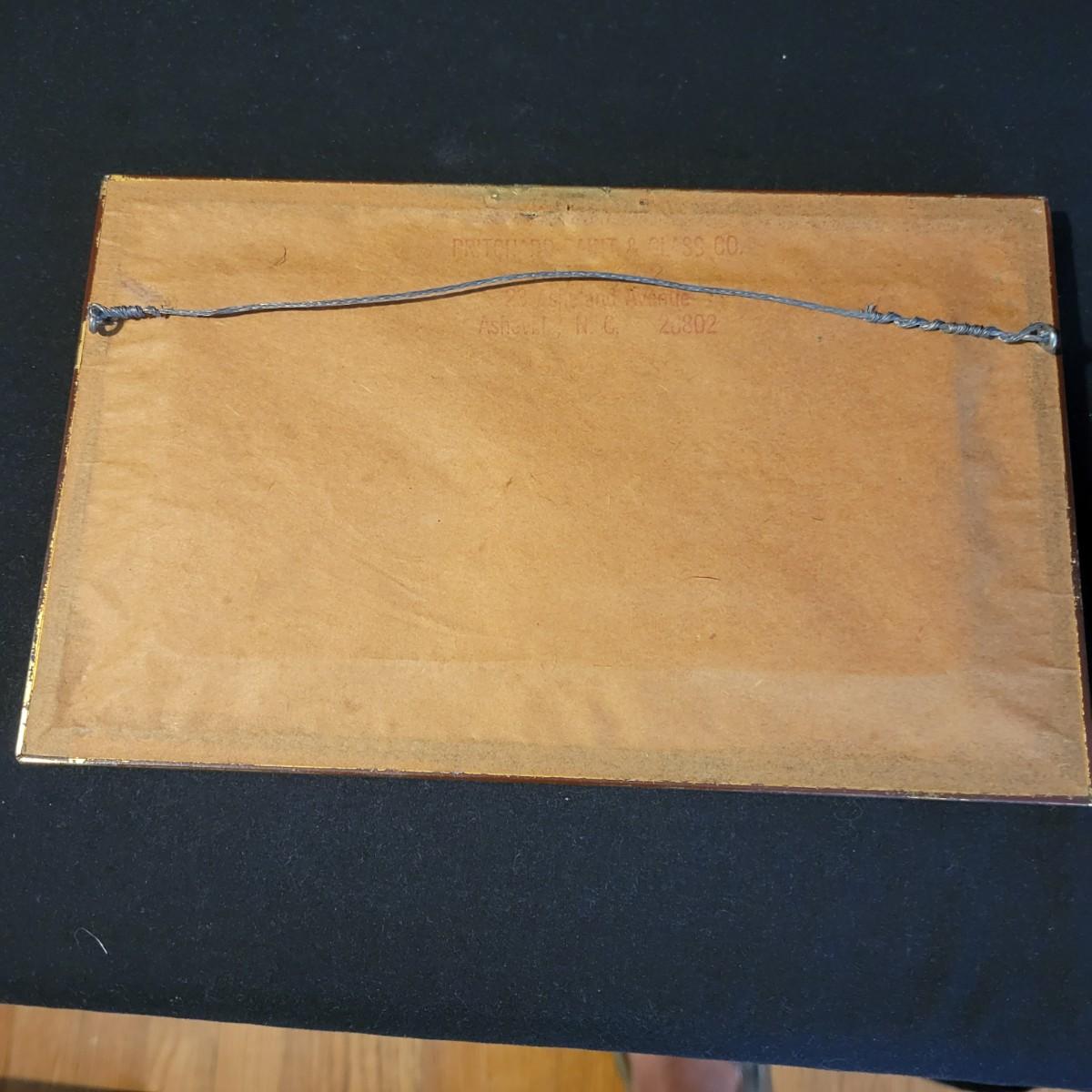 Three small pieces of framed art in good condition. One piece is a manger scene with metallic accents framed in a wooden frame. Another is a print of Three Little Birds framed in metal, tabletop frame. The last piece is three hand painted elephants, custom framed in a wooden frame. Also included in the lot are two small figurines. One is an Ibex made of metal with a wooden base. The final piece is a swan sitting on a silver-colored platter. The last framed piece measures approximately 16" x 9.5" x 1". Shipping available. Shipping Art can be costly please call UPS store at 828-252-6930 for quote.