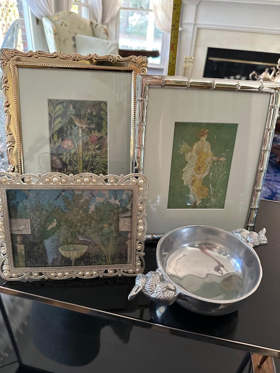 3 SMALL FRAMED ART PIECES, DECORATIVE BUNNY DISH