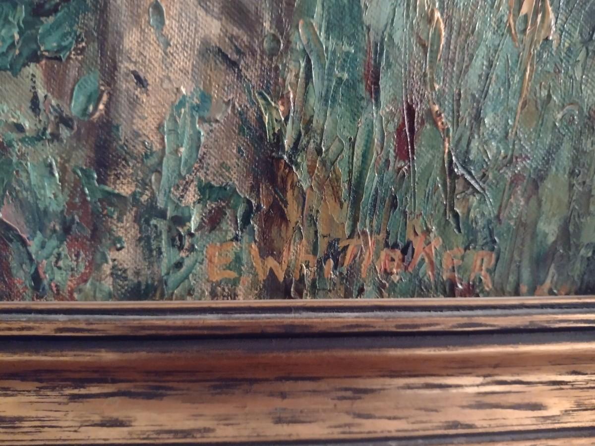 Framed Art by E. Whittaker. Appears to be original oil painting on canvas. Measures approx 28" x 34".