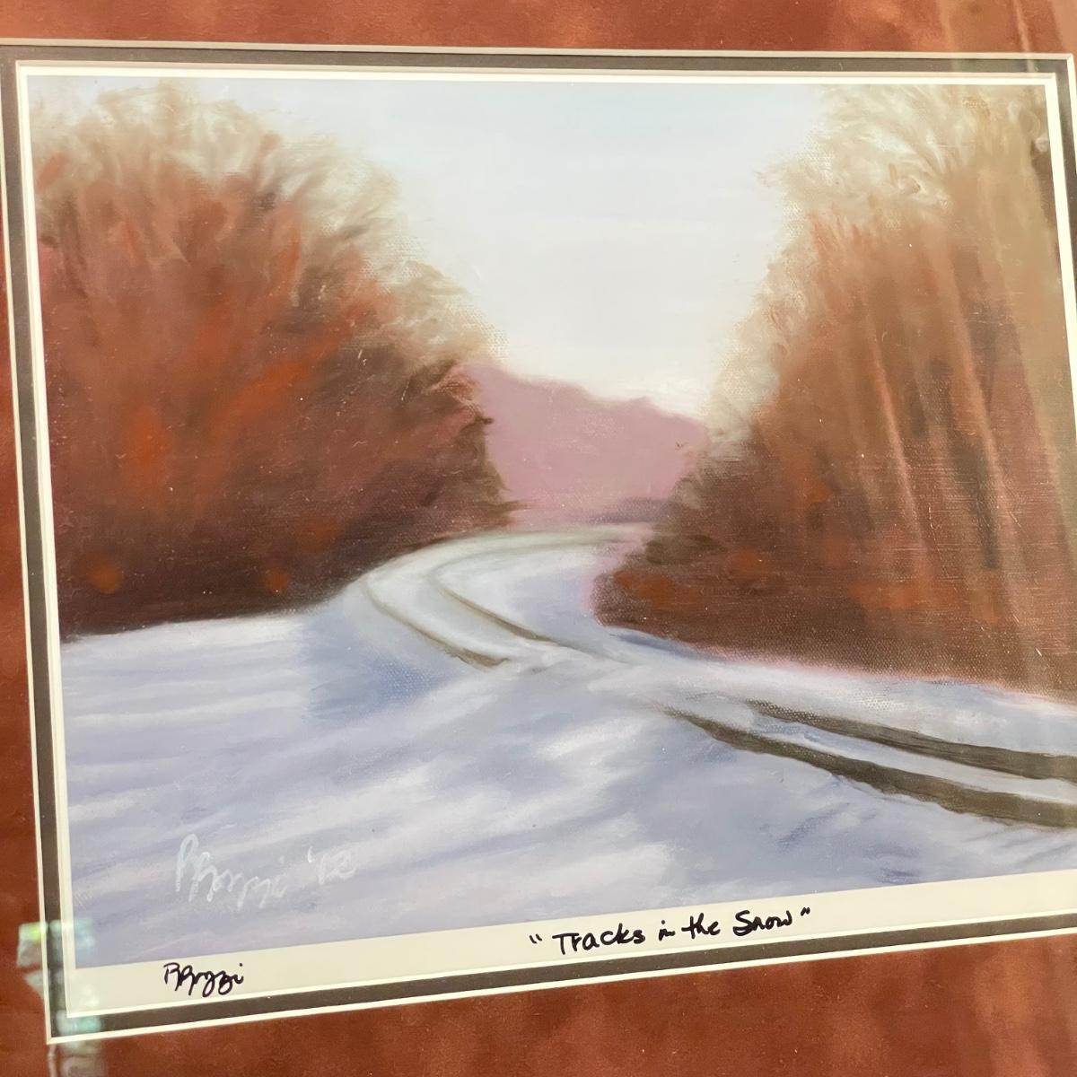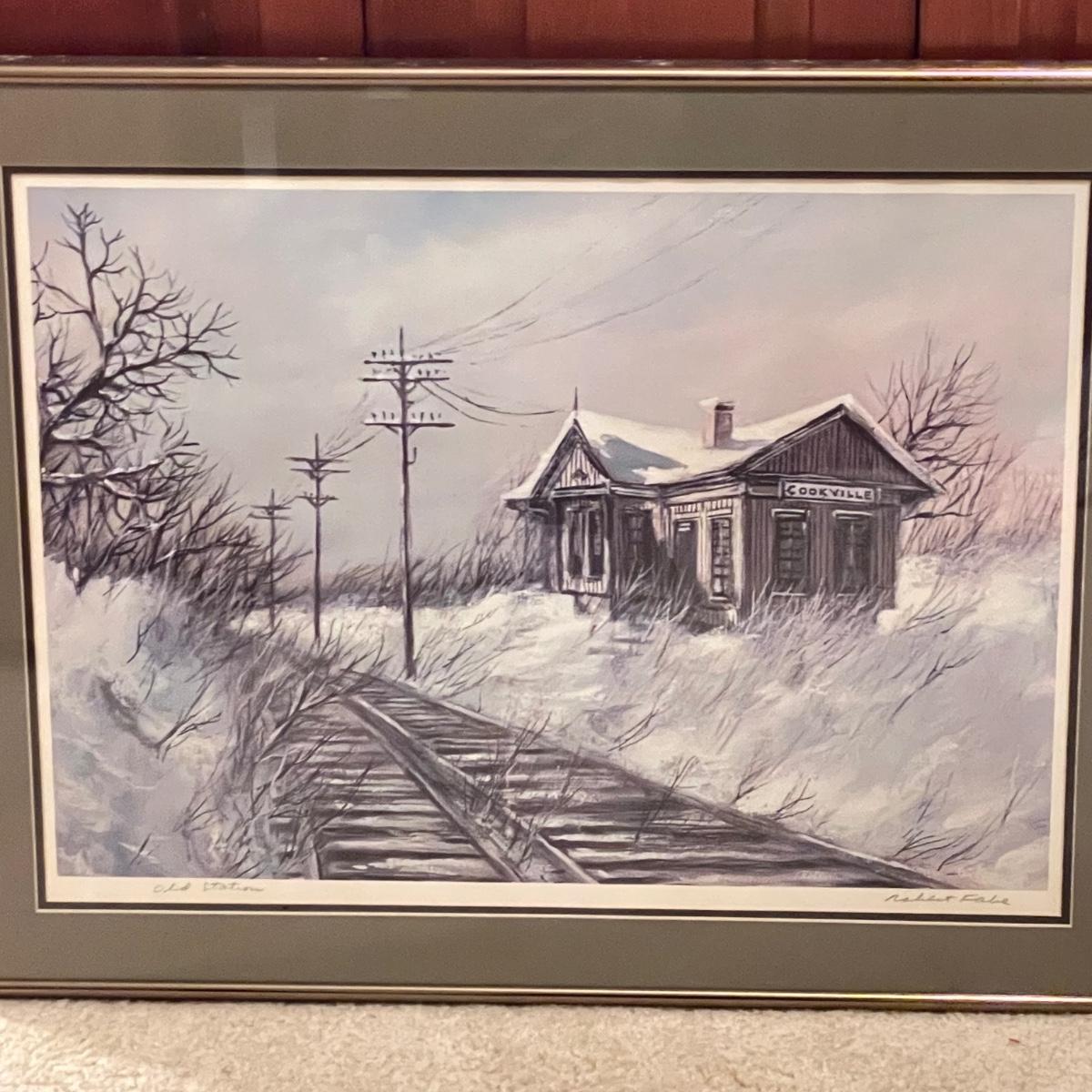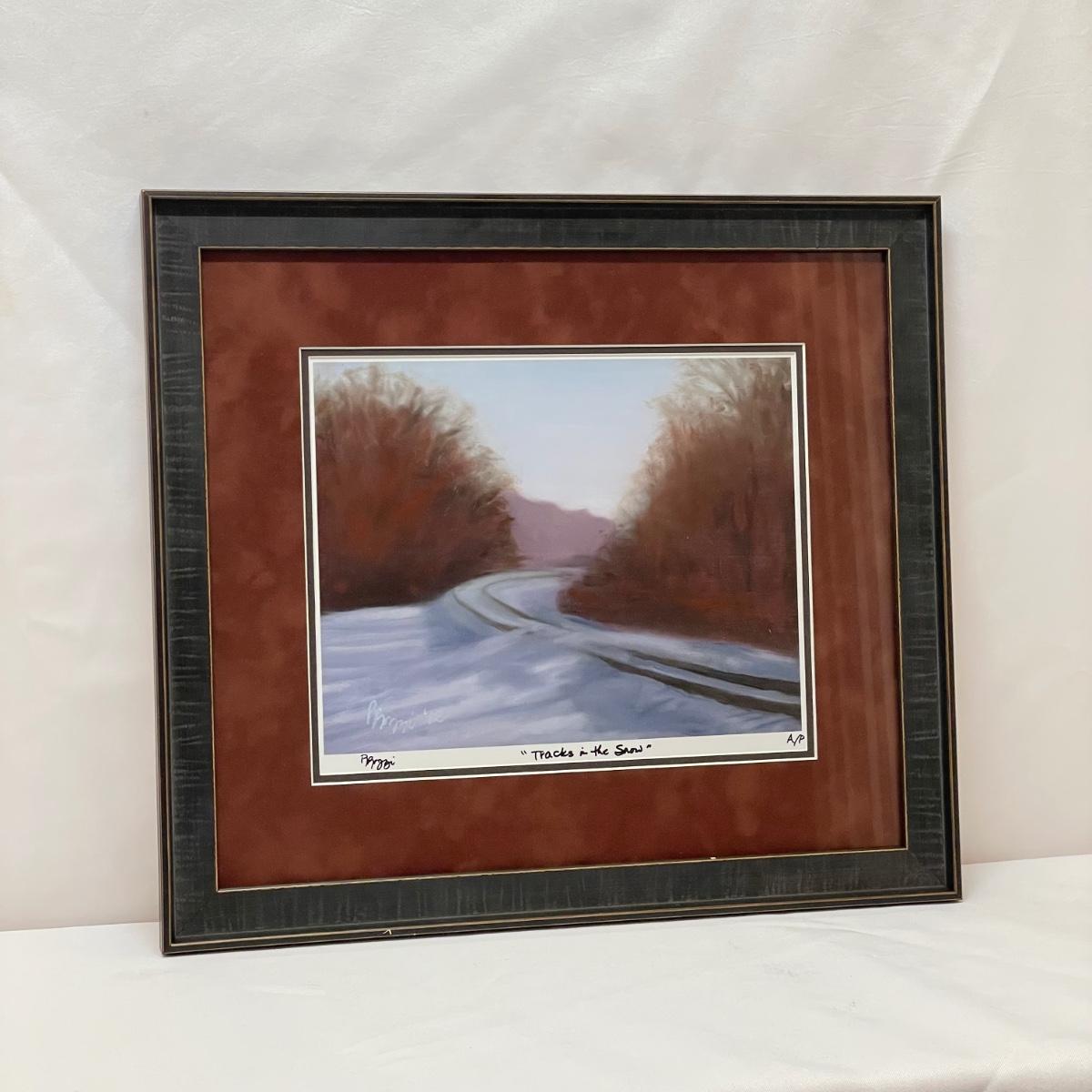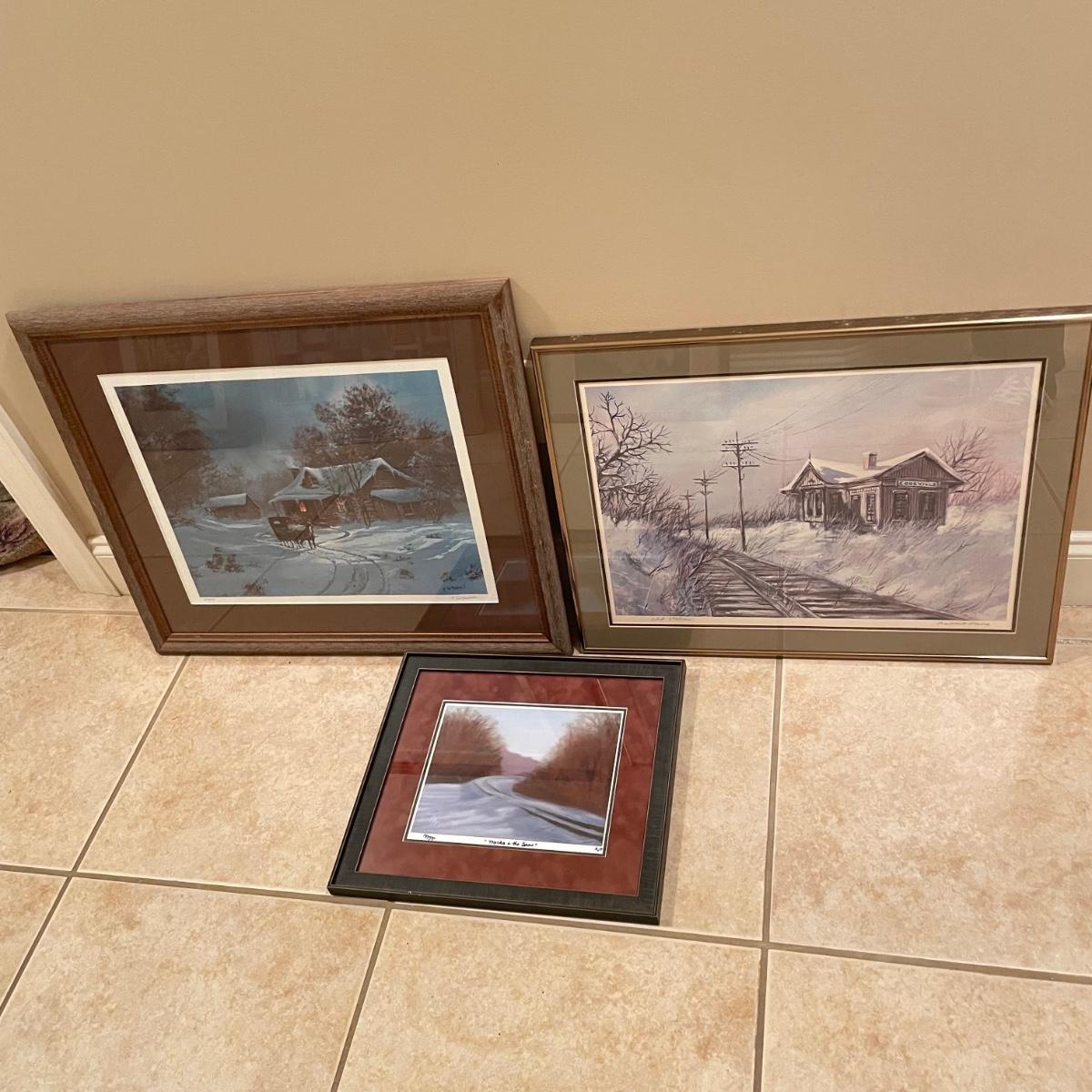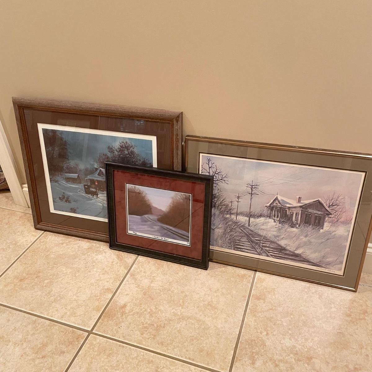 Three snowy art pieces, all matted and under glass. “Tracks in the Snow” has a signature with permanent marker stating R Rozzi, and appears to be a. A/P. Print. This one is double-matted in a wood frame measuring 16.5” x 14.5”. Next art appears to be pencil signed Old Station and Robert Fabe. This piece is also double matted in a metal frame measuring 24.5” x 19.25”. Lastly, another piece that appears pencil signed and numbered by Ted Blaylock. This one has a single mat and measures 26.75” x 22.75”. Shipping available. Shipping can be costly. We suggest contacting our preferred local shipping provider, Postage Express, with dimensions and getting an estimate before bidding: (828) 255-9250 or email shipping@postageexpressnc.com