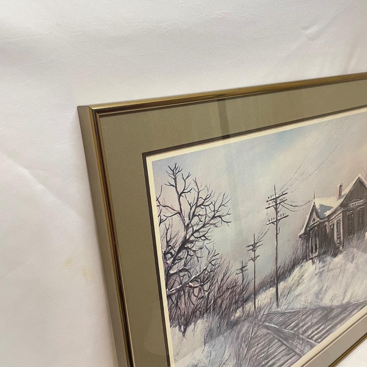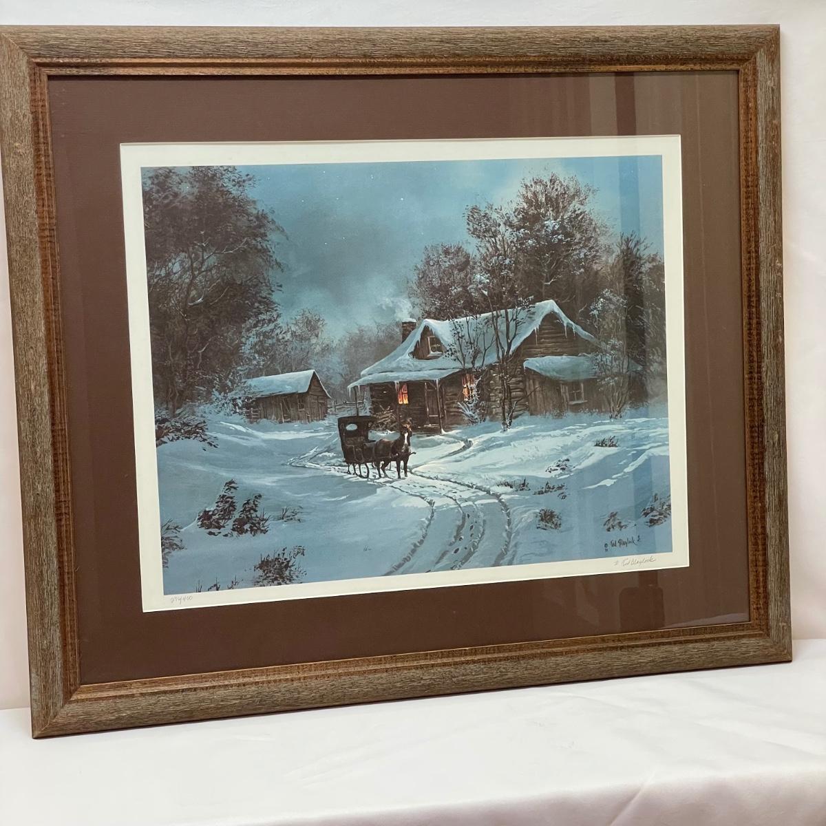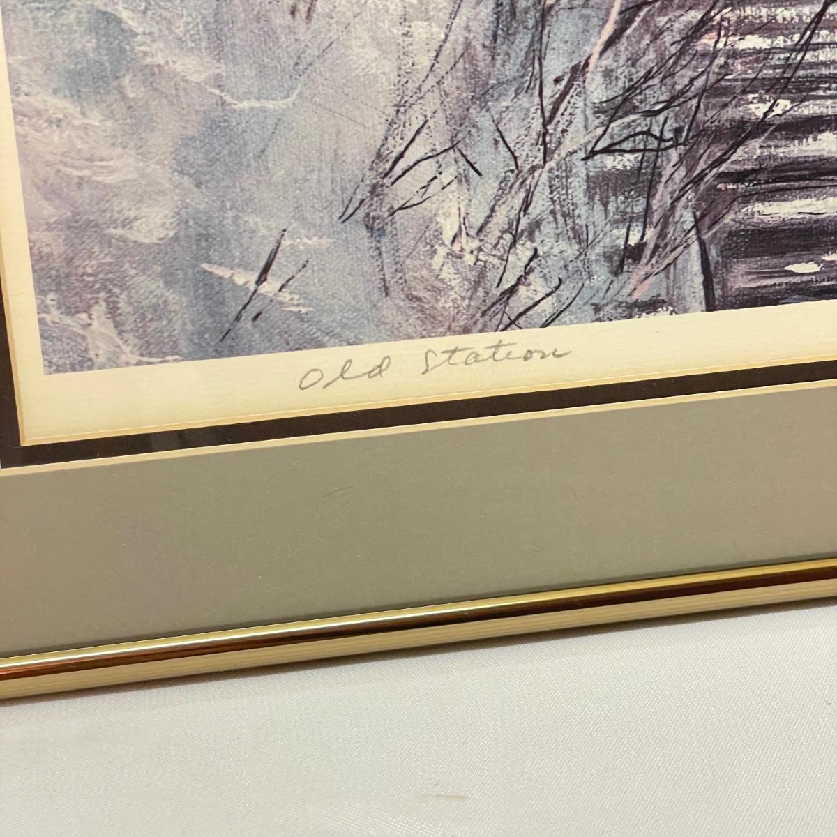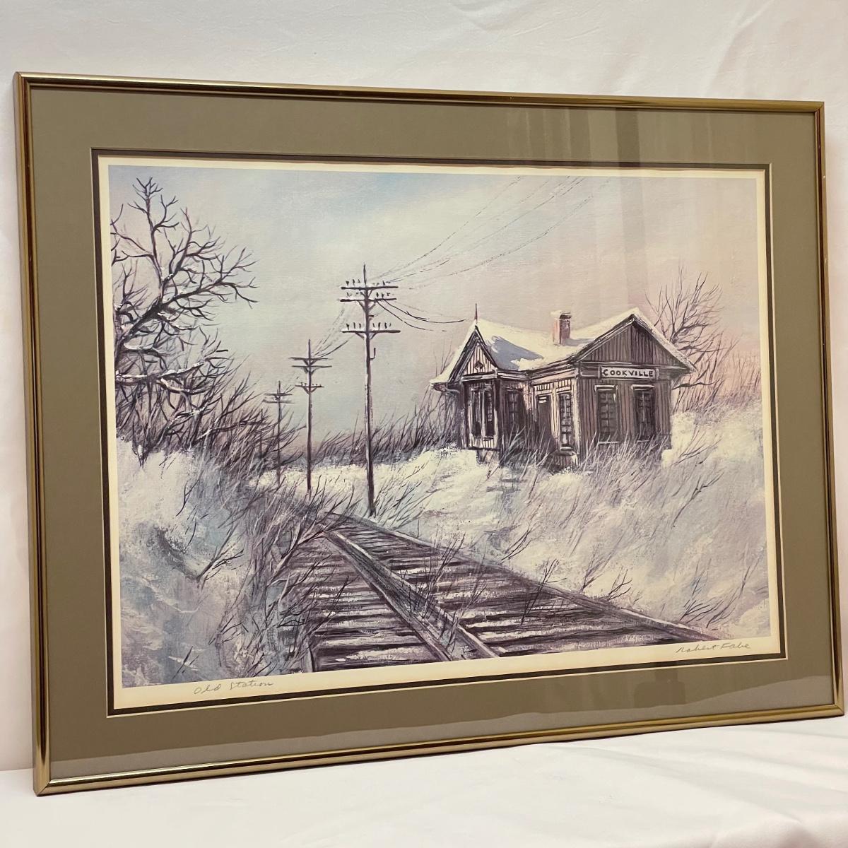 Three snowy art pieces, all matted and under glass. “Tracks in the Snow” has a signature with permanent marker stating R Rozzi, and appears to be a. A/P. Print. This one is double-matted in a wood frame measuring 16.5” x 14.5”. Next art appears to be pencil signed Old Station and Robert Fabe. This piece is also double matted in a metal frame measuring 24.5” x 19.25”. Lastly, another piece that appears pencil signed and numbered by Ted Blaylock. This one has a single mat and measures 26.75” x 22.75”. Shipping available. Shipping can be costly. We suggest contacting our preferred local shipping provider, Postage Express, with dimensions and getting an estimate before bidding: (828) 255-9250 or email shipping@postageexpressnc.com