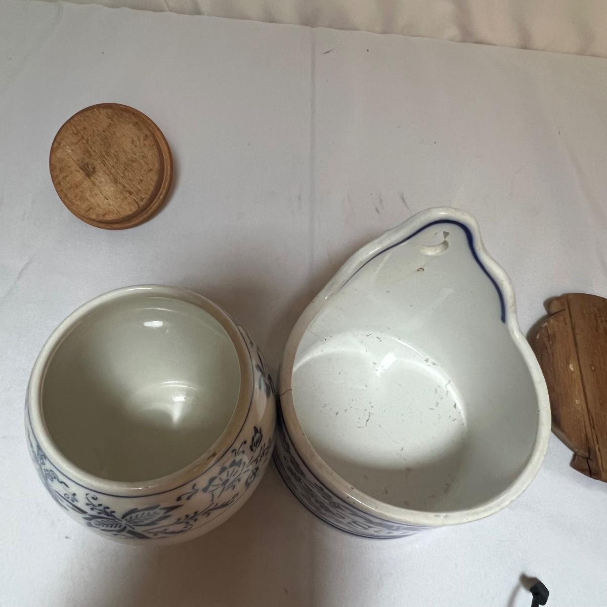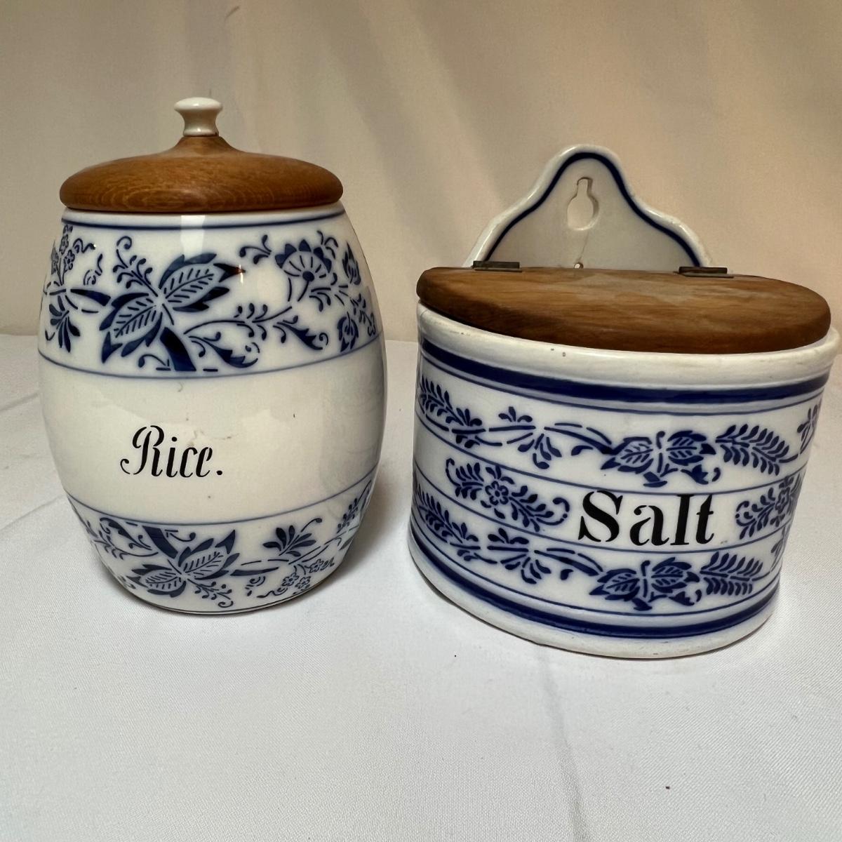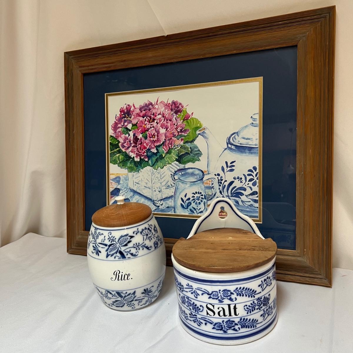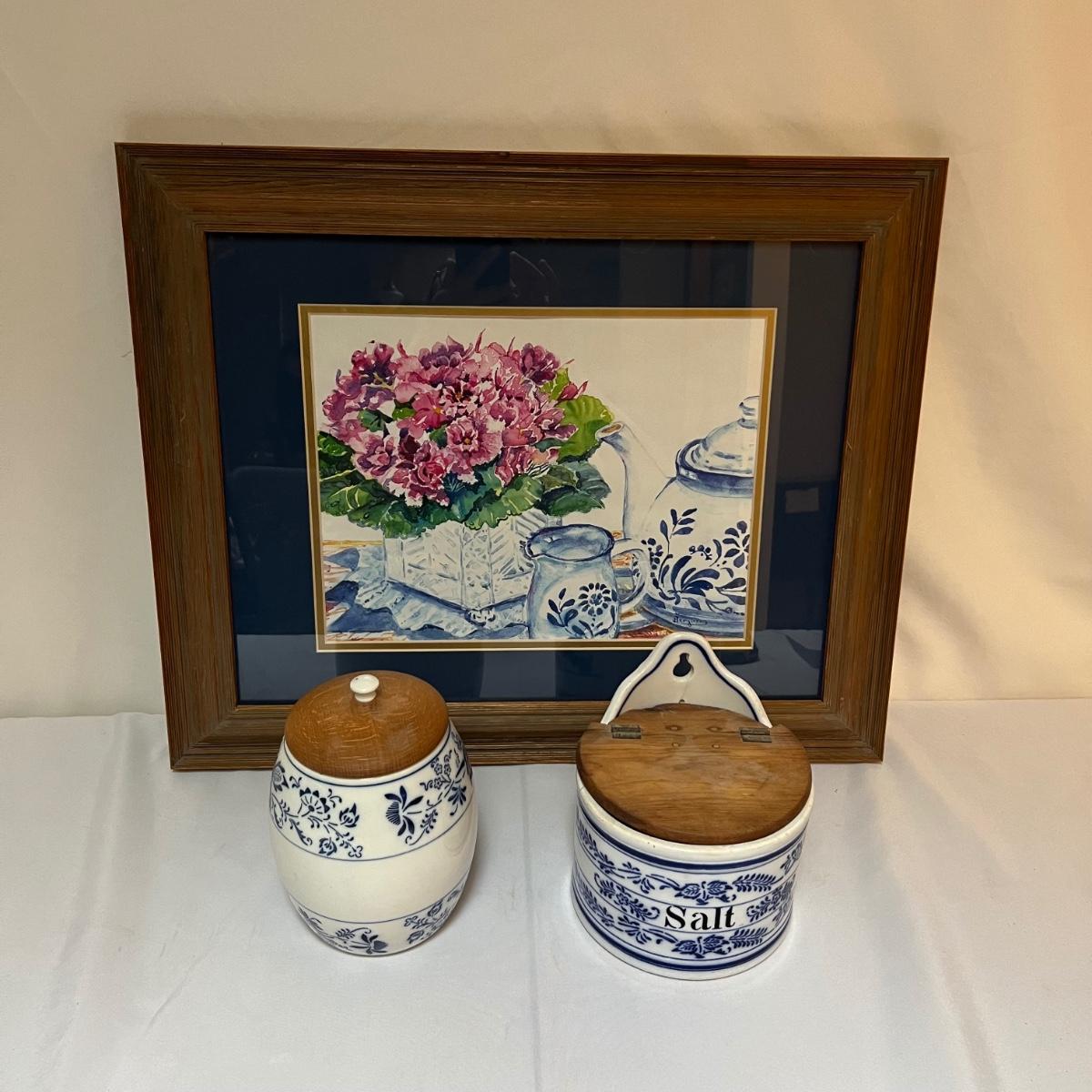 This framed piece of floral art is under glass, matted and mounted in a wooden frame; frame measures 22” x 2” x 19”H. It has a stamped signature; note the frame has a small nick, see image. The two canisters are ceramic with wooden tops. The salt container can be hung on the wall; note that it has a hairline crack which should not affect its