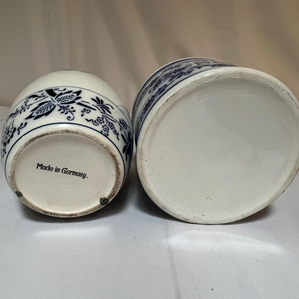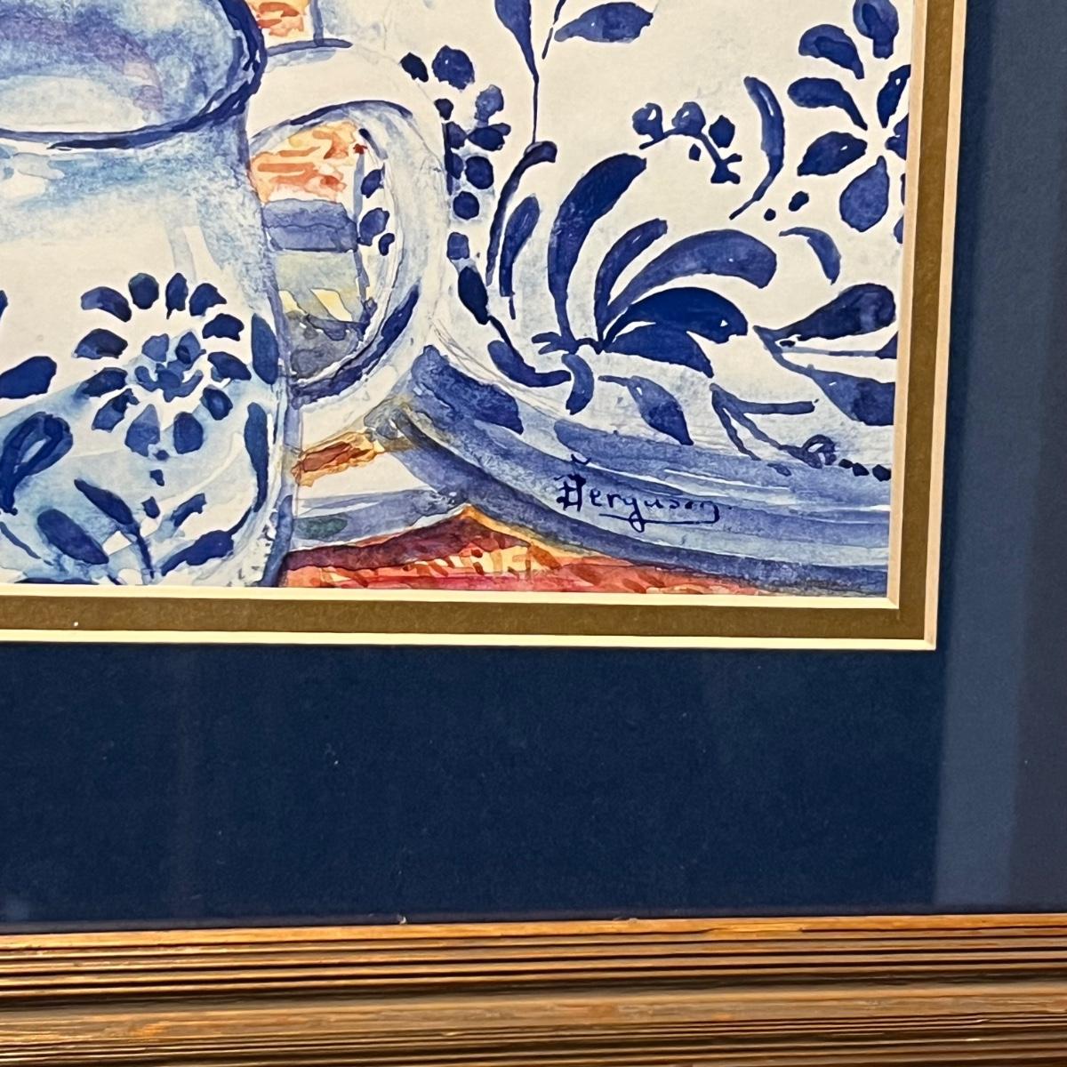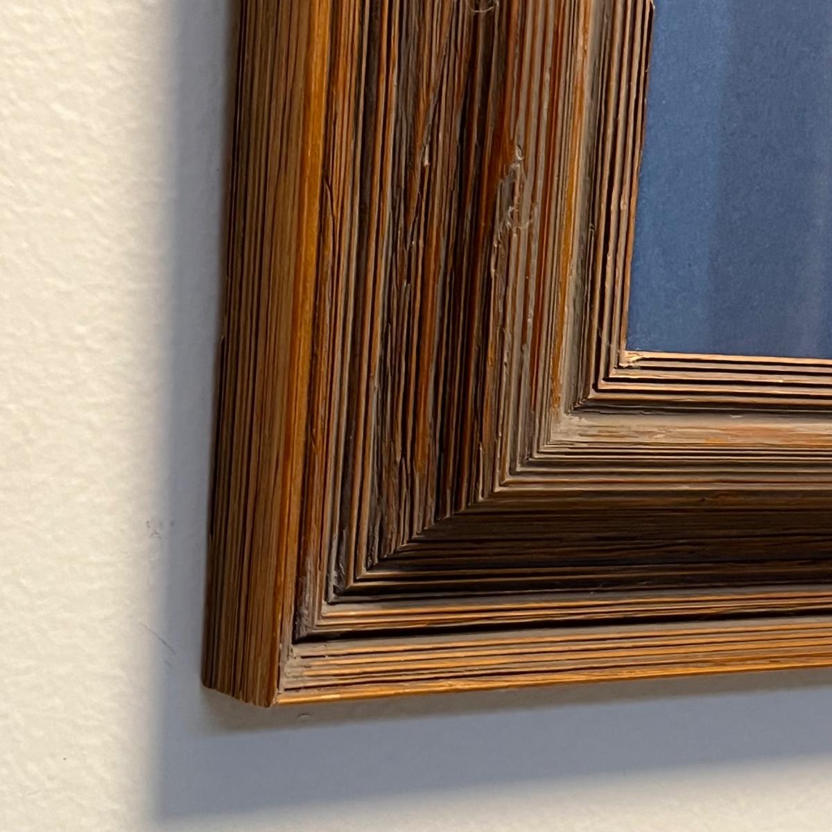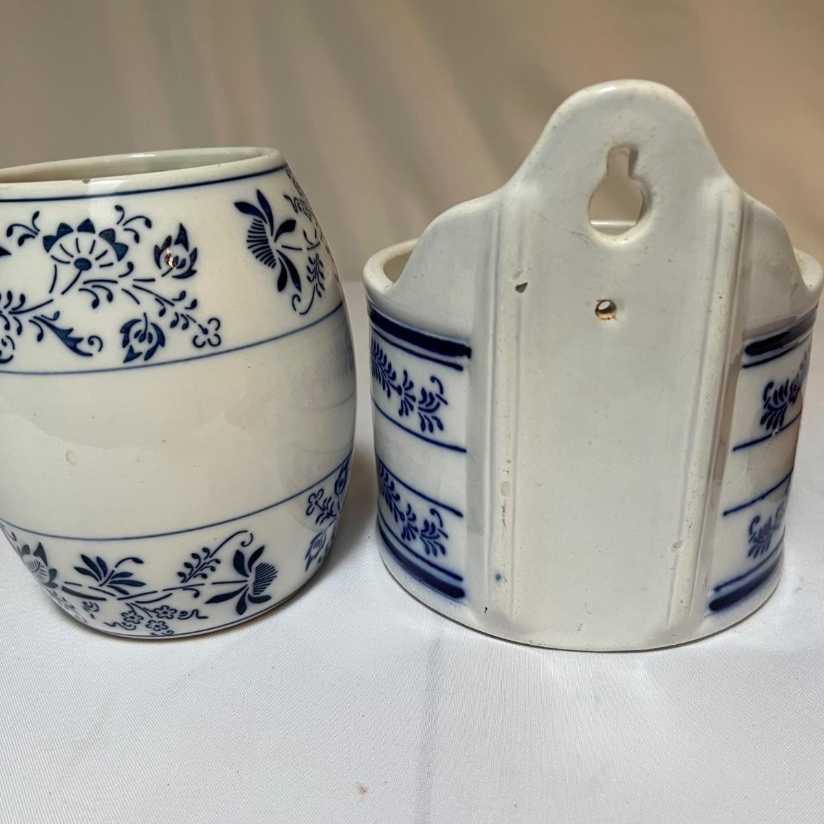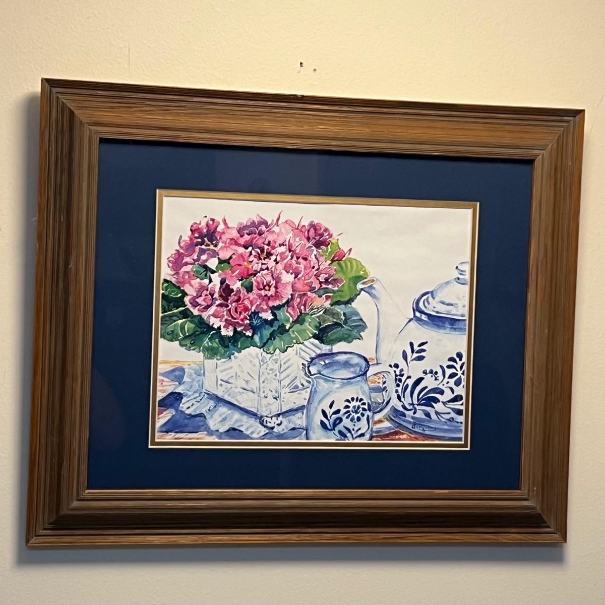 This framed piece of floral art is under glass, matted and mounted in a wooden frame; frame measures 22” x 2” x 19”H. It has a stamped signature; note the frame has a small nick, see image. The two canisters are ceramic with wooden tops. The salt container can be hung on the wall; note that it has a hairline crack which should not affect its