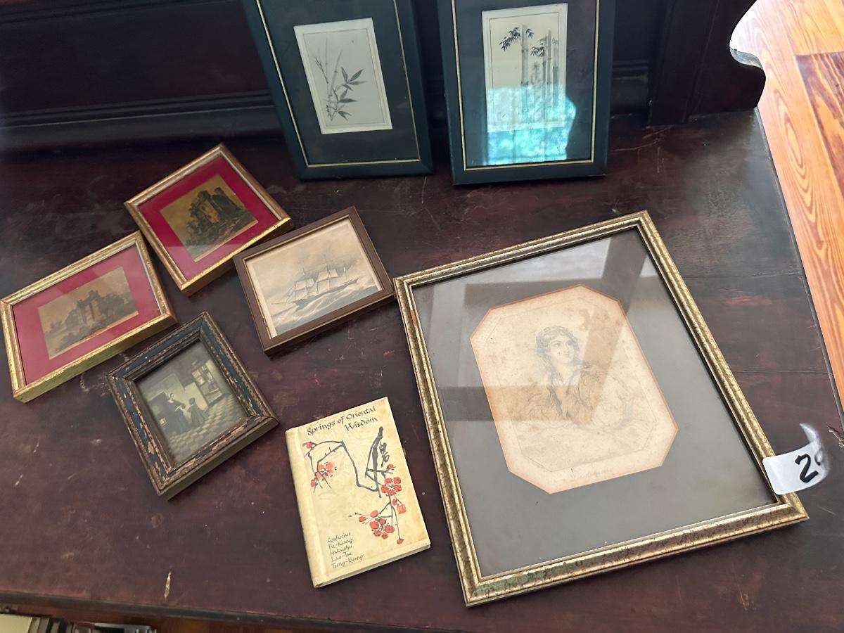 6 SMALL FRAMED PICTURES, 1800'S SKETCH & BOOK
