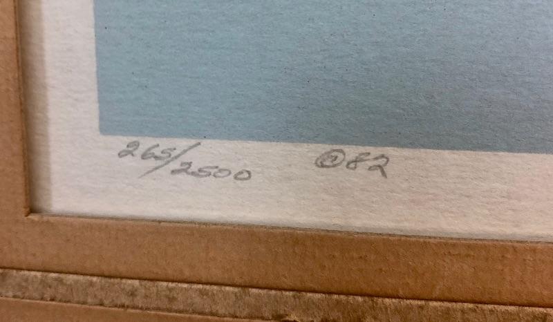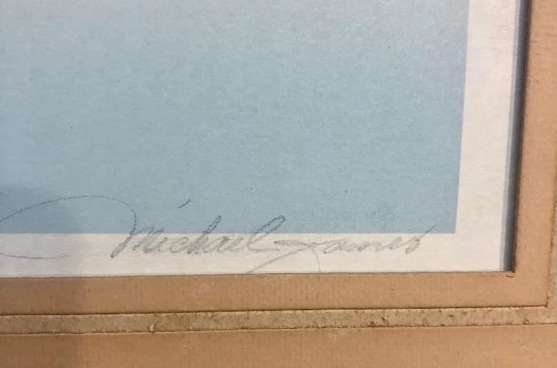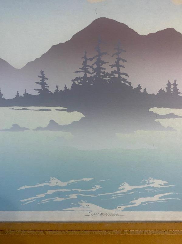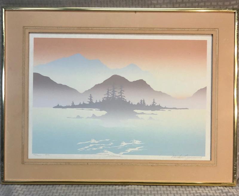 Framed, matted art of an island in the distance, covered with trees. Limited edition, numbered copy 265 of 2500, by Michael James.