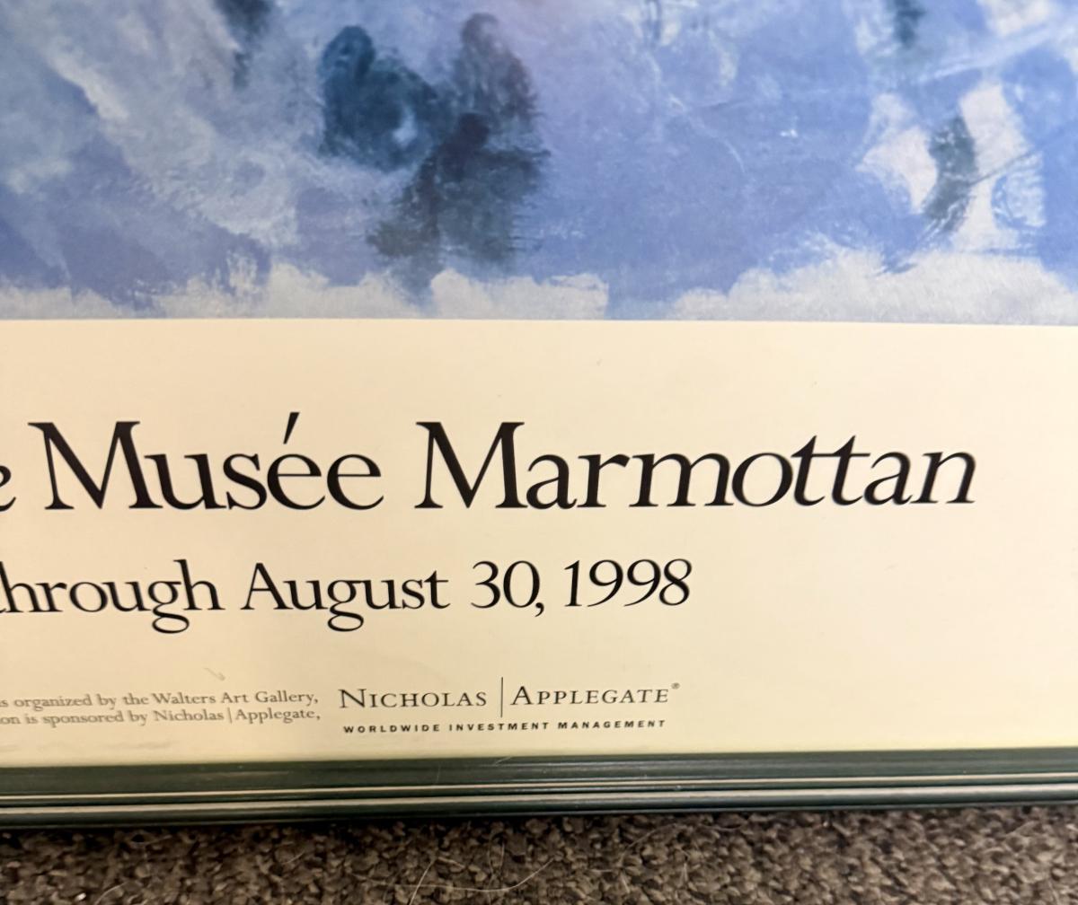This framed art print is for an exhibition of Claude Monet's paintings from the Musée Marmottan, held in San Diego in 1998. Good condition. Approx. 25" x 31".