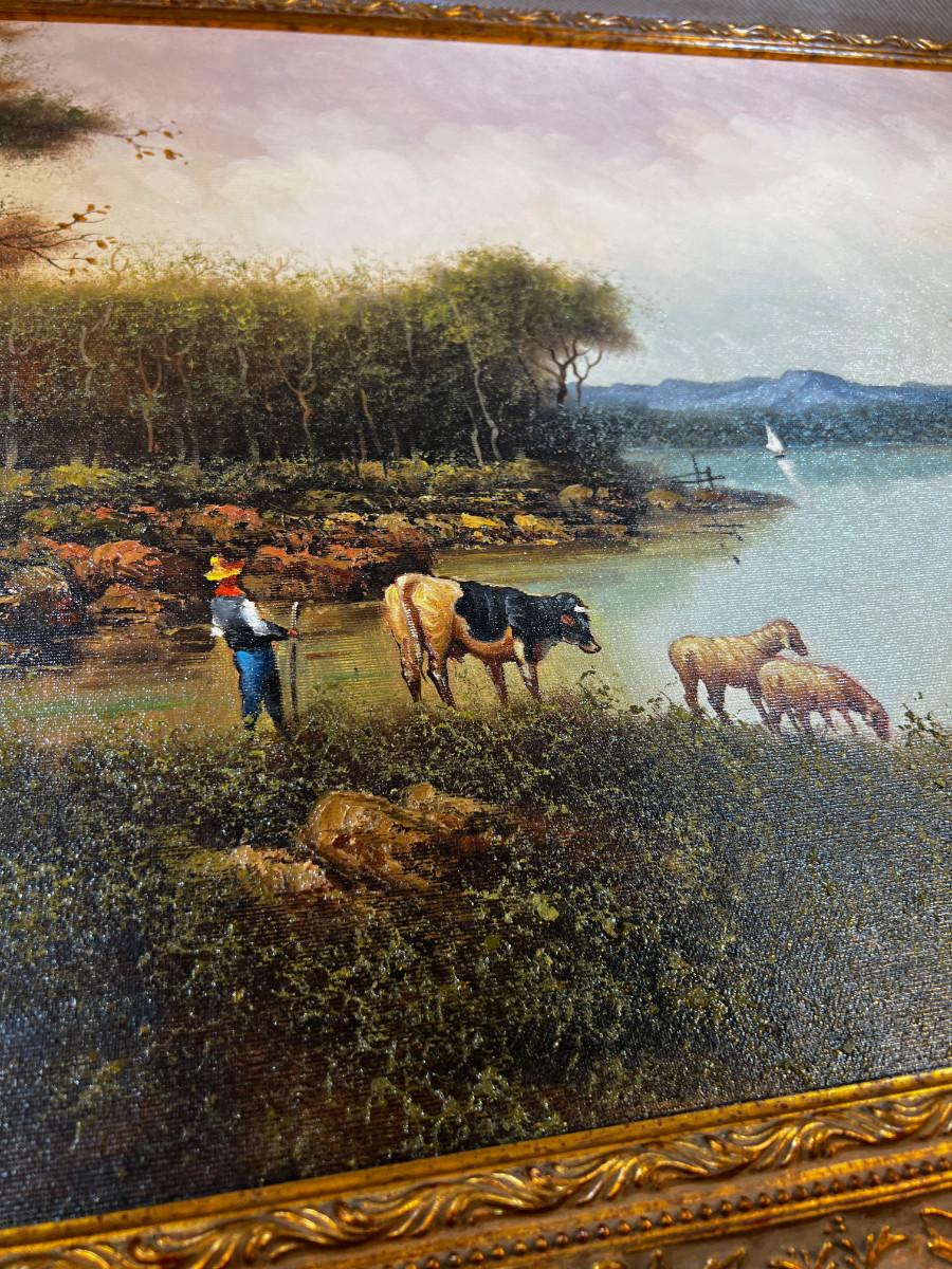Framed Art Print of Pastoral Scene pond with Farmer & Cow