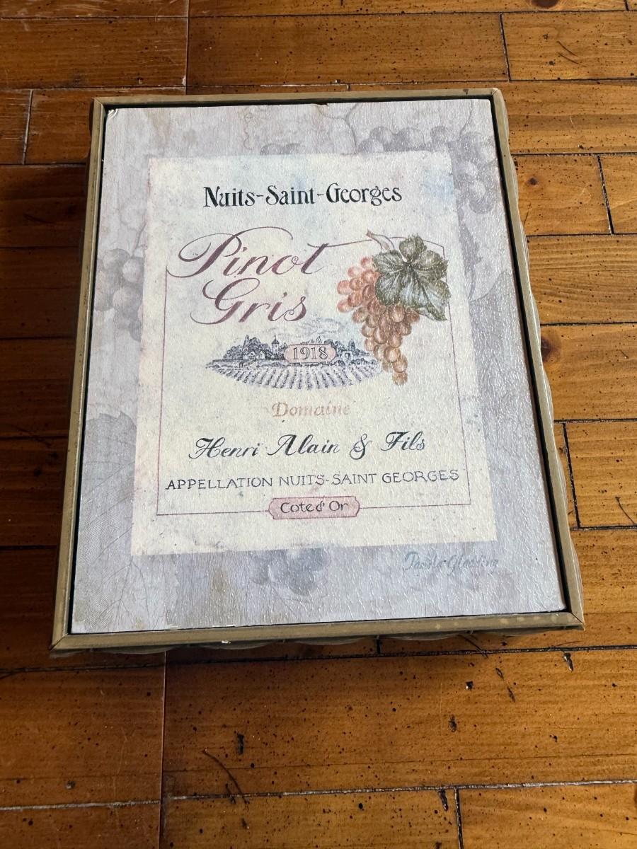 Framed textured art print styled as a vintage Pinot Gris wine label from Nuits-Saint-Georges, France. Rustic style, beige tones