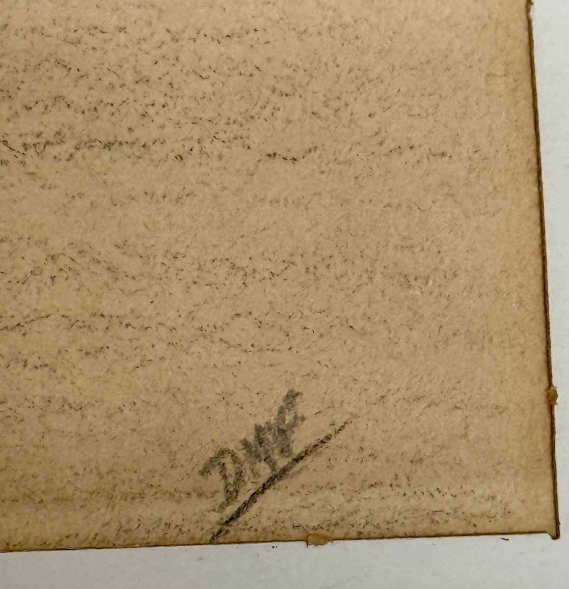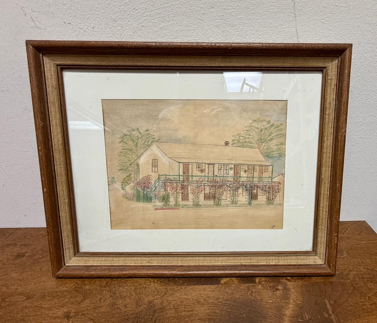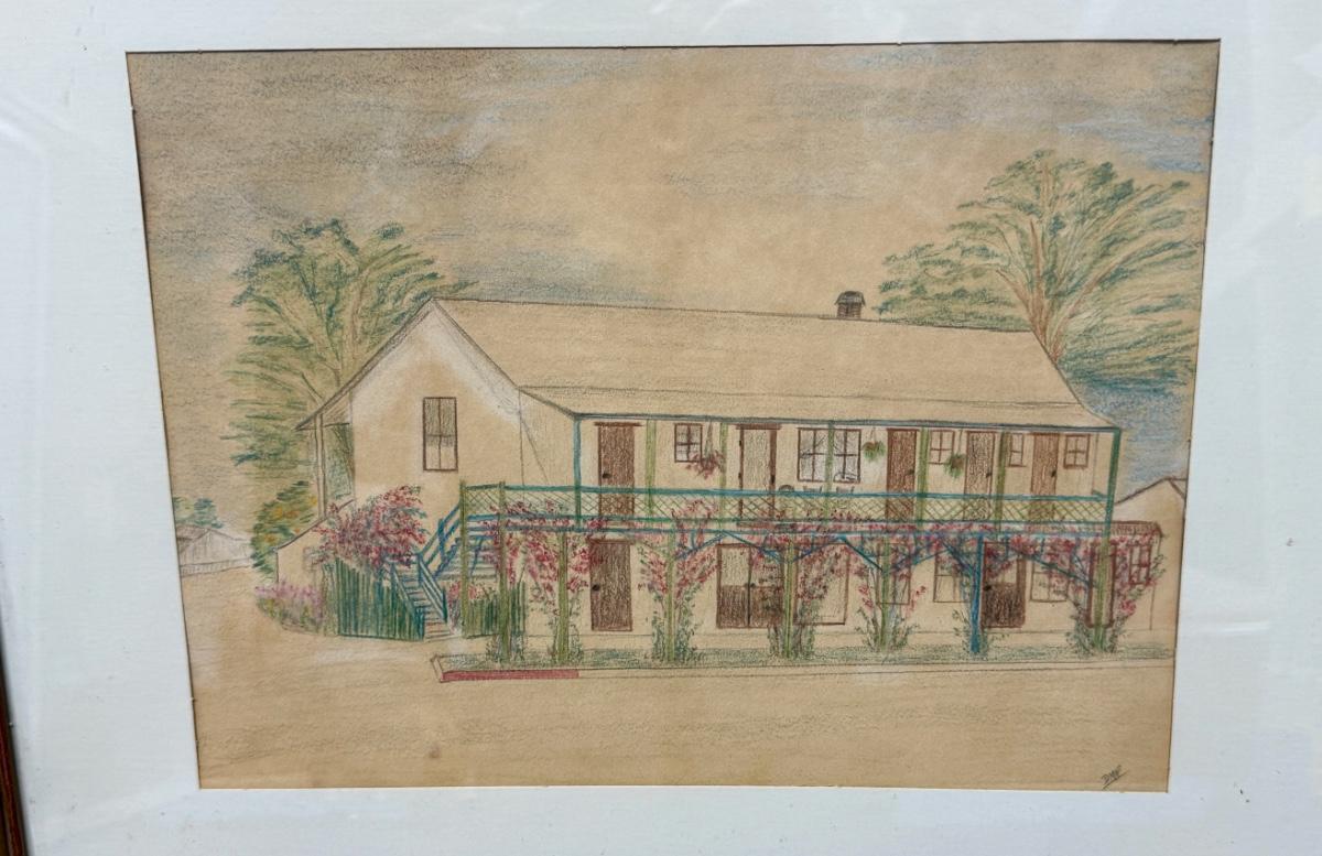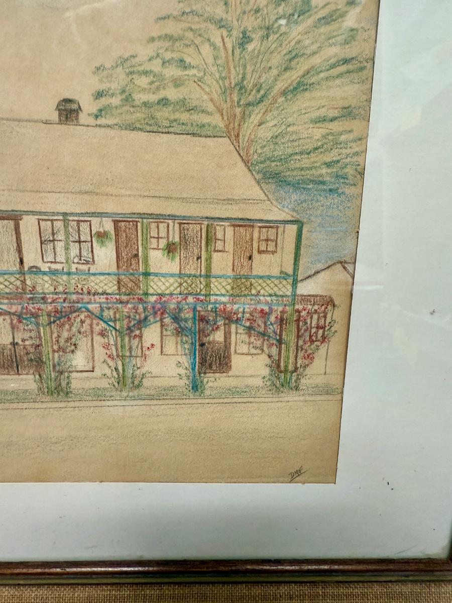 The image shows a framed colored pencil drawing of a building, possibly a house or inn, with an attached porch or veranda. Maybe the Pilot House in New Orleans, or early building in San Juan Capistrano CA, or Spain.