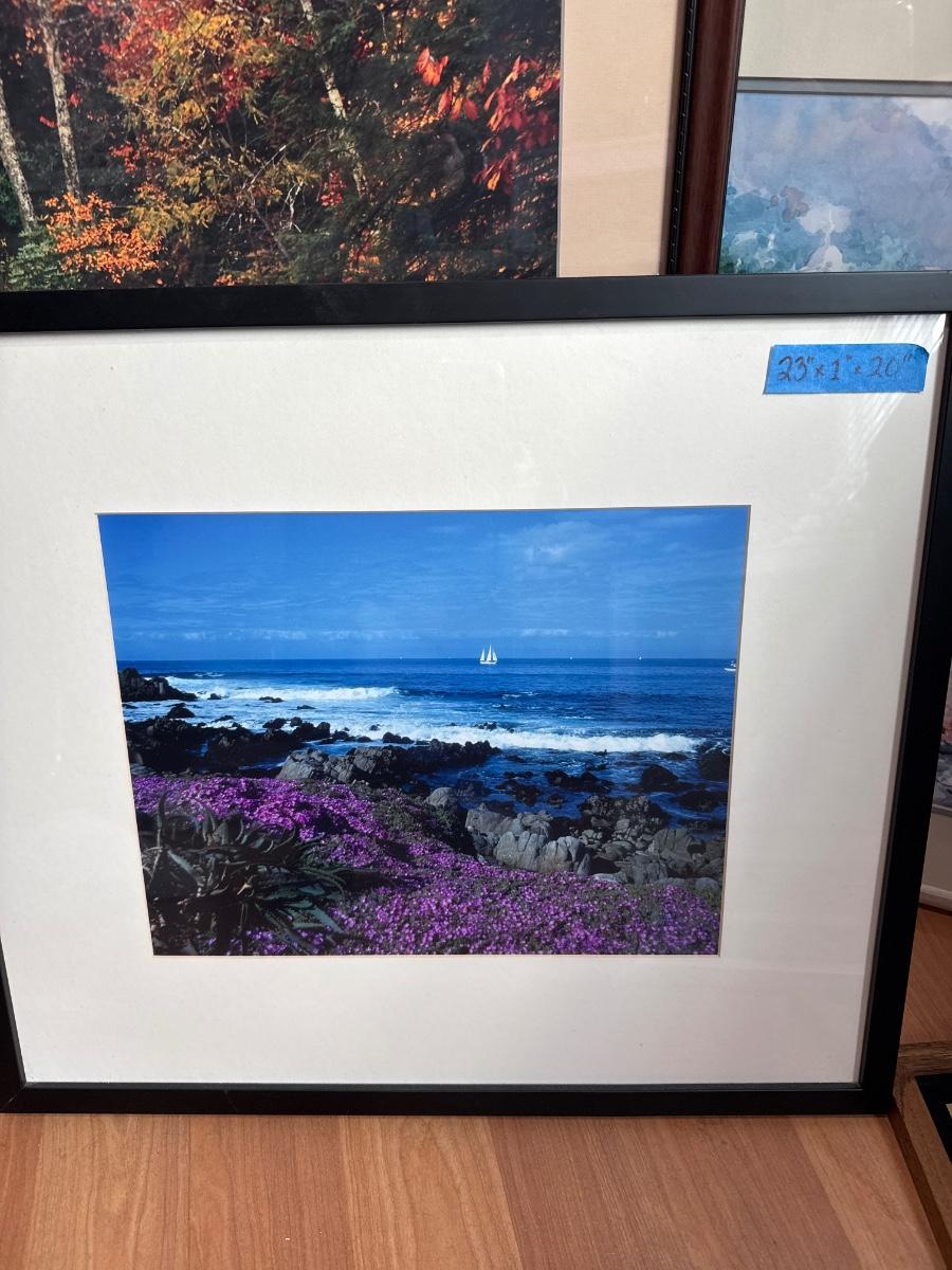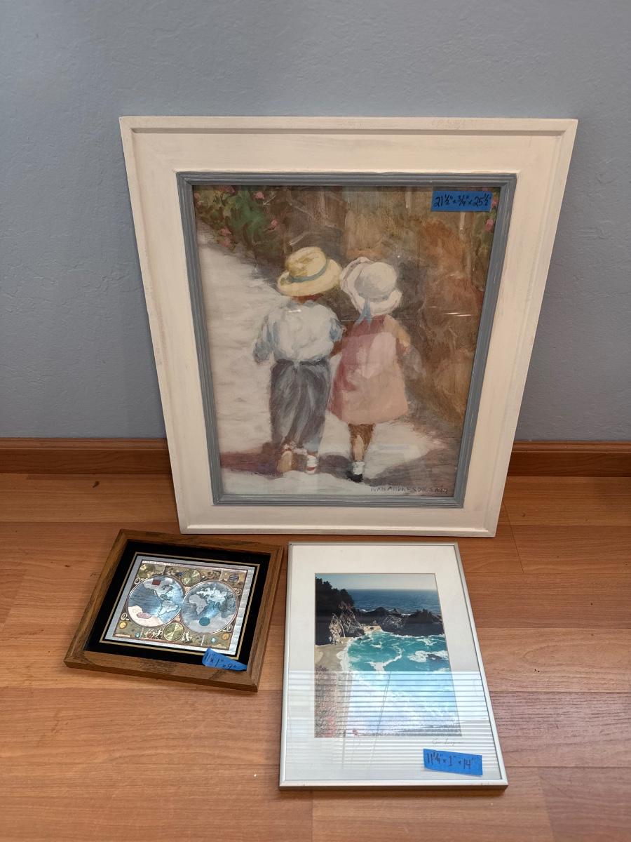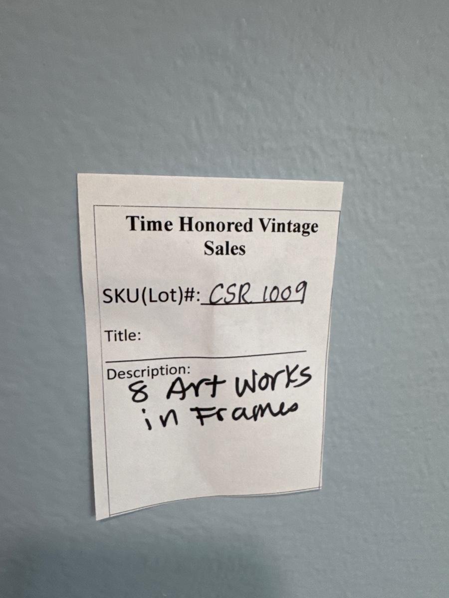Eight artworks, one mounted canvas print, all in good condition, no shipping
