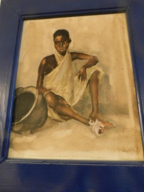 Framed Art Young African Man with Kettle Signed by Artist 16"x19"