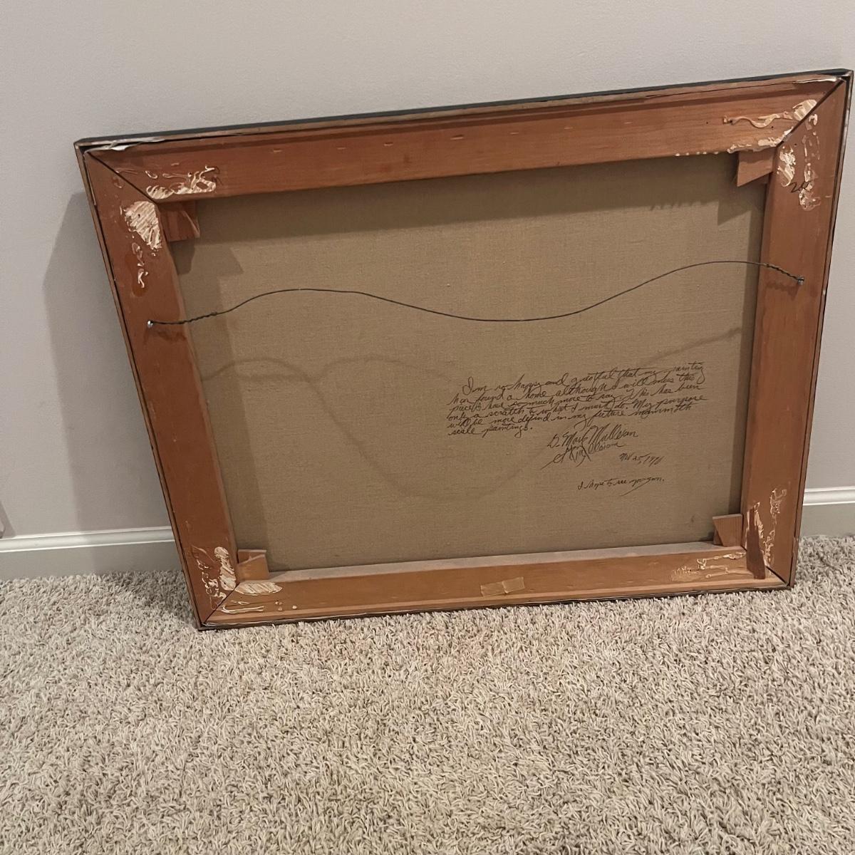 Lot includes a wooden framed print that is signed and has further Artist information and signatures on the back, see pictures. Frame measures 24” x 30”.
