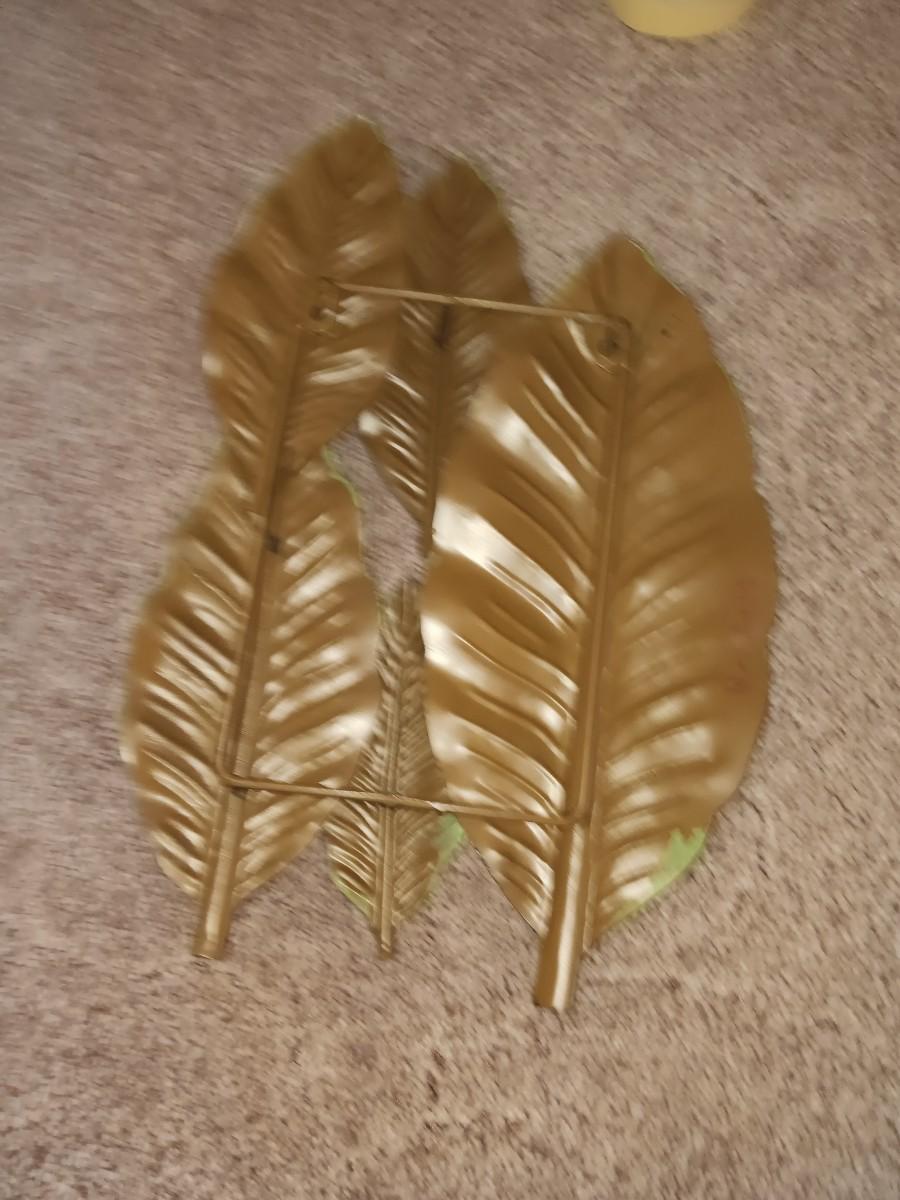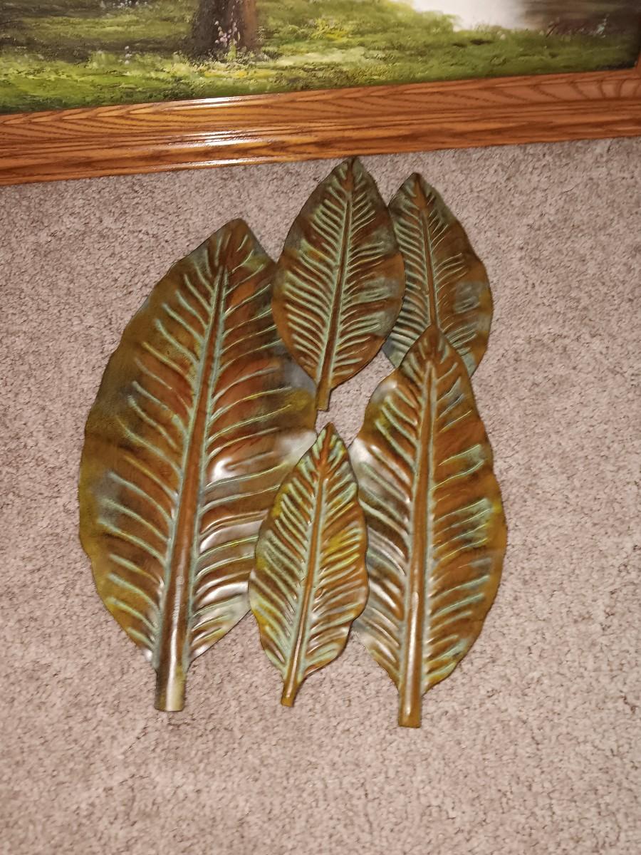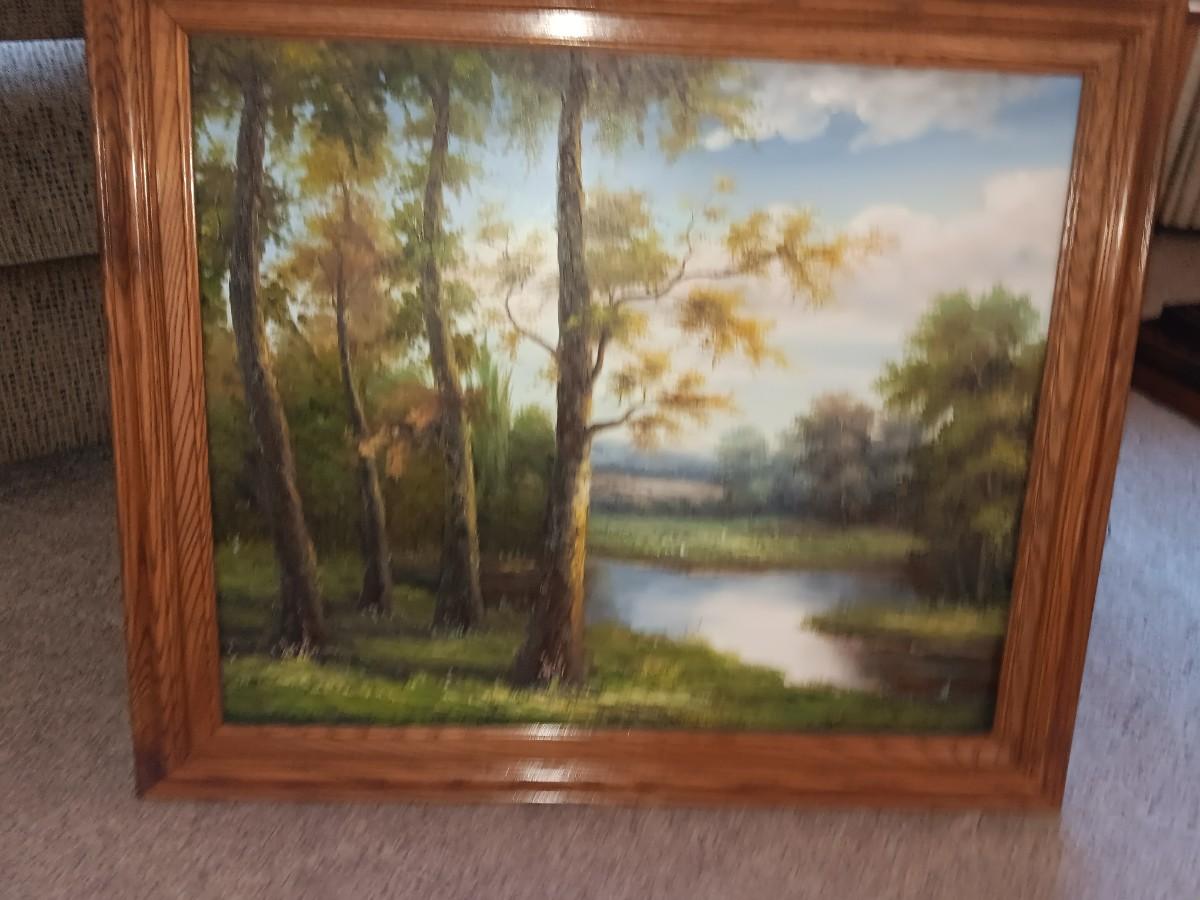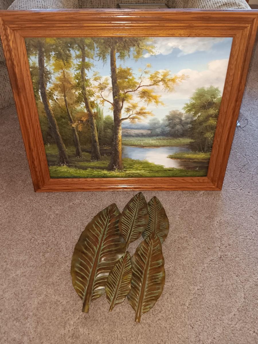 NICE FRAMED ARTWORK OF WOODS AND RIVER WITH METAL WALL ART LEAVES
