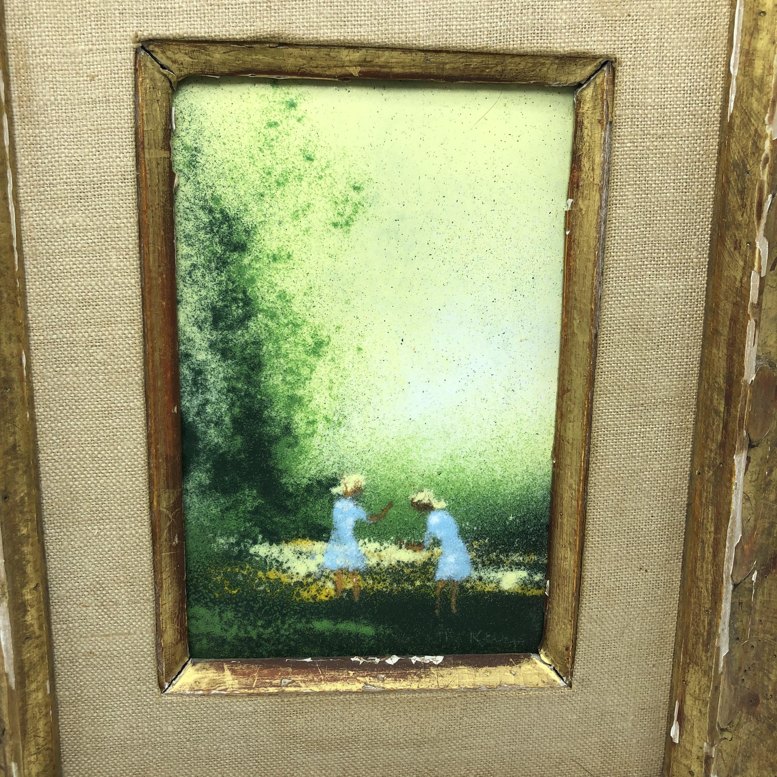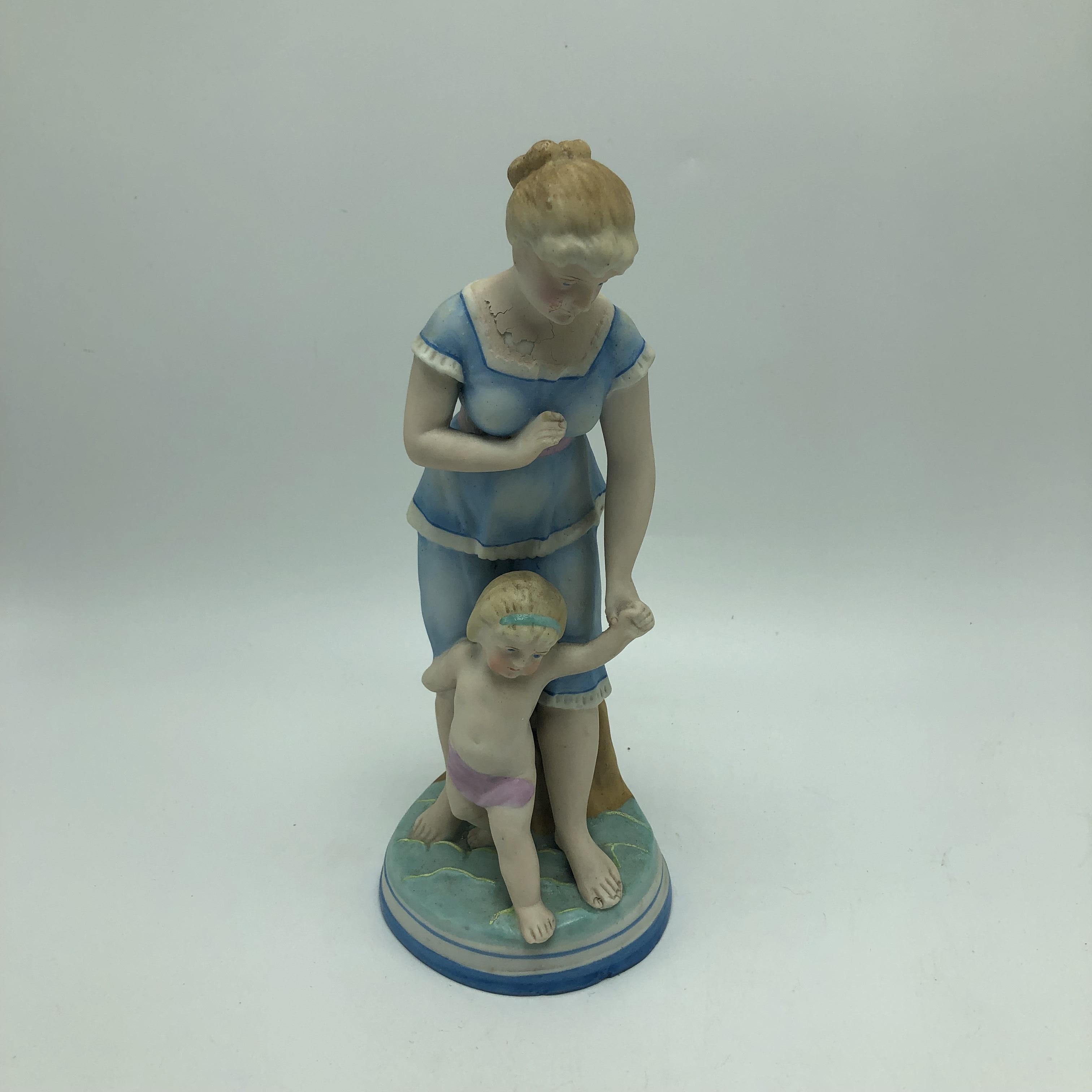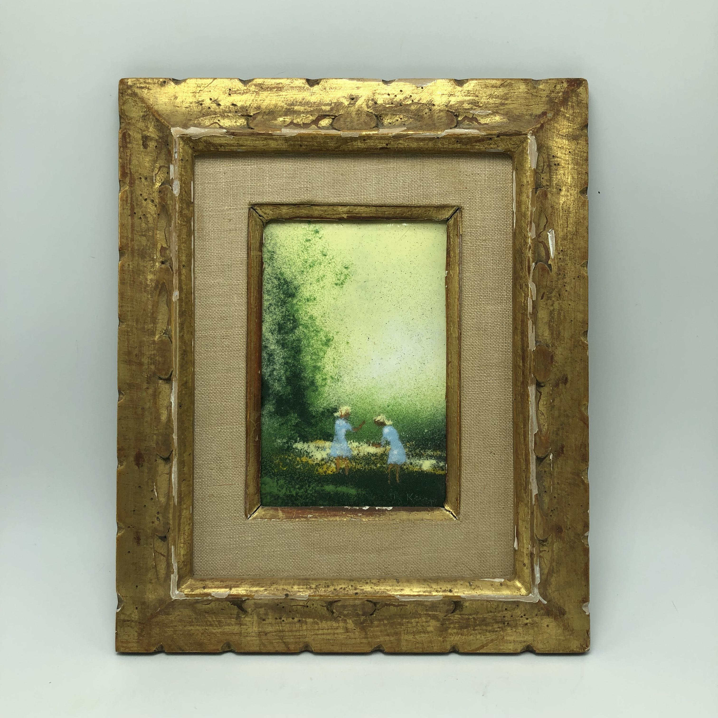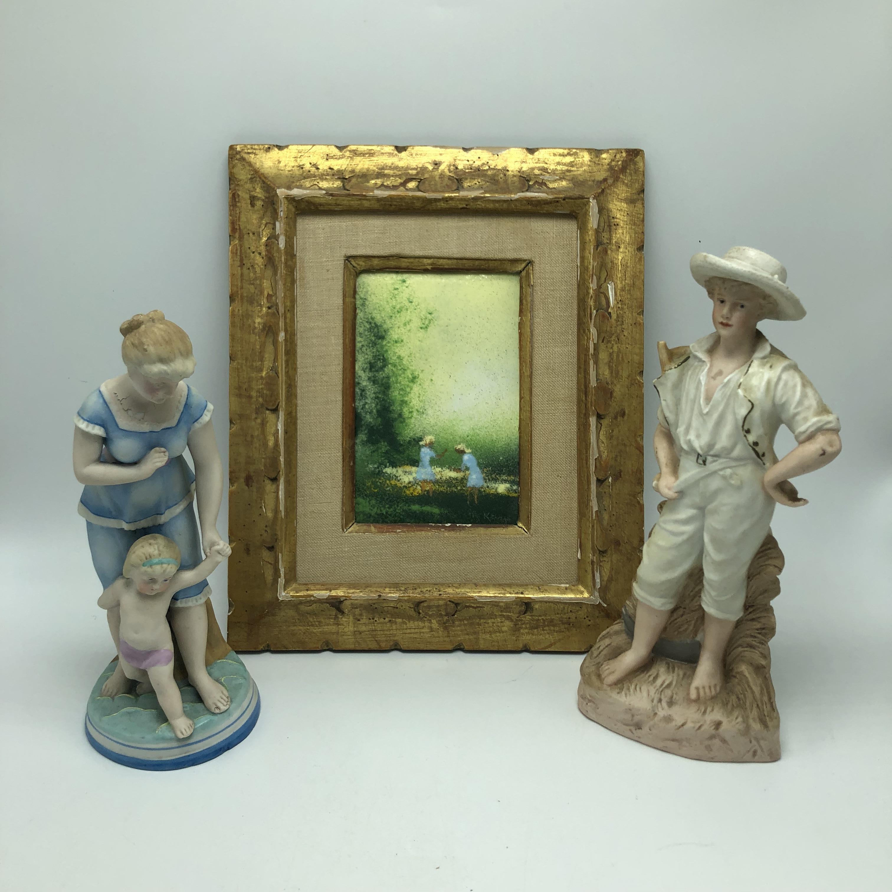 Lot includes a signed and framed painting on metal with a wooden frame, a ceramic figurine of a man and a ceramic figurine of a woman and child.