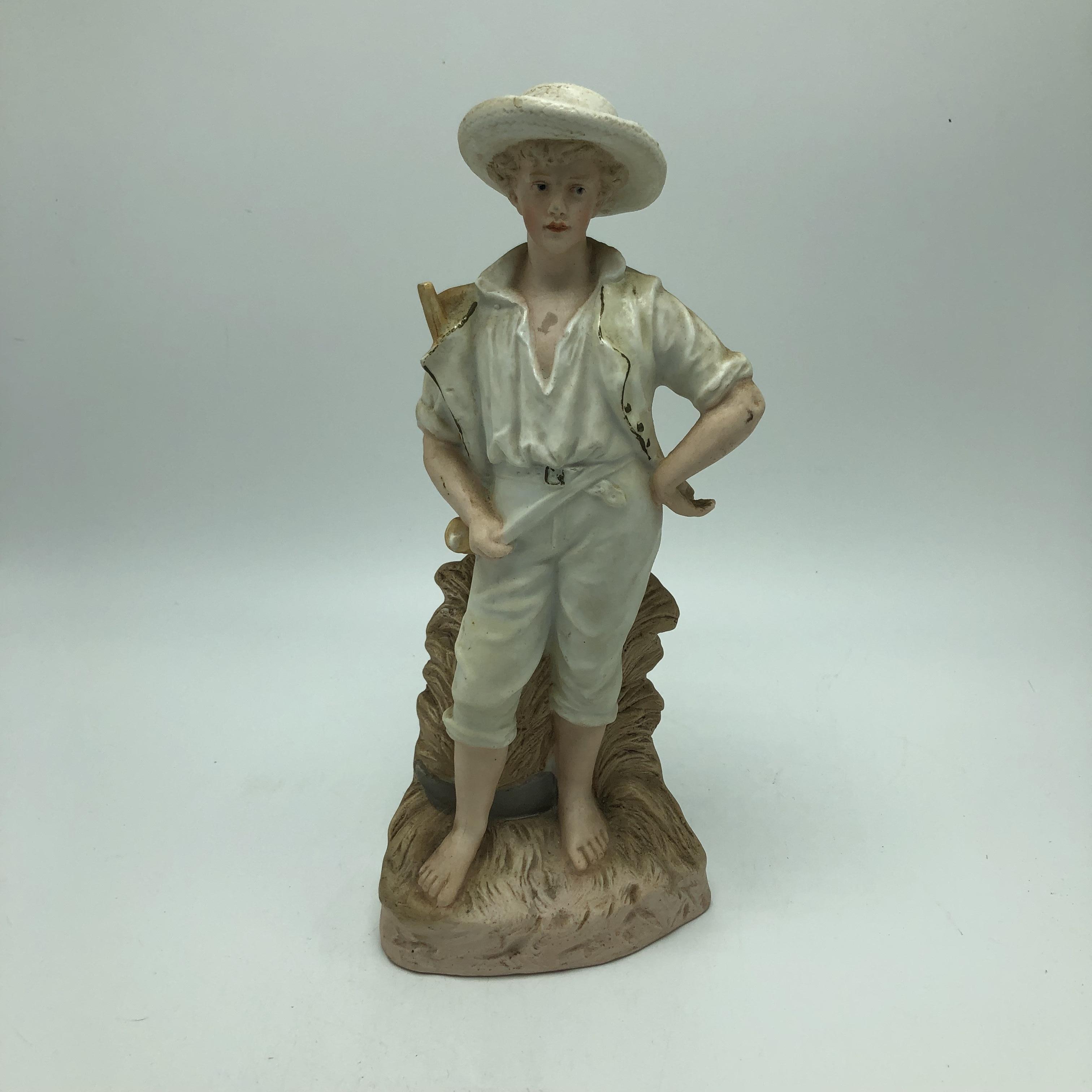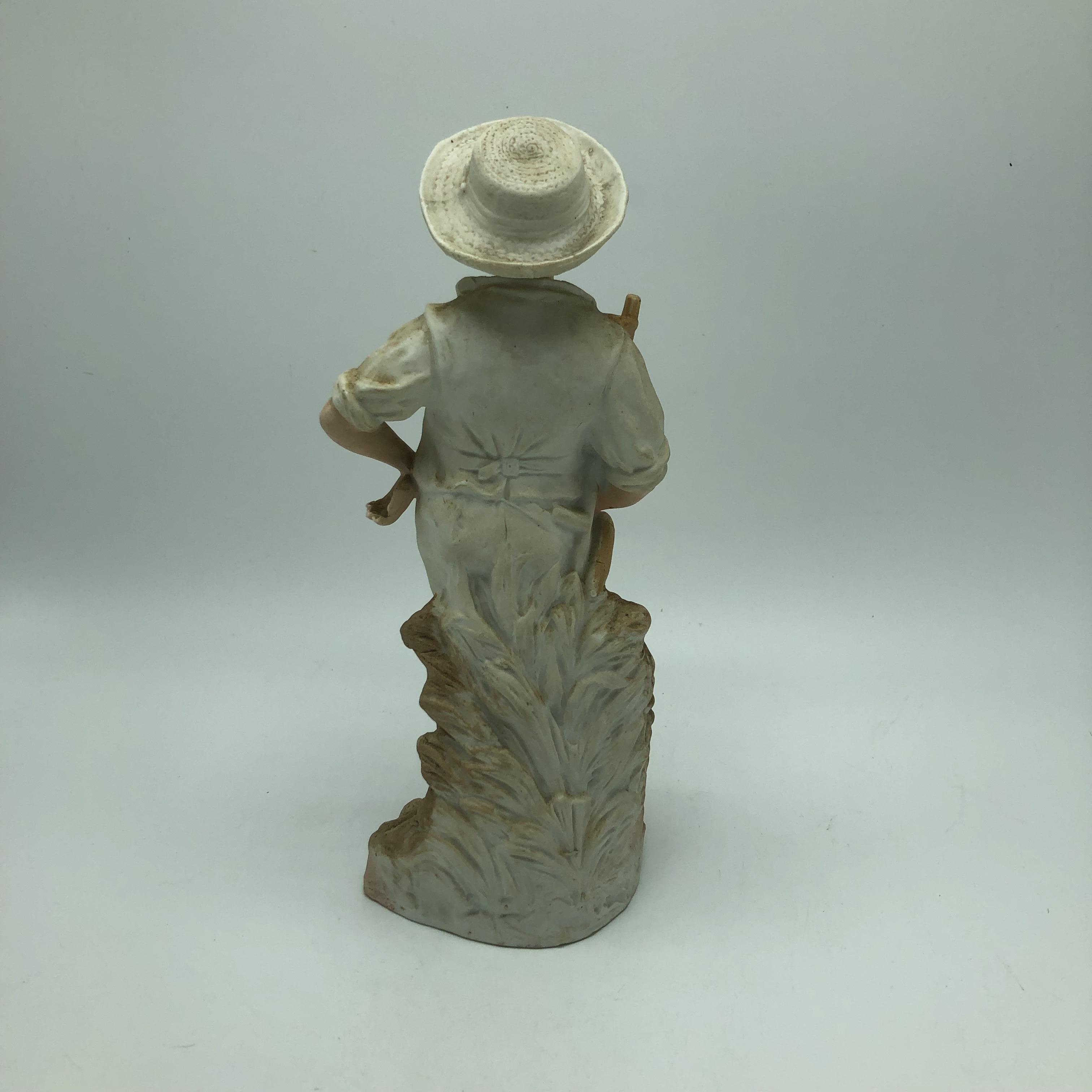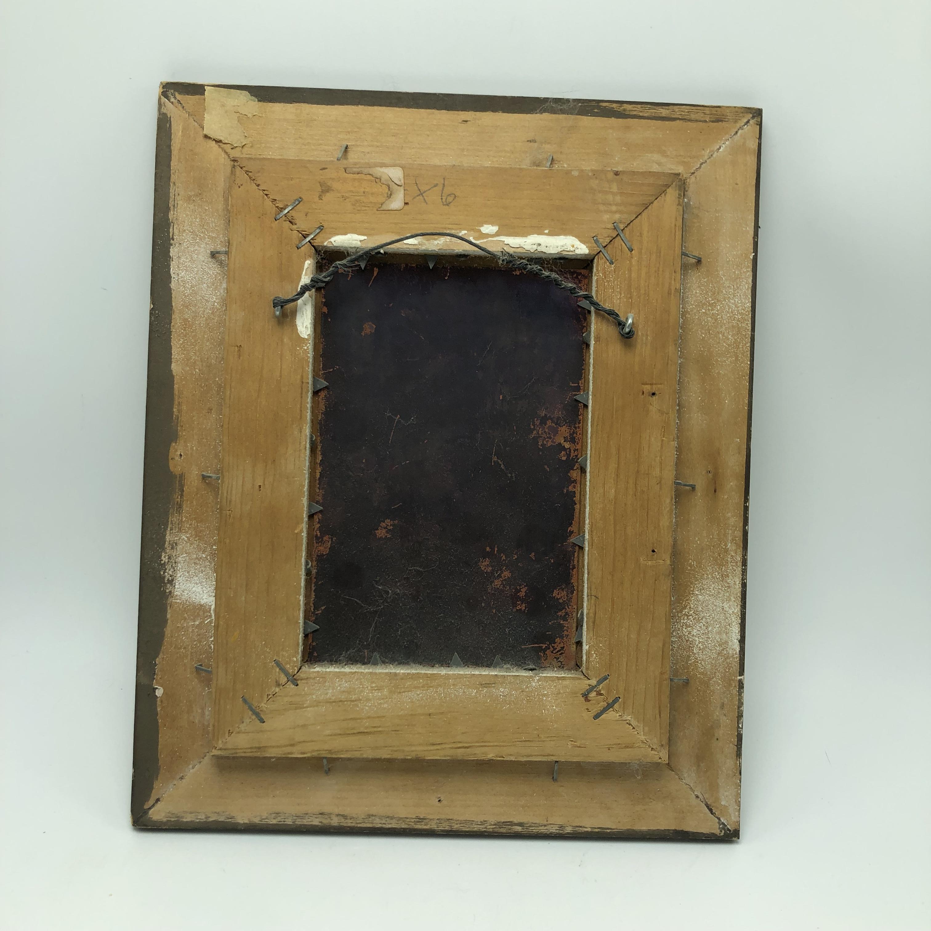 Lot includes a signed and framed painting on metal with a wooden frame, a ceramic figurine of a man and a ceramic figurine of a woman and child.