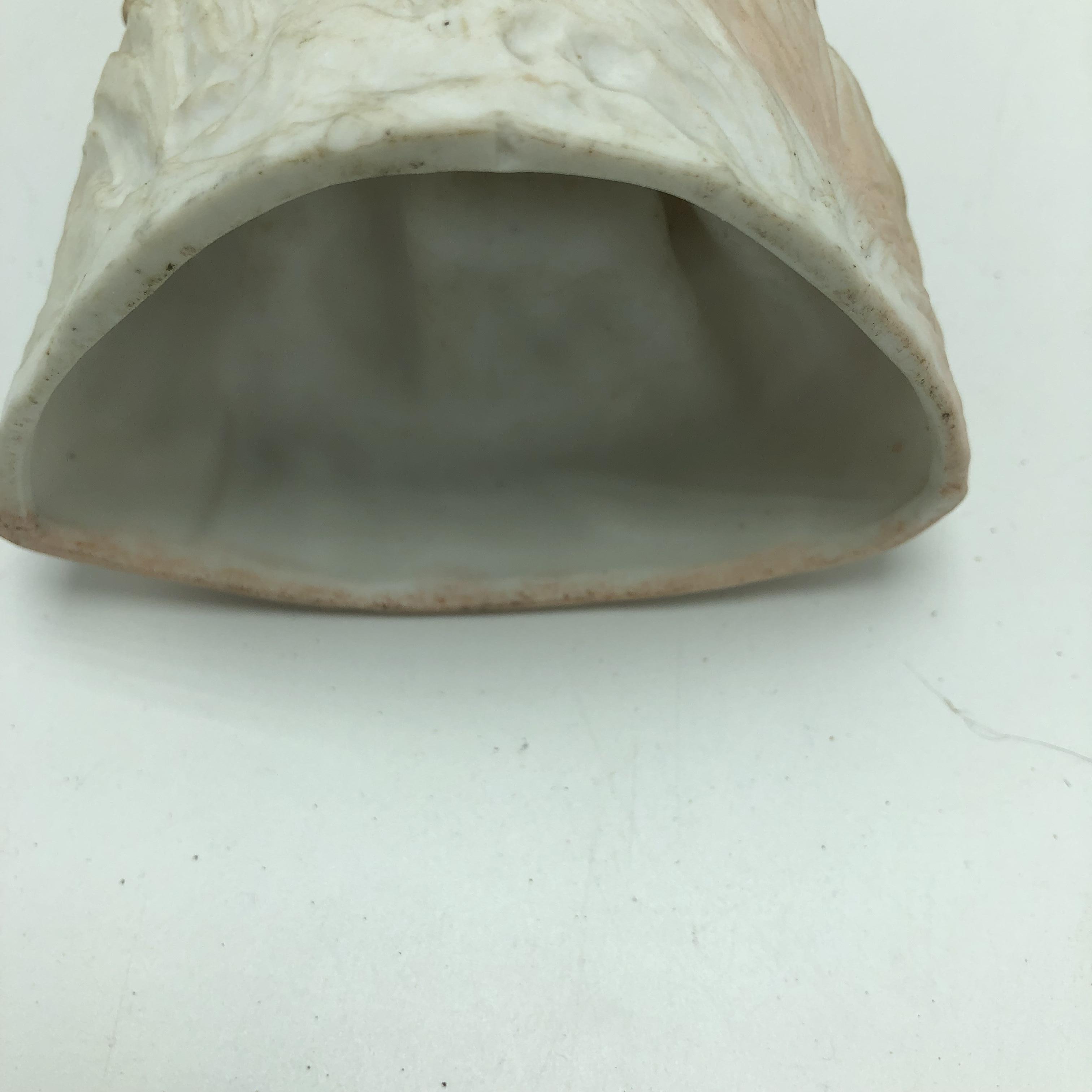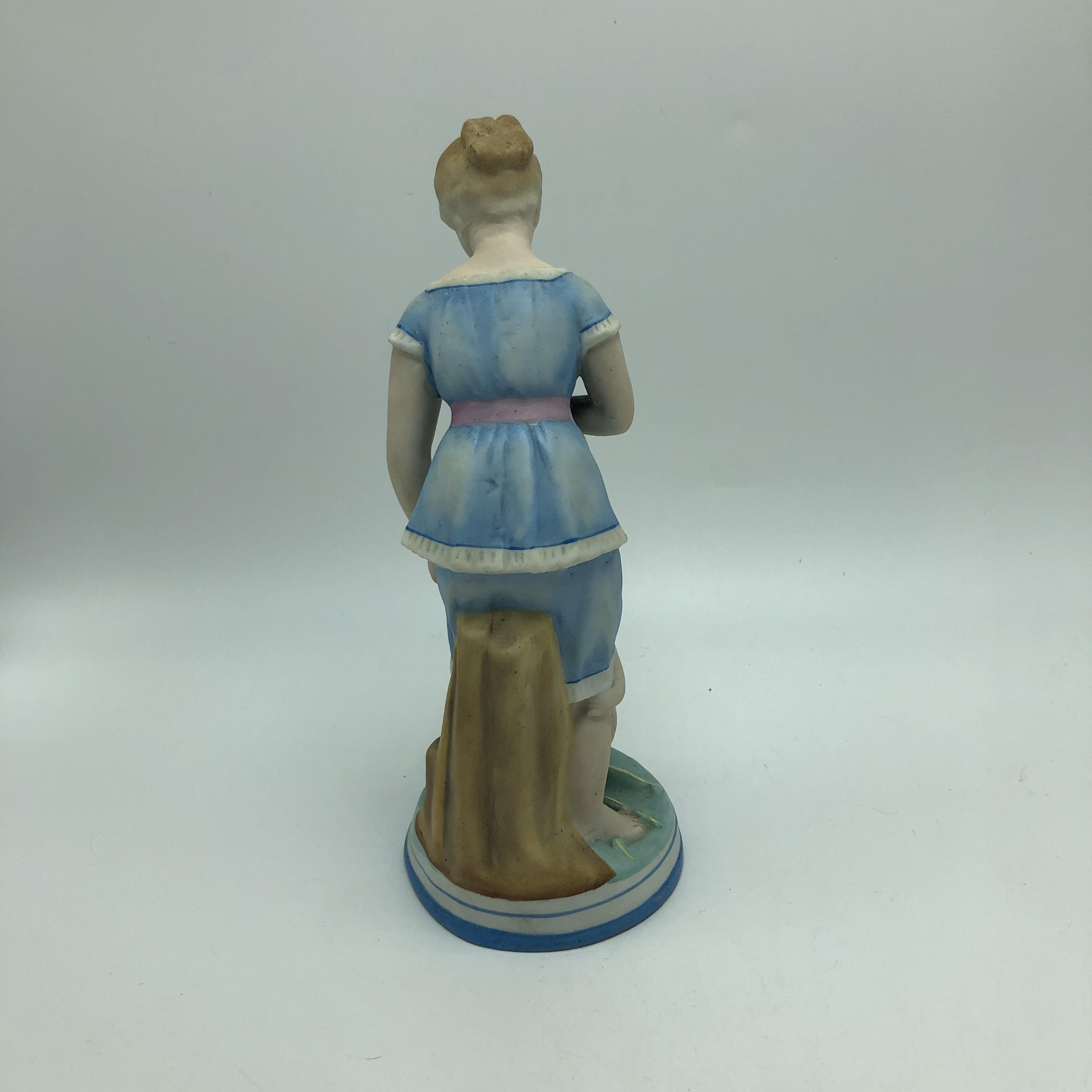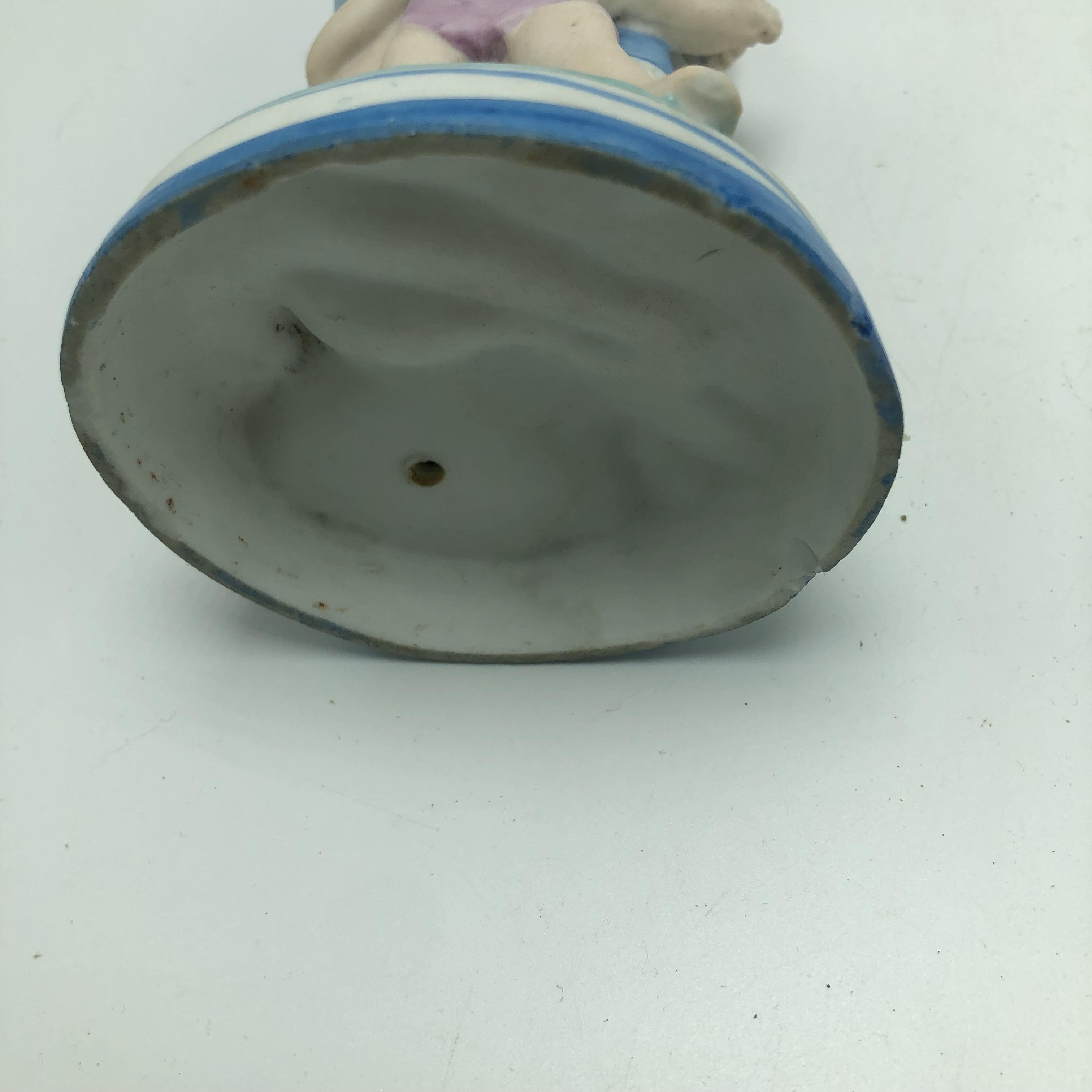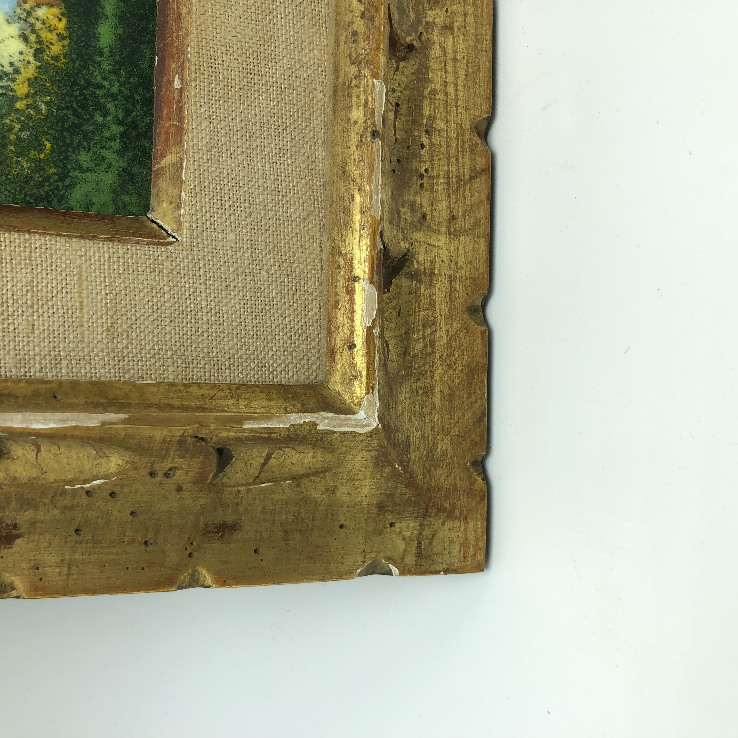 Lot includes a signed and framed painting on metal with a wooden frame, a ceramic figurine of a man and a ceramic figurine of a woman and child.
